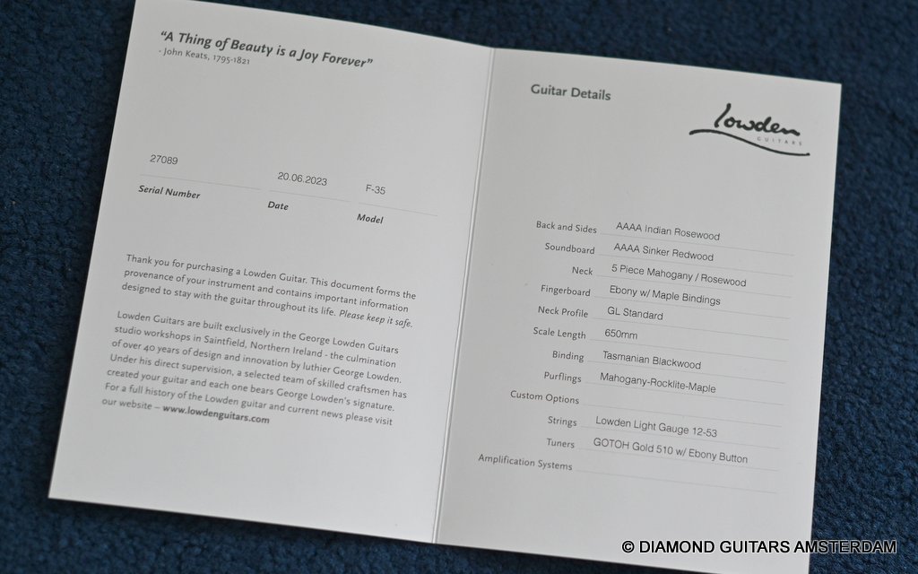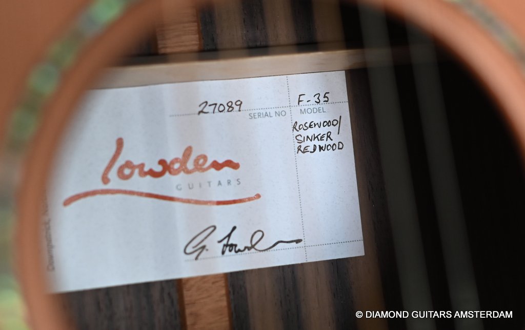 Awesome Lowden F35 build with Indian Rosewood combined with a beautiful Sinker Redwood top. This combination of fine tonewood delivers a rich and open sounding guitar with tremendous sustain and lots of overtones.