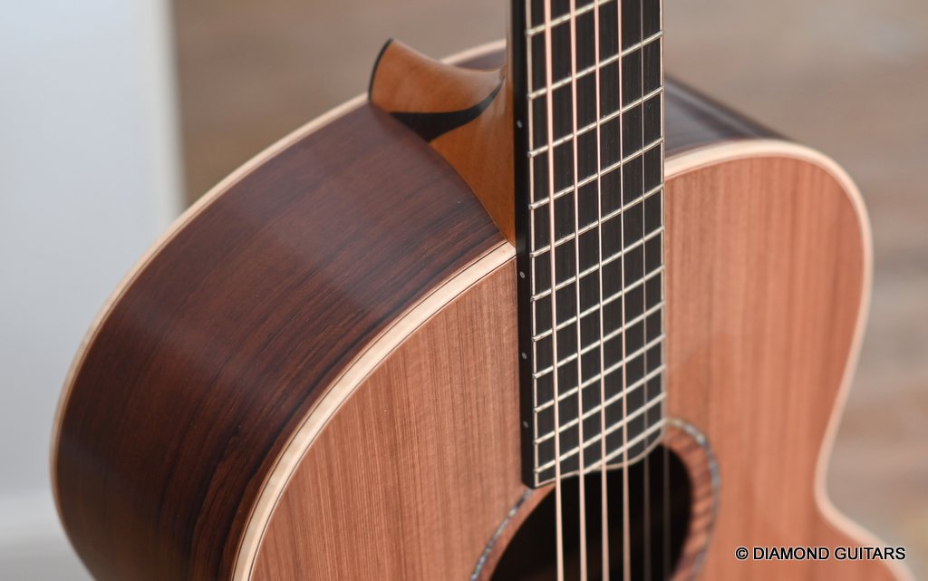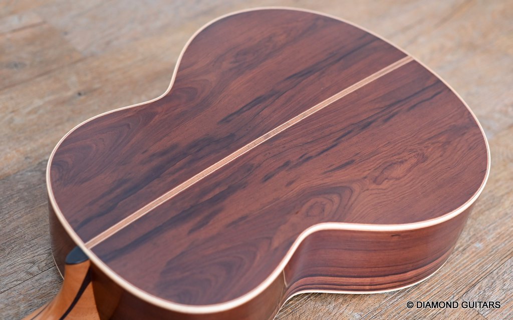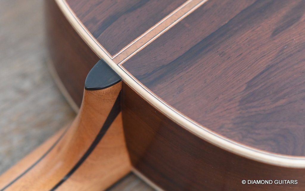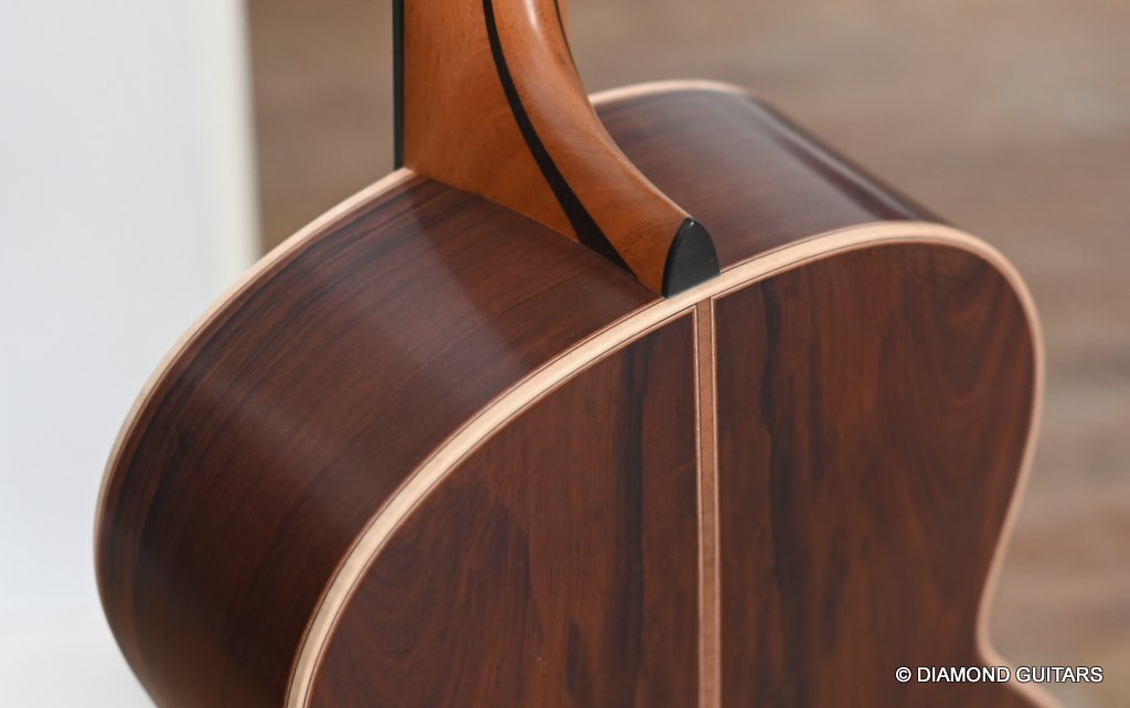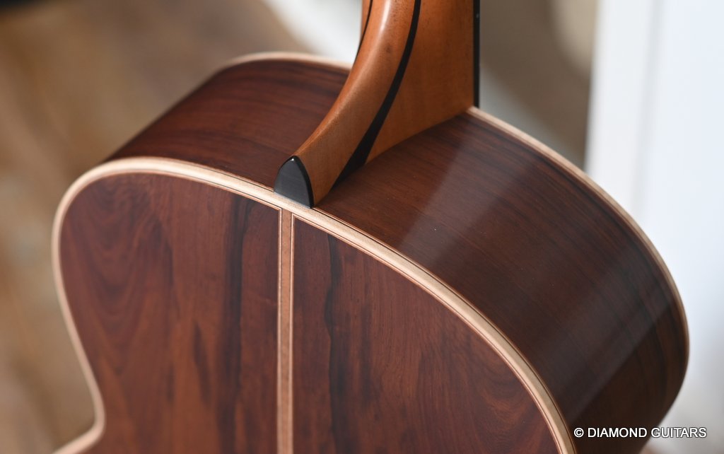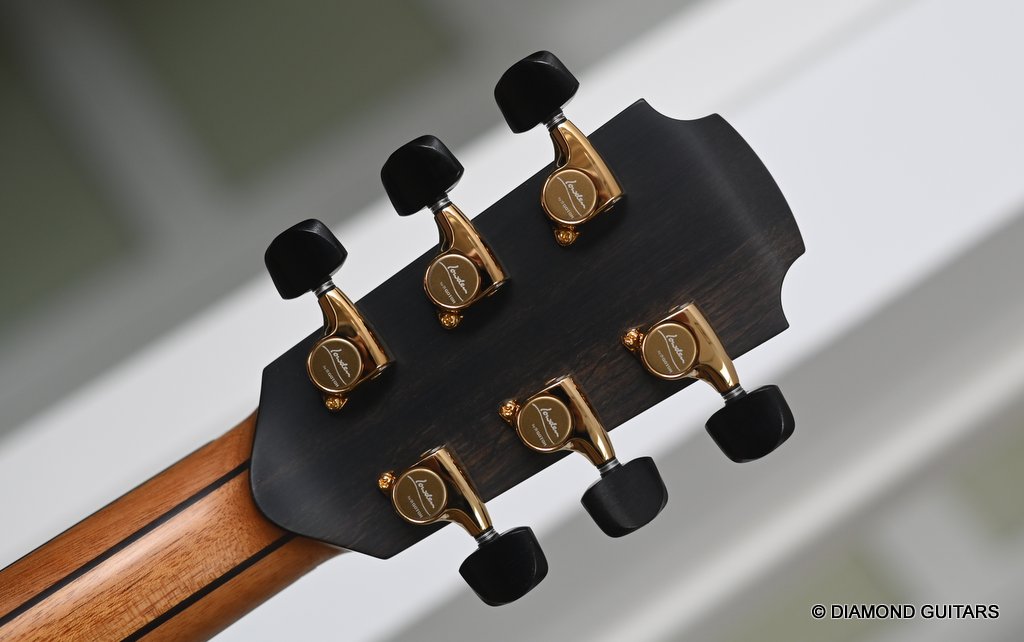 The classy figured Sinker Redwood gives her a classy look. The top is made from Mastergrade Sinker Redwood. These tops typically display a rich optical spectrum as the result of colors uniquely imparted from silt and the mineral-rich water. The age and size of these trees translates into a tight grain with nice cross-grain stiffness and offers a fairly bold response, with a brilliance complemented by warm overtones similar to Cedar but with extra brightness and headroom. Sinker Redwood trees originate from California and are often 1000 to 2000-year-old. These trees are only used when they have fallen naturally. The ‘Sinker’ designations tells you it’s been hidden under the mus on the banks of the Californian rivers for at least 100 year. Combined with the mastergrade Rosewood set, she gives you an instrument that excels in every way.