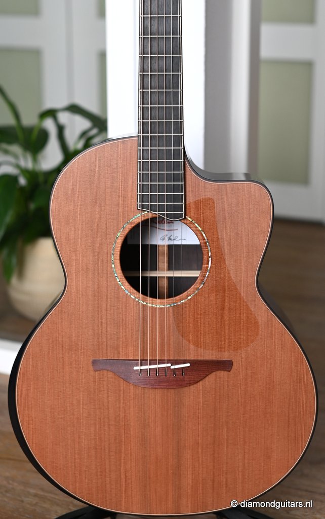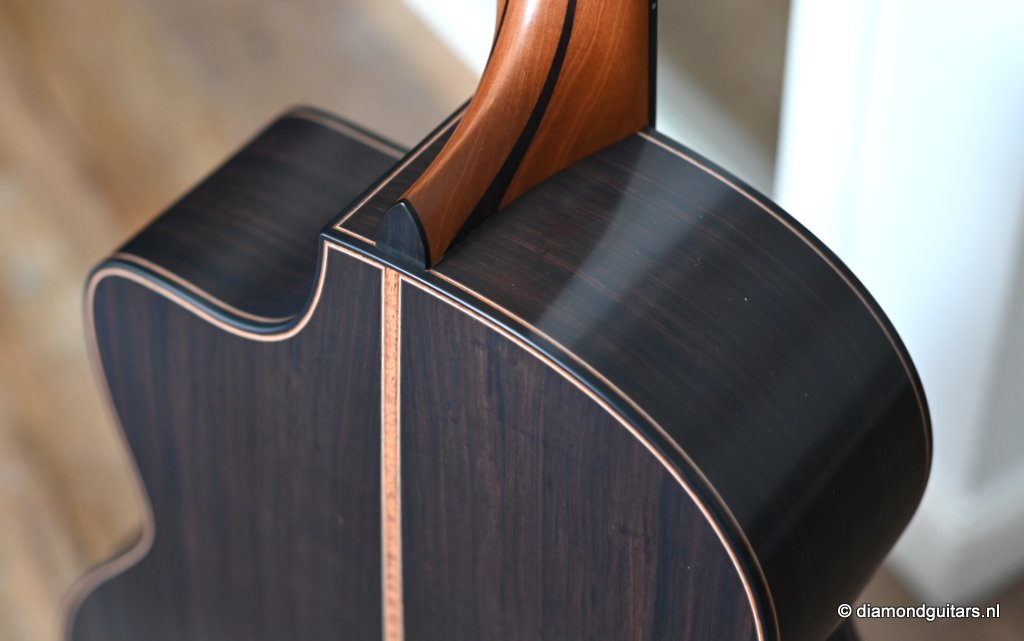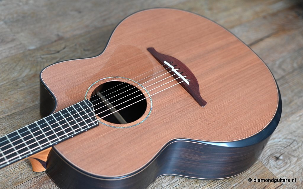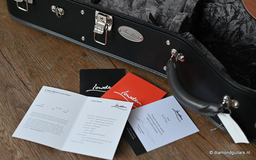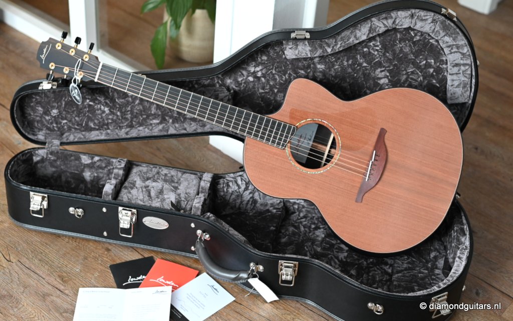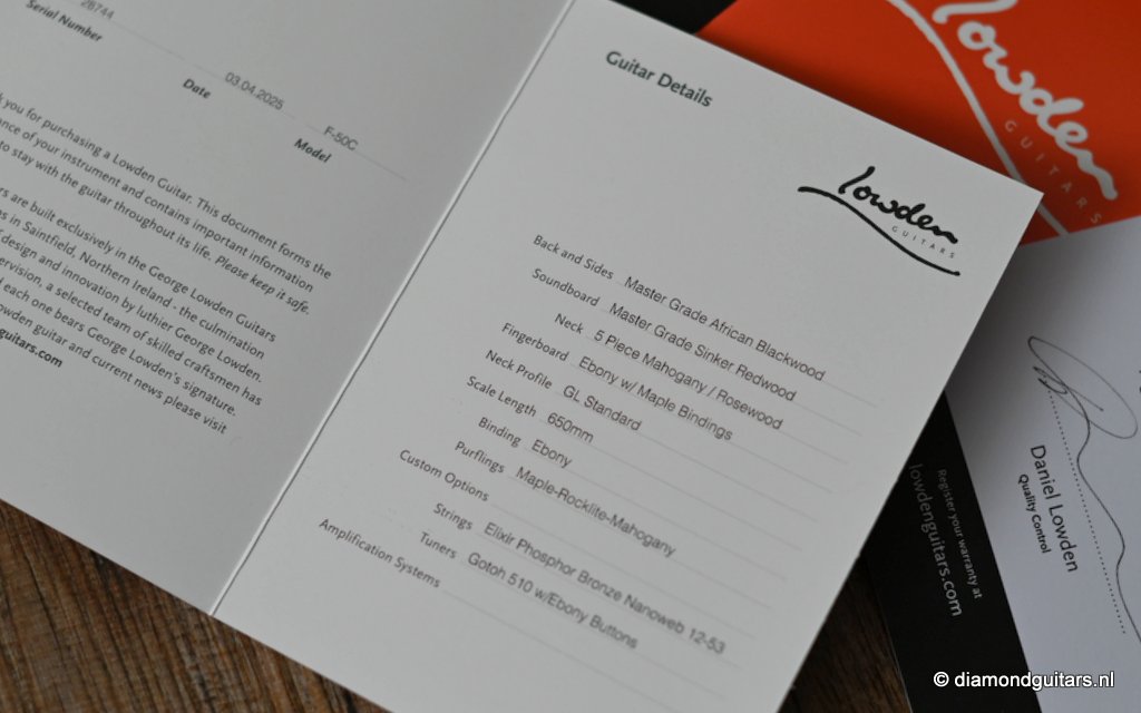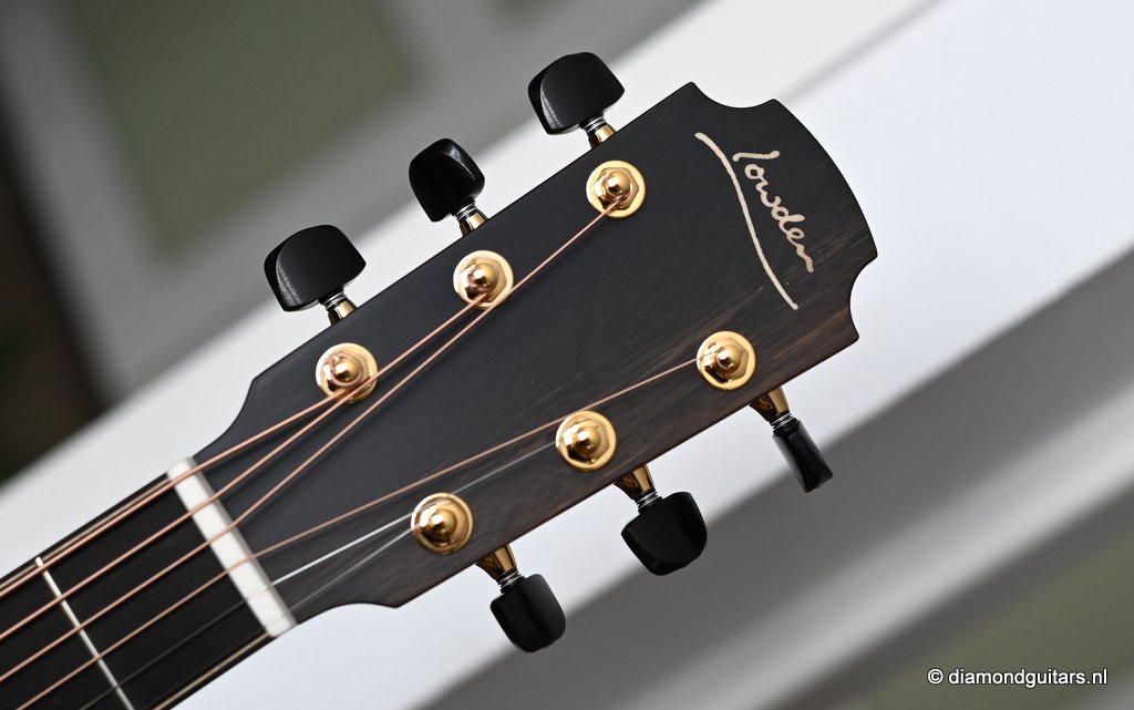 Elegant Lowden F50c African Blackwood combined with Sinker Redwood is George Lowden‘s favorite wood combination. Astonishing instrument with soundbox bevel and cutaway. Grand guitar, displaying the typical Lowden understatement.