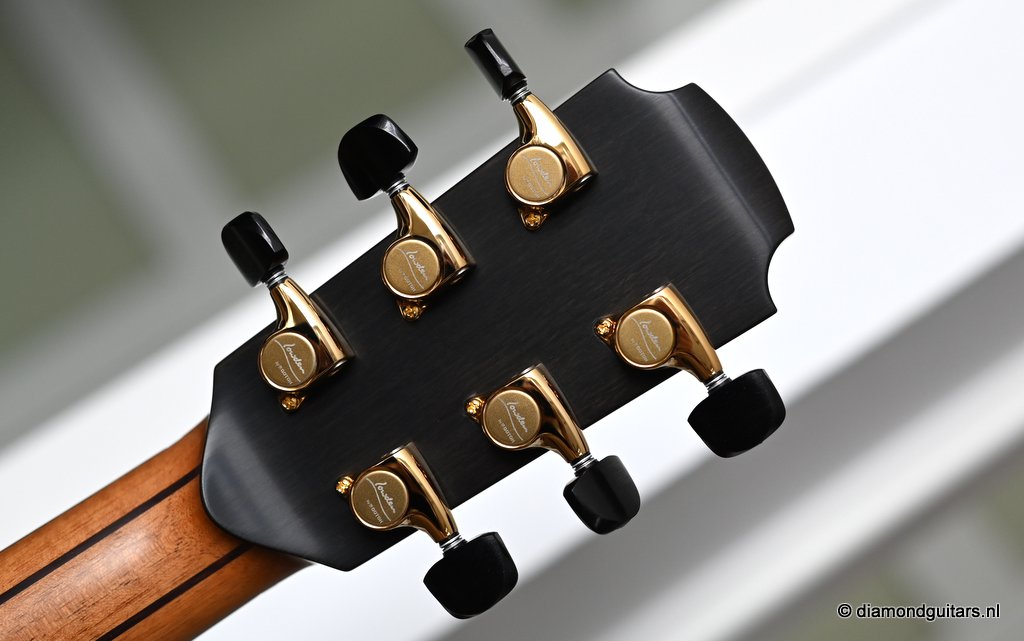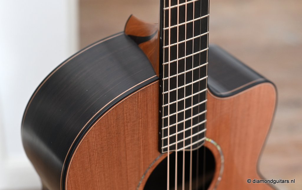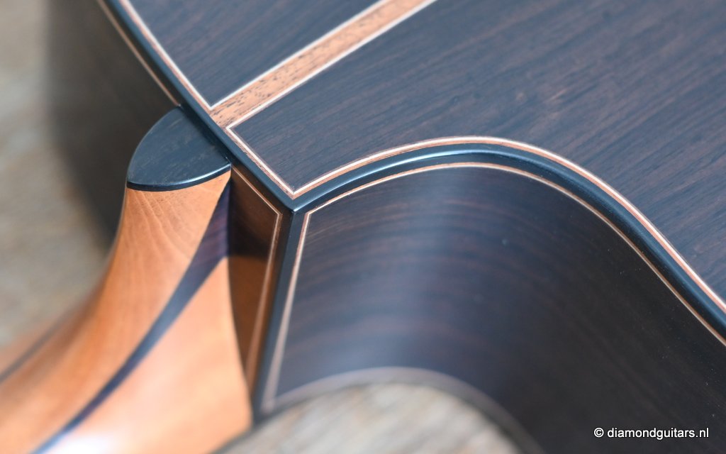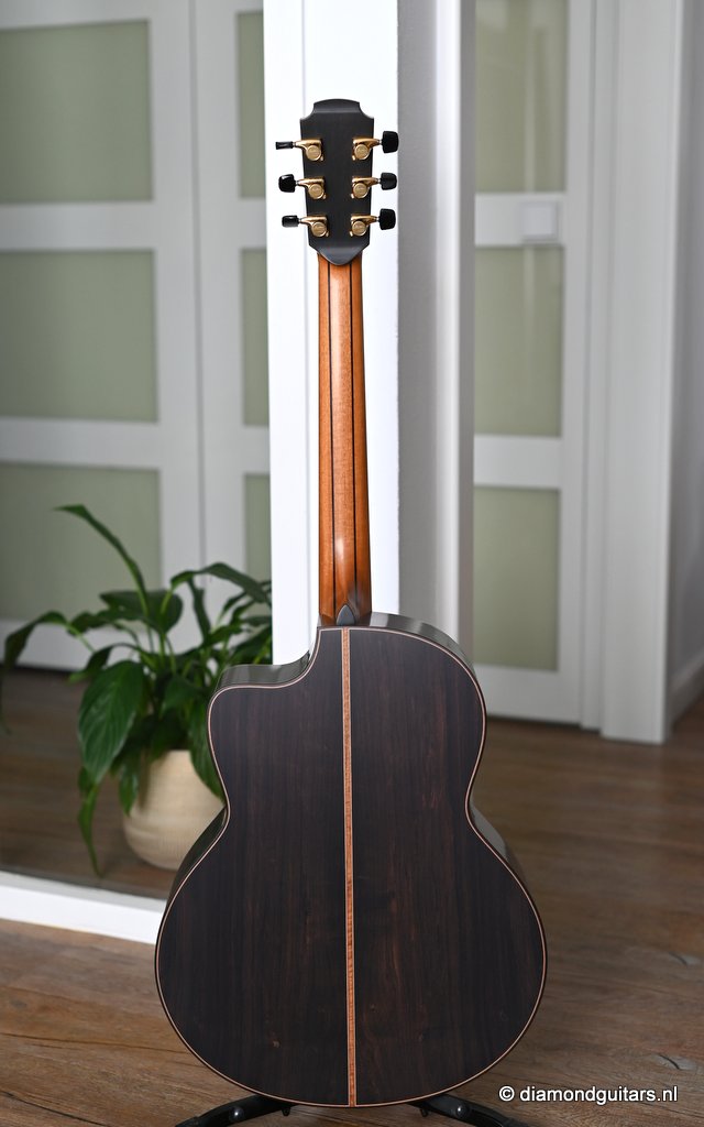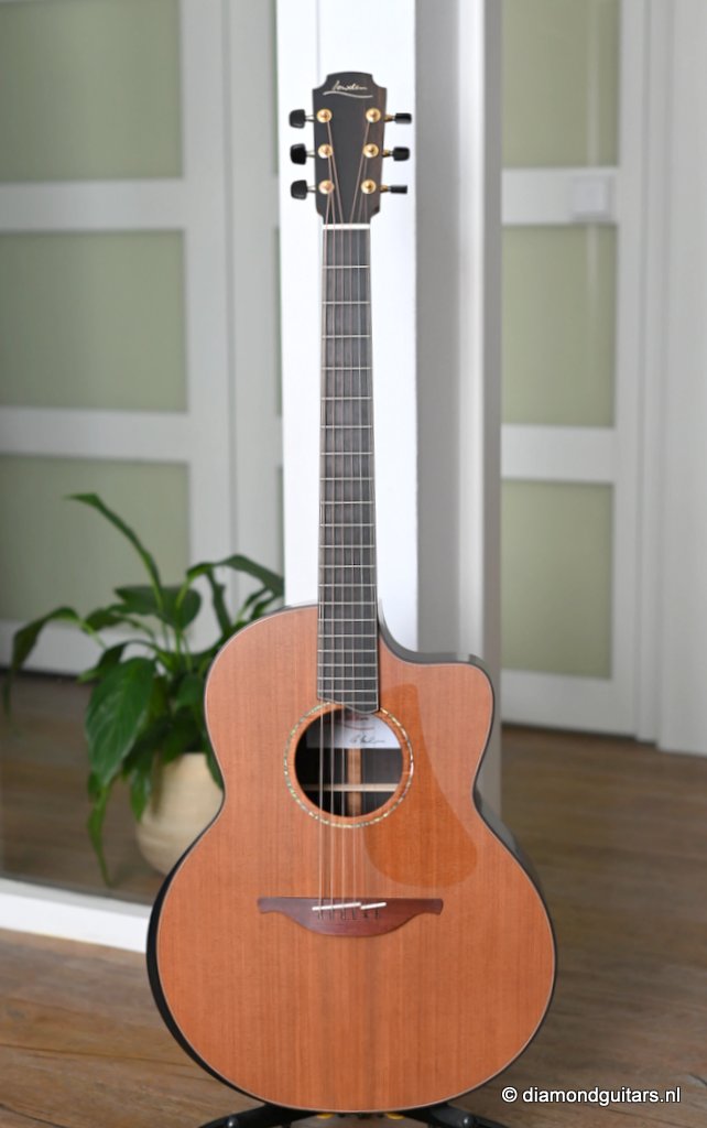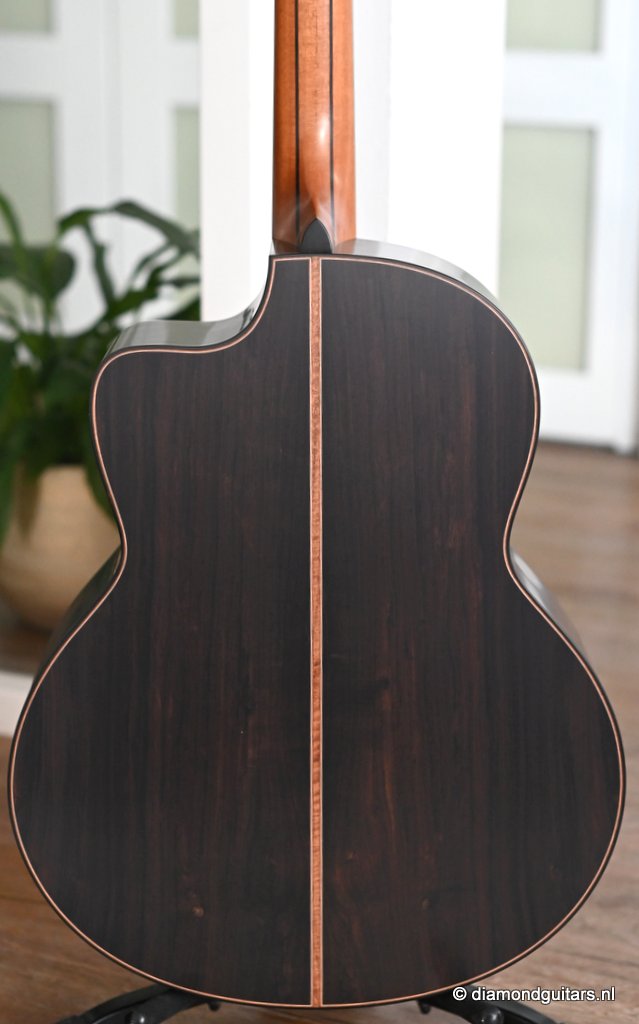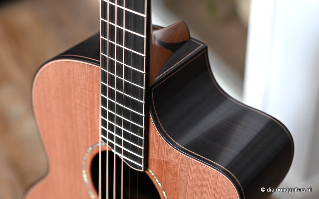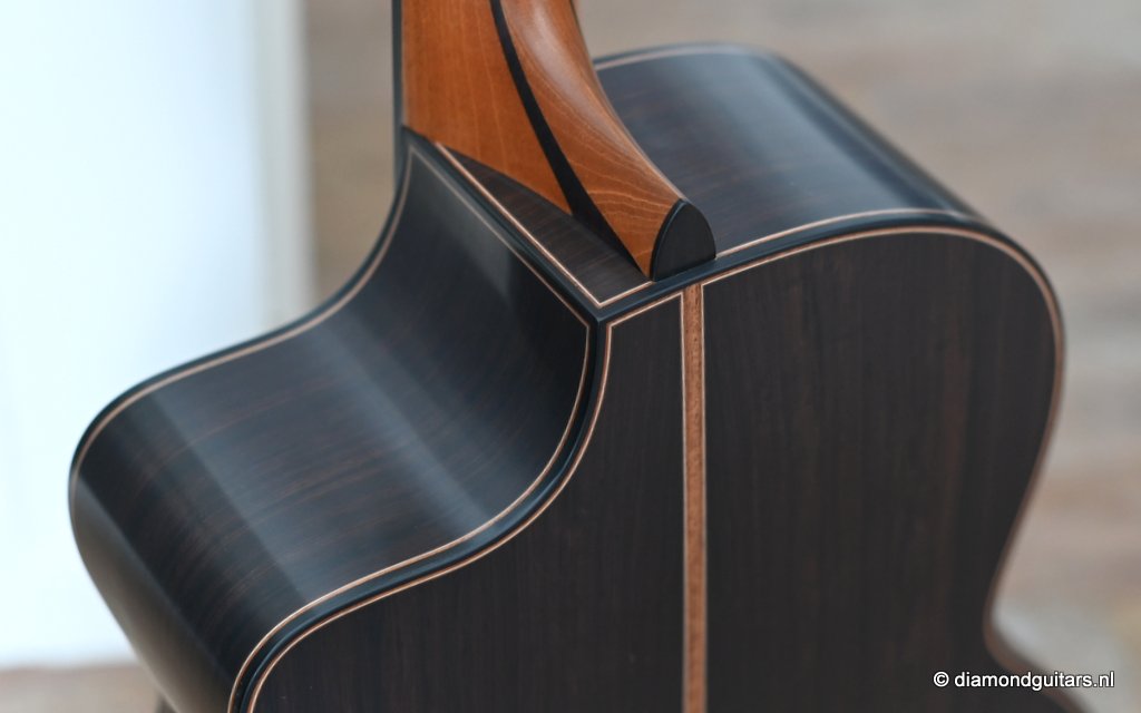 Elegant Lowden F50c African Blackwood combined with Sinker Redwood is George Lowden‘s favorite wood combination. Astonishing instrument with soundbox bevel and cutaway. Grand guitar, displaying the typical Lowden understatement.