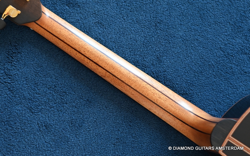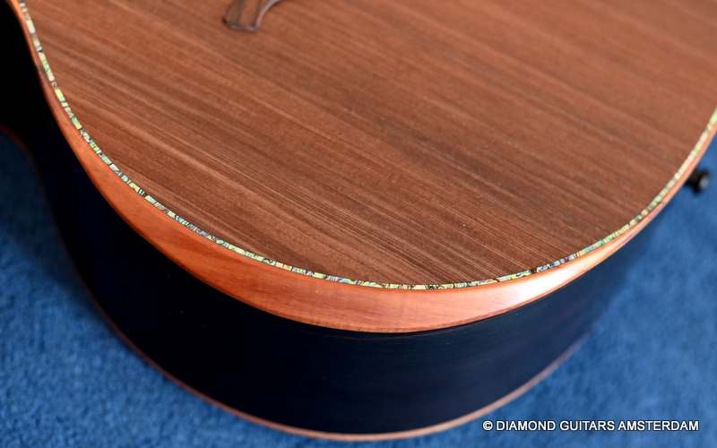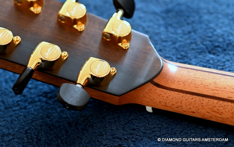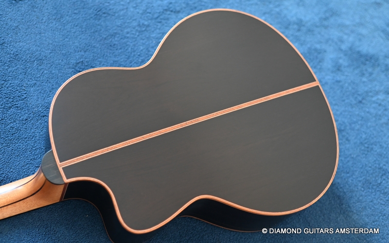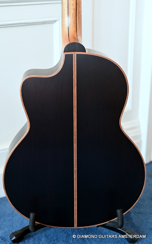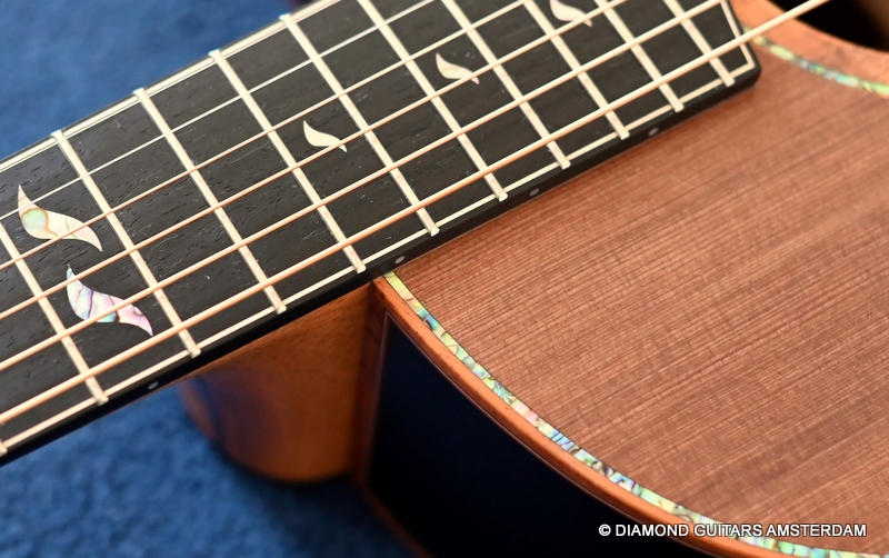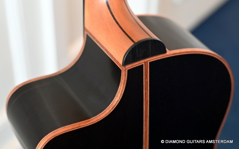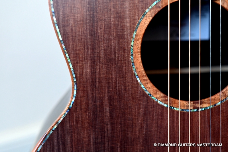 The classy figured Sinker Redwood gives her a classy look. The top is made from Mastergrade Sinker Redwood. These tops typically display a rich optical spectrum as the result of colors uniquely imparted from silt and the mineral-rich water. The age and size of these trees translates into a tight grain with nice cross-grain stiffness and offers a fairly bold response, with a brilliance complemented by warm overtones similar to Cedar but with extra brightness and headroom. Sinker Redwood trees originate from California and are often 1000 to 2000-year-old. These trees are only used when they have fallen naturally. The ‘Sinker’ designations tells you it’s been hidden under the mus on the banks of the Californian rivers for at least 100 year. Combined with the amazing Brazilian Rosewood set selected by George, she gives you an instrument that excels in every way.