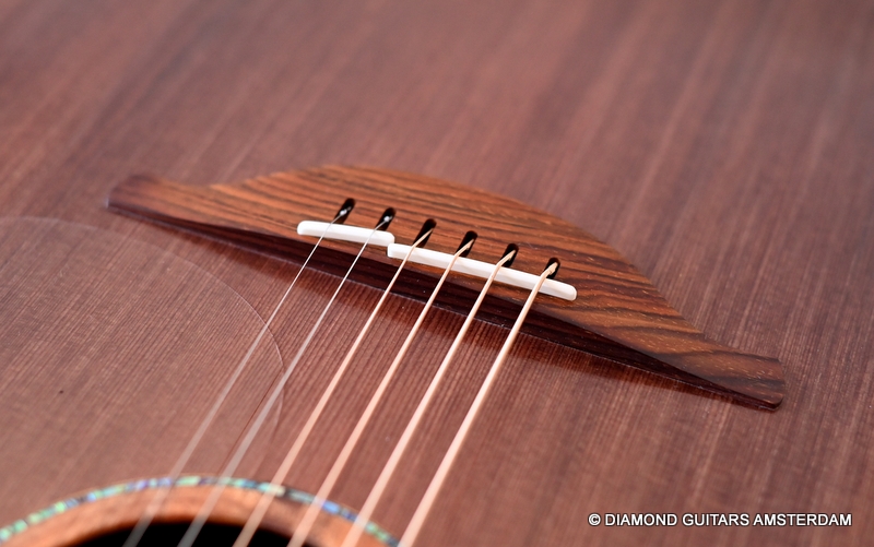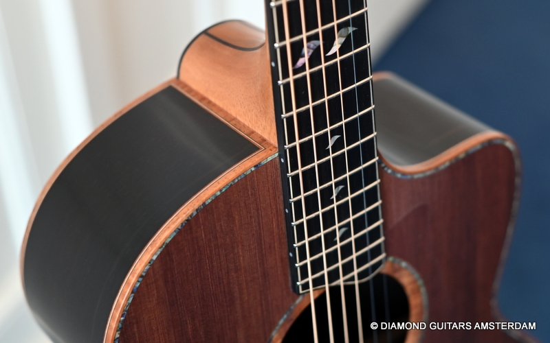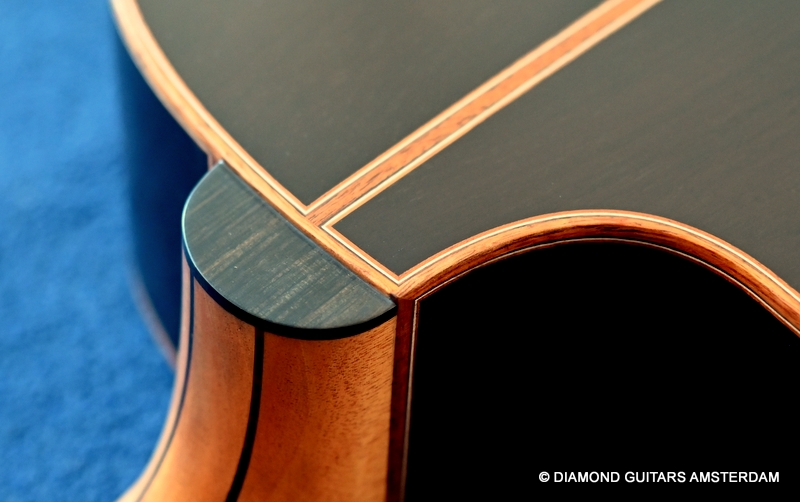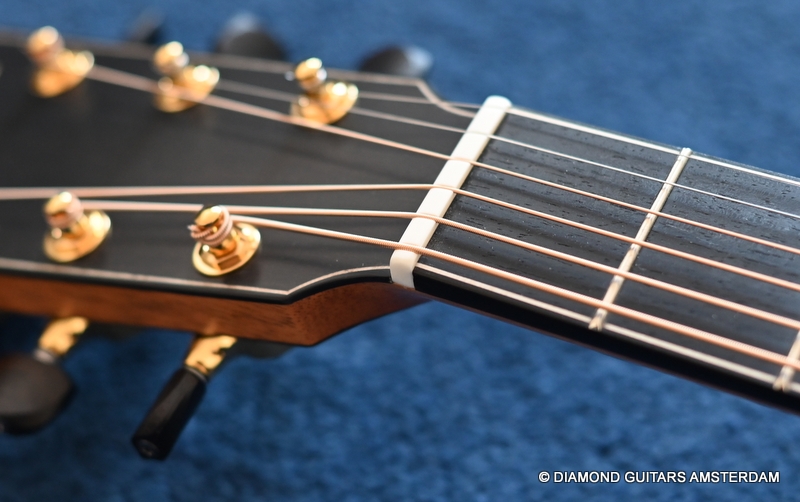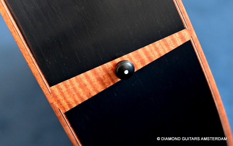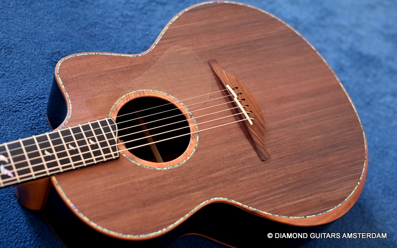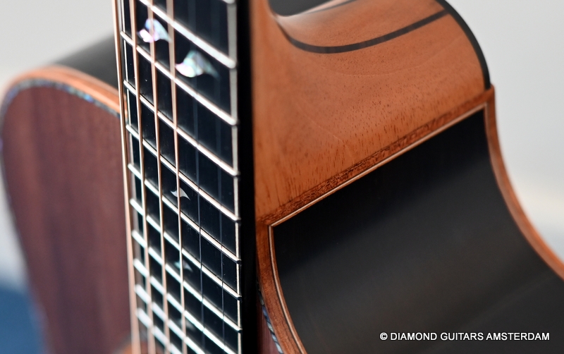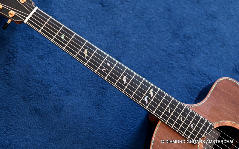 The classy figured Sinker Redwood gives her a classy look. The top is made from Mastergrade Sinker Redwood. These tops typically display a rich optical spectrum as the result of colors uniquely imparted from silt and the mineral-rich water. The age and size of these trees translates into a tight grain with nice cross-grain stiffness and offers a fairly bold response, with a brilliance complemented by warm overtones similar to Cedar but with extra brightness and headroom. Sinker Redwood trees originate from California and are often 1000 to 2000-year-old. These trees are only used when they have fallen naturally. The ‘Sinker’ designations tells you it’s been hidden under the mus on the banks of the Californian rivers for at least 100 year. Combined with the amazing Brazilian Rosewood set selected by George, she gives you an instrument that excels in every way.