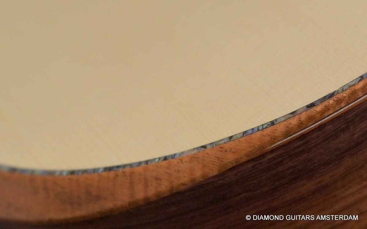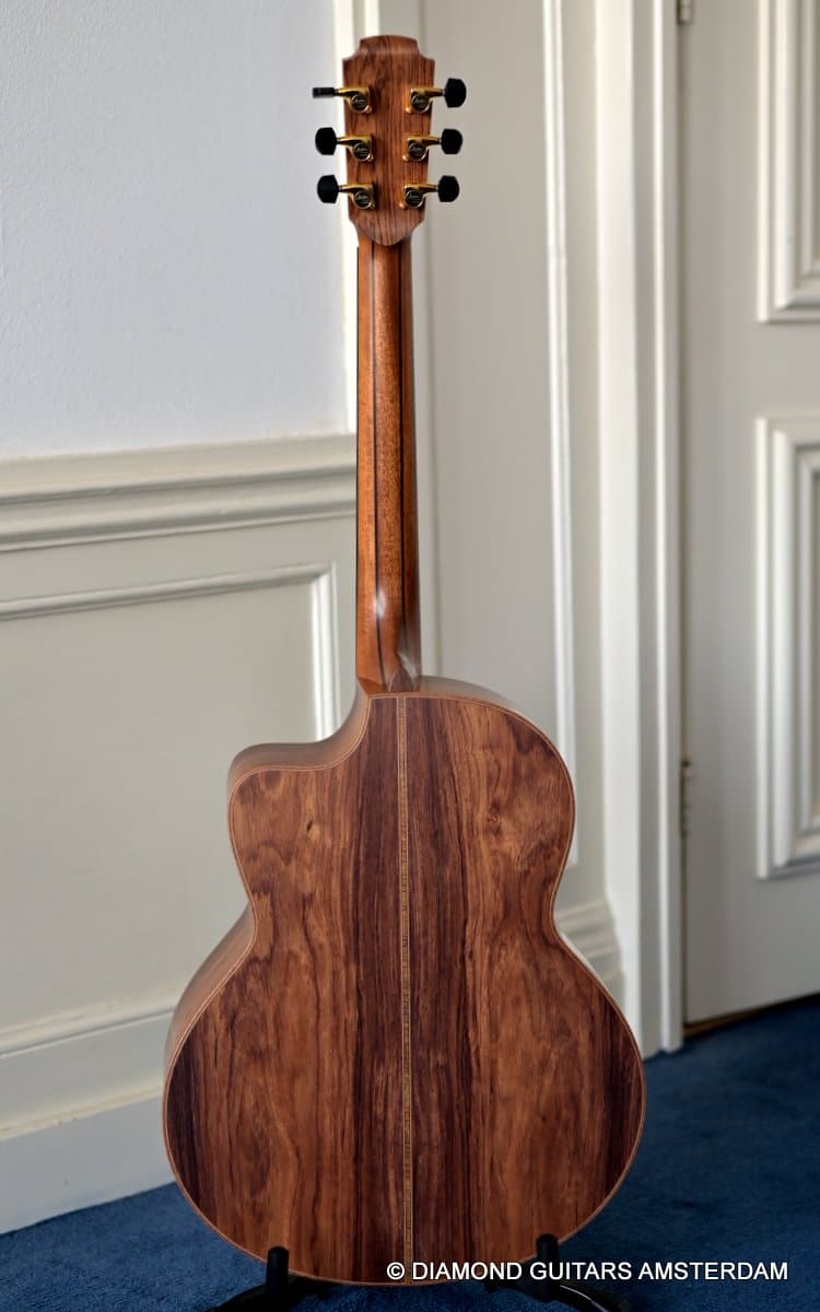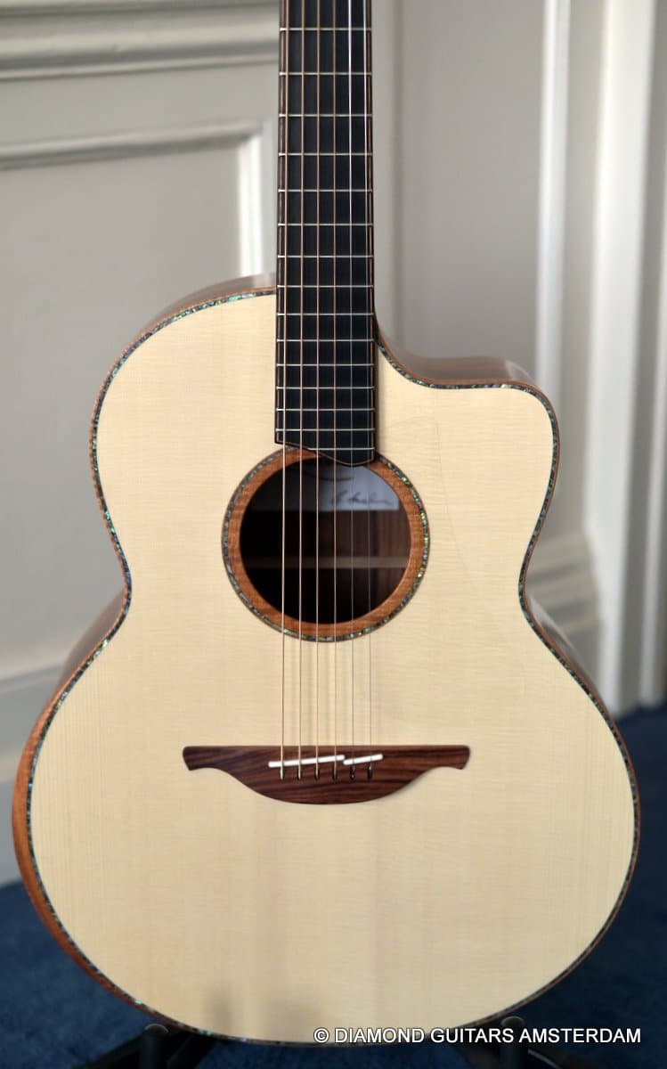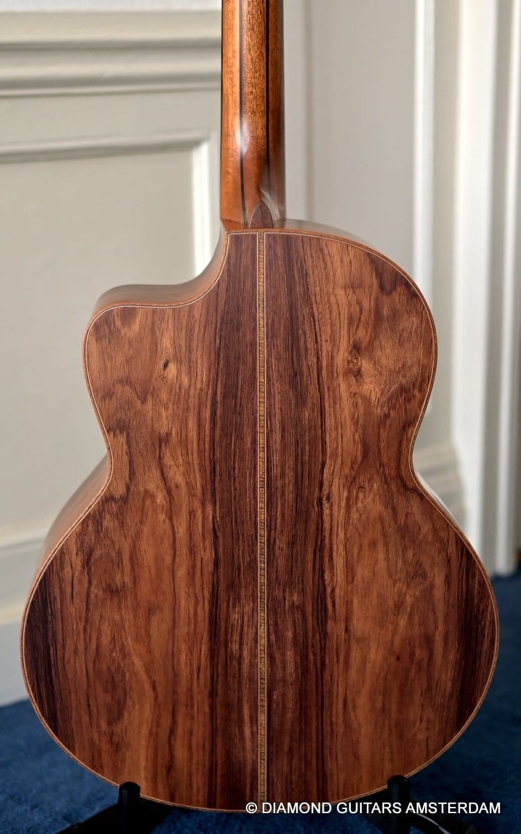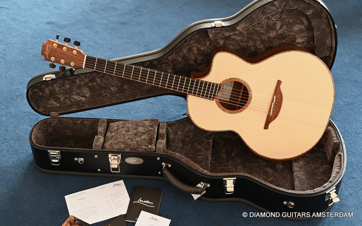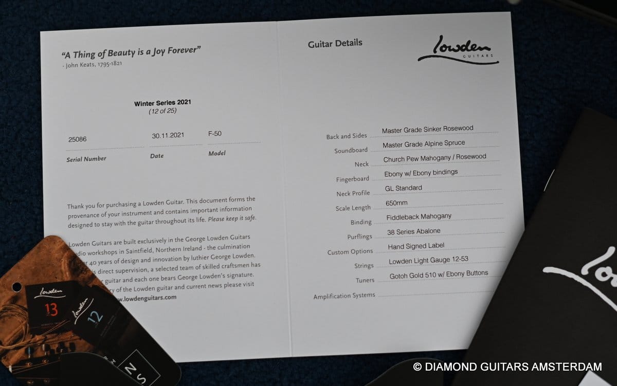 This Lowden F50c Winter Limited 2021 is built with mastergrade tonewoods. The Sinker Honduran Rosewood is chocolate colored and with beautiful figuring. Hand-picked by George Lowden and thus chooses the best quality. The volume, the complexity of the tone, the overtones and clarity hit you immediately! She is an instant responder to light finger touch, including fantastic overtones. Superb clarity of the treble notes. After you hit the bass strings and move up to the trebles, you are taken by the fullness of the notes. Brilliant guitar!