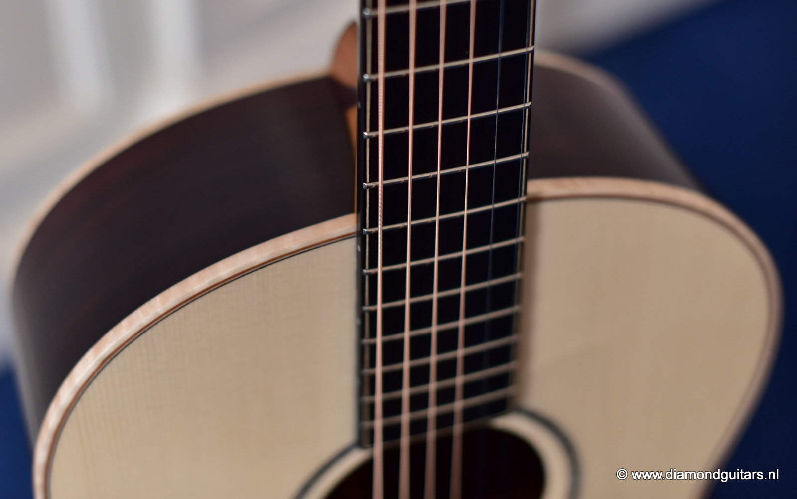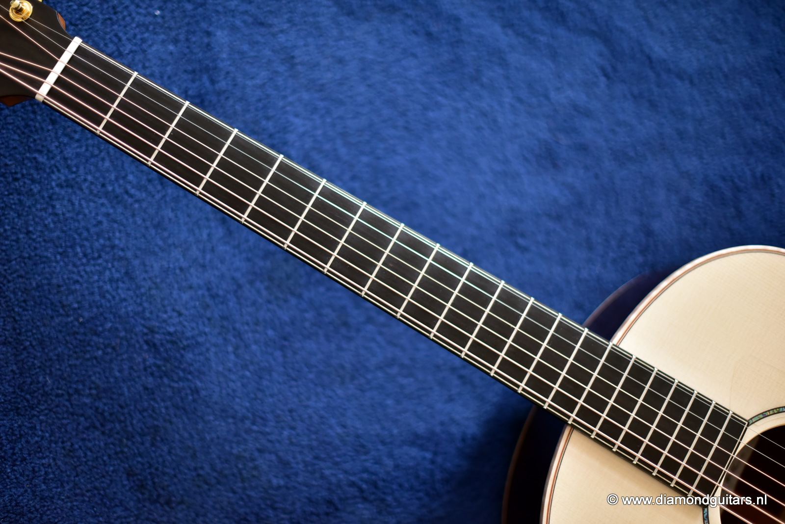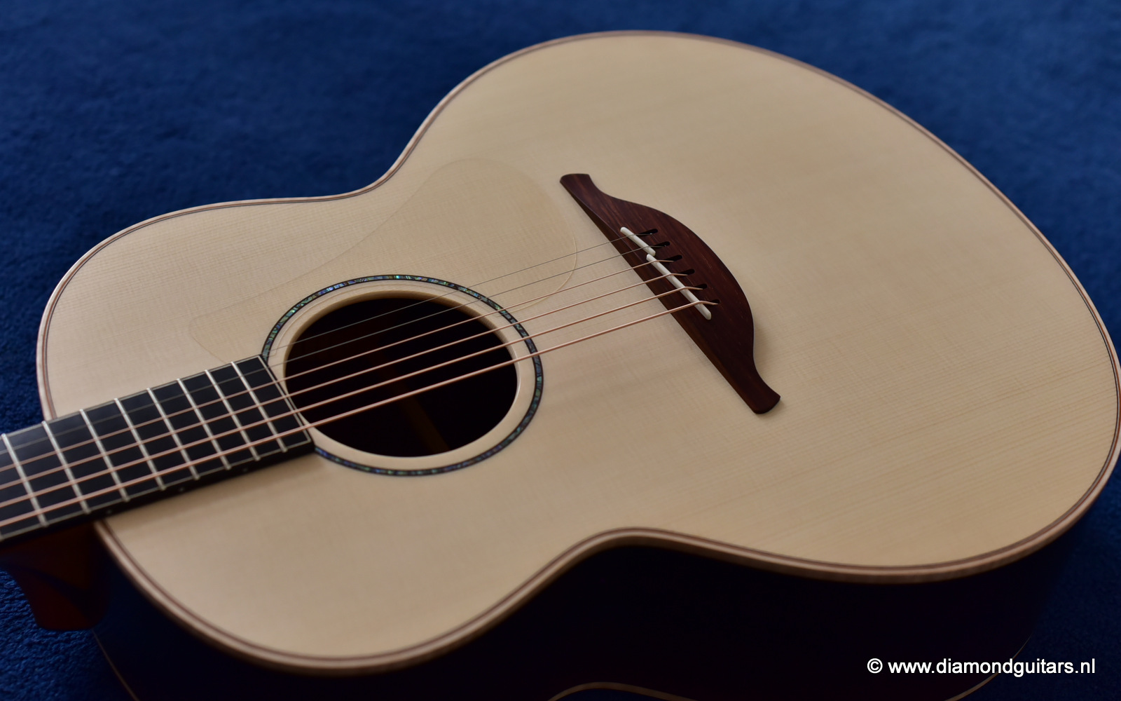 This Lowden FM35 has that special, delicate voice by the AAAA Alpine Spruce top. Her soundbox is a tad smaller (105 mm) than the standard F model (120 mm) and comes with a narrow neck (43.5 mm). This neck gives a more electric guitar feel to the left hand. Very easy to play and when one switches from a Les Paul to this babe it just goes natural. Fun to play with delicious tone and lots over overtones and complexity.