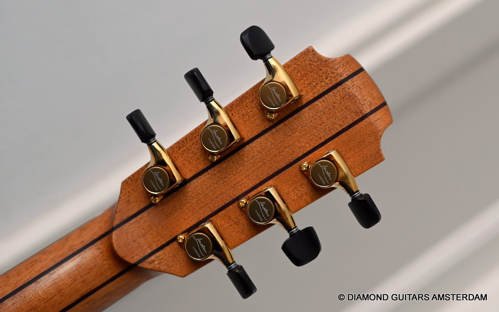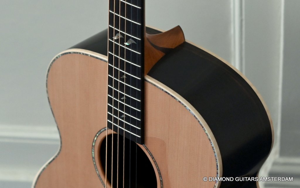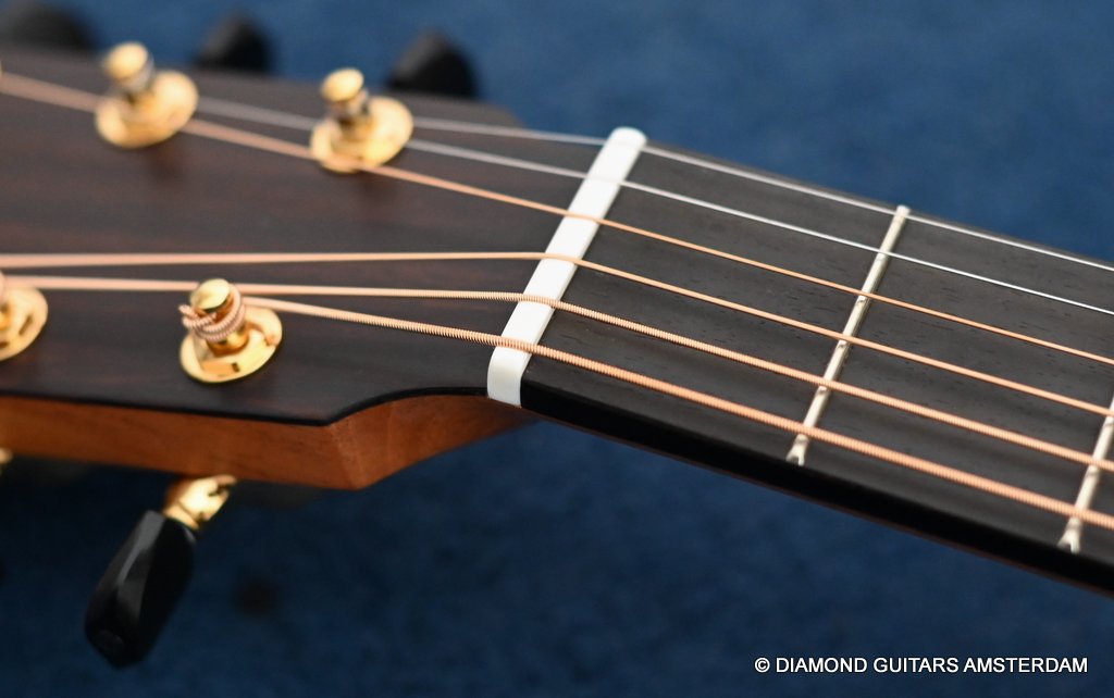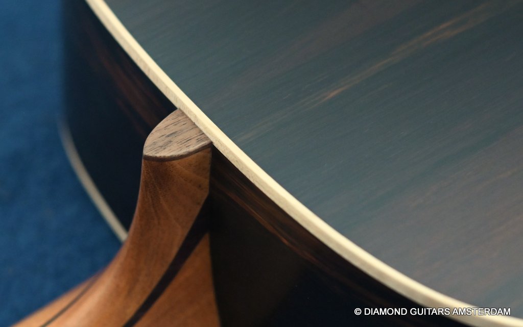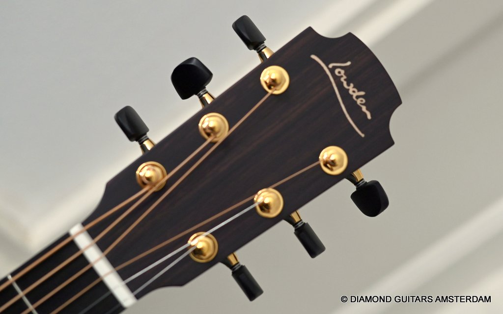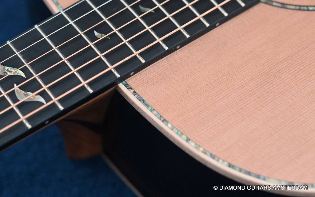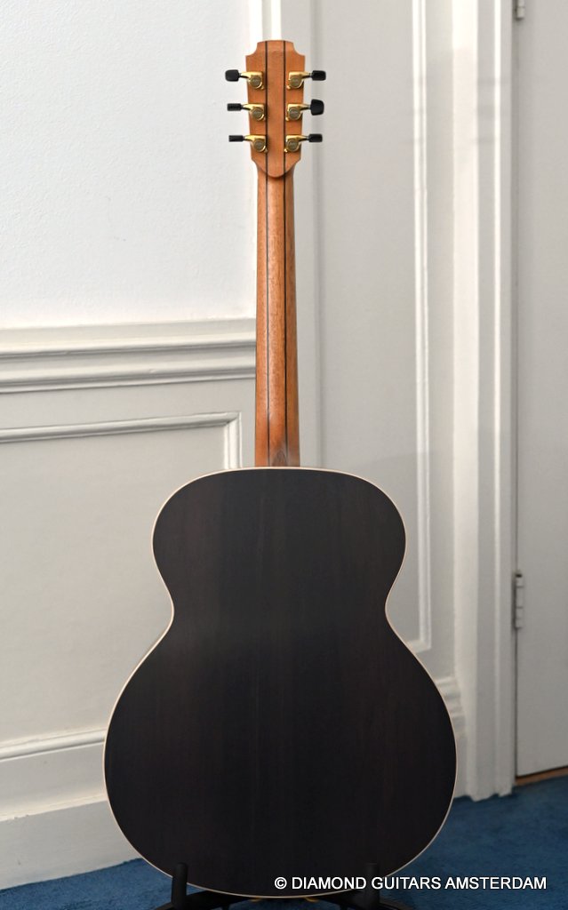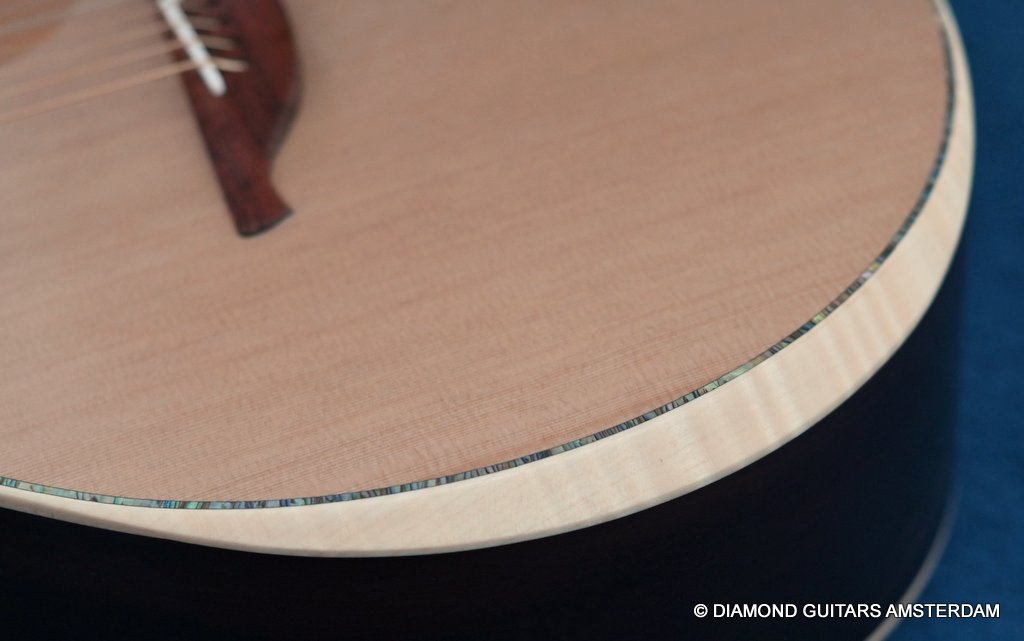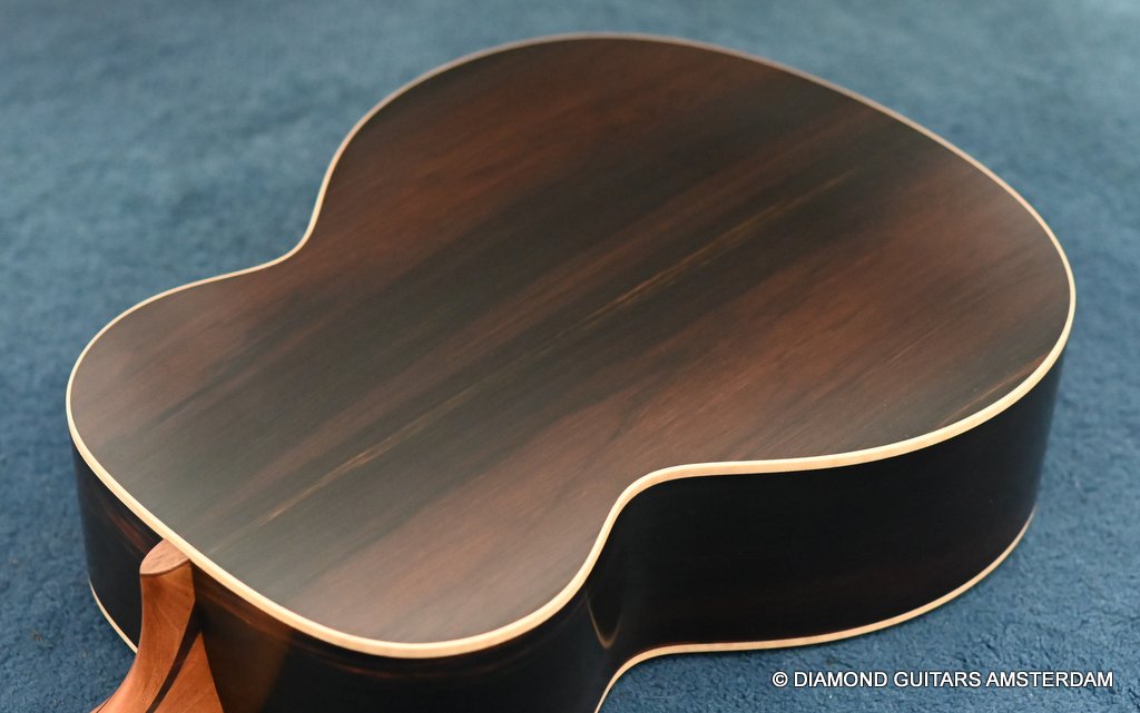 Of course, she features 38-style appointments throughout, including a leaf inlay pattern on the Ebony fingerboard, Abalone soundboard inlays, a Rosewood head plate and Maple binding and soundbox bevel. The bevel on this big gun is not a must, but does give a lot of comfort for the right arm and shoulder. Watch this YouTube vid with George Lowden’s comment on the 38. If you prefer a smaller sized 38 than please click HERE for her sister or HERE for her commemorative model build with Indian Rosewood. Listen to a sound impression by Manos Ploumidis here: