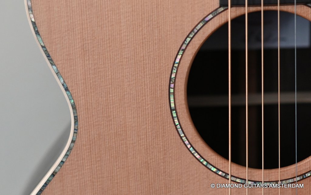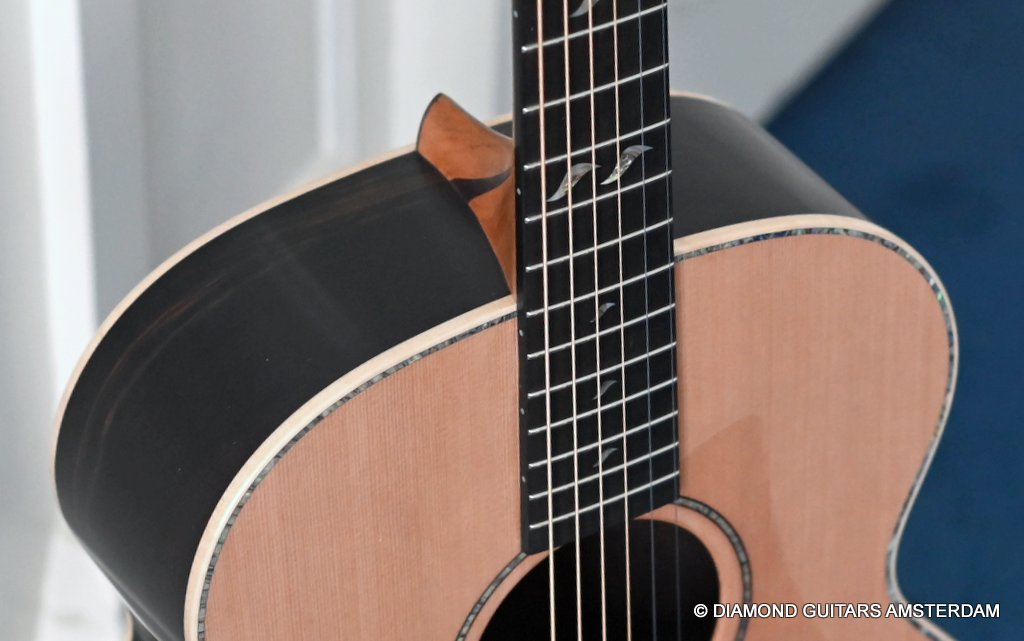 A Lowden O38 comes with a superb quality of CITES certified reclaimed Brazilian Rosewood and is traditionally paired with the dark Red Cedar top. Though George doesn’t use much shell inlay in his guitars, with this model he indulged a little with the Abalone soundbox inlay and ‘leaf’ inlay on the fretboard. And for additional comfort, we asked George to add a soundbox bevel!