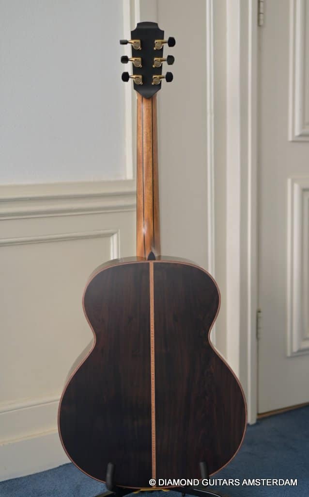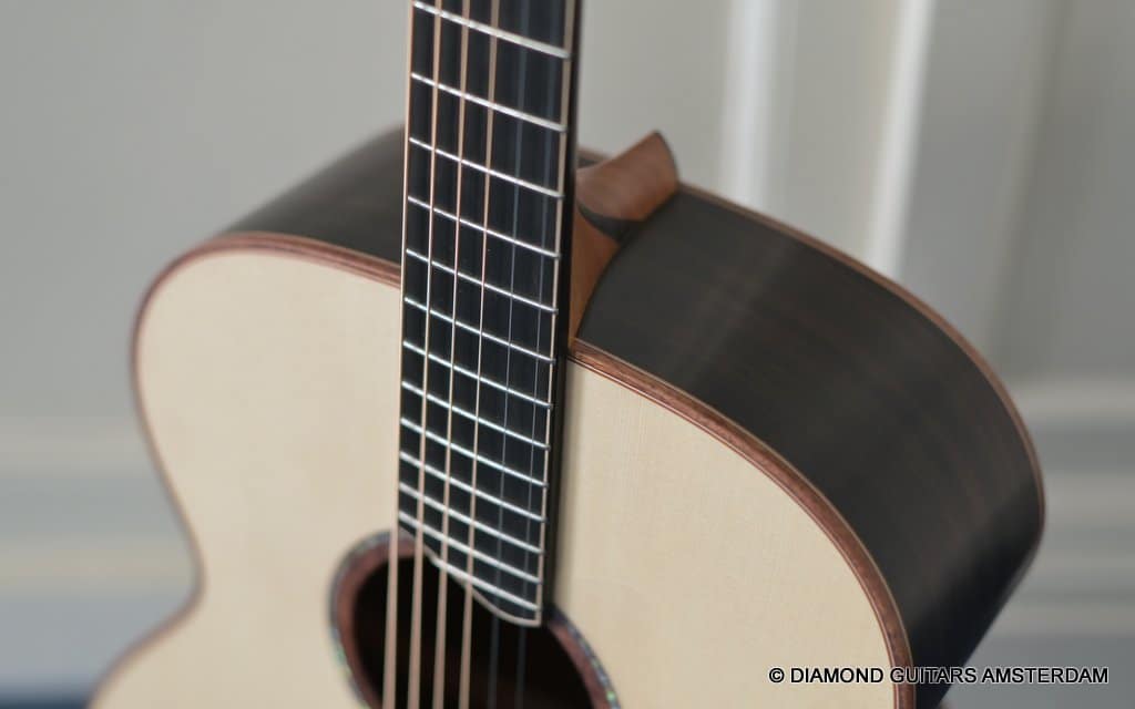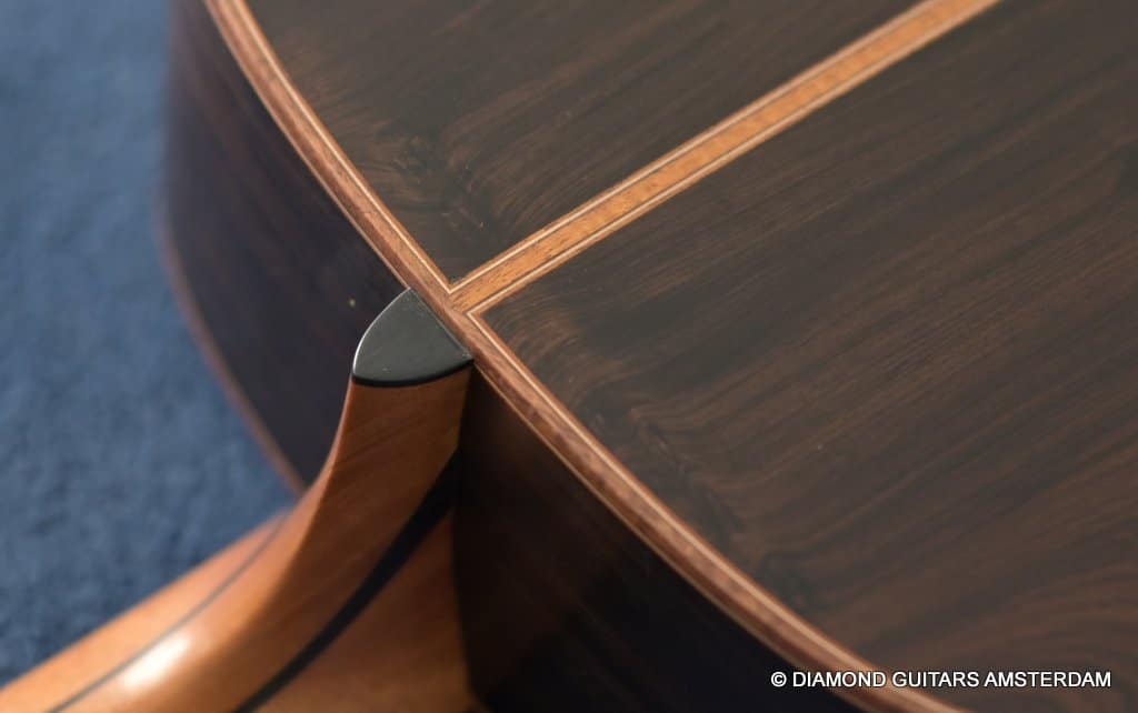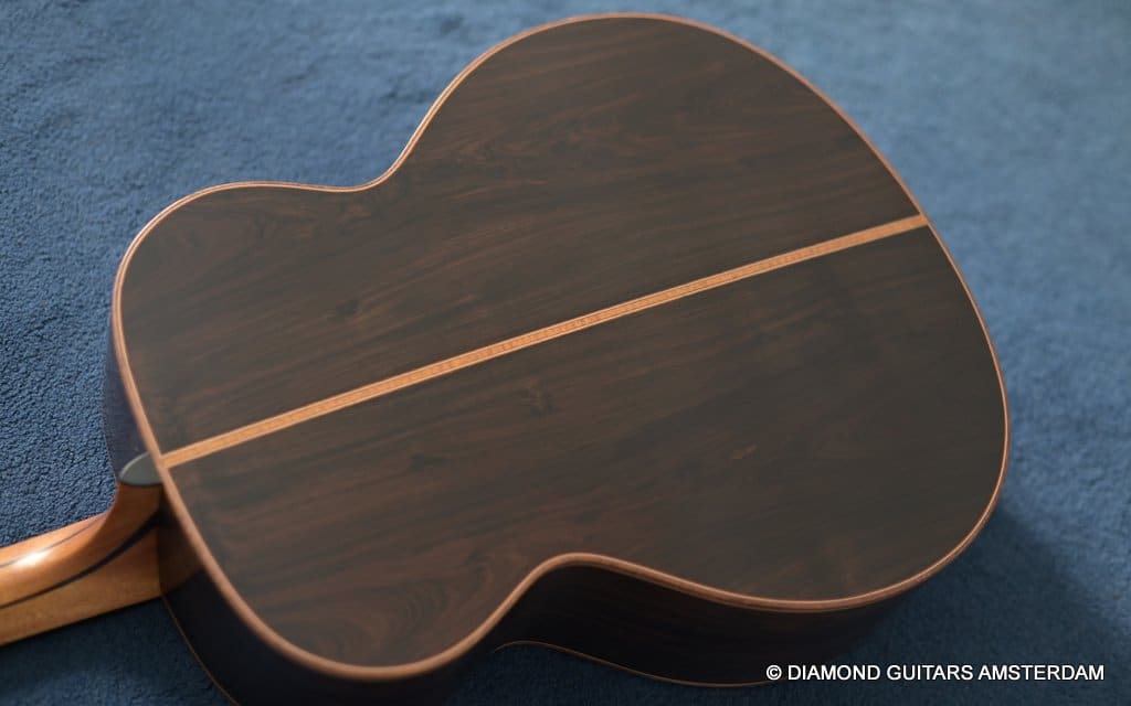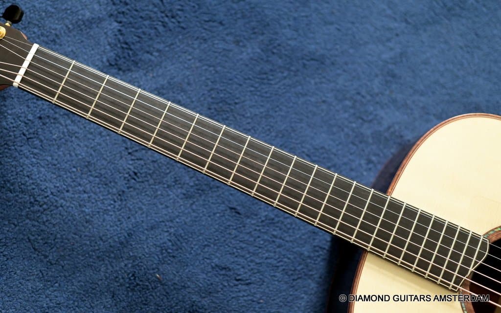 The O-size body was developed by George in the mid-seventies. With a larger lower bout and a traditional size upper bout the bass response is impressive while the mid and high notes are still loud and clear delivering a very balanced guitar with excellent note separation. This is an impressive Lowden amongst the Lowden guitars out there.