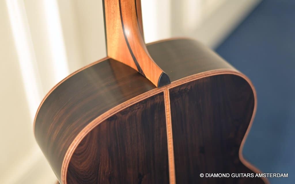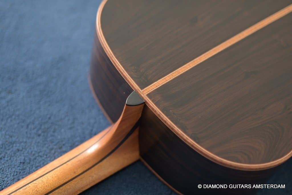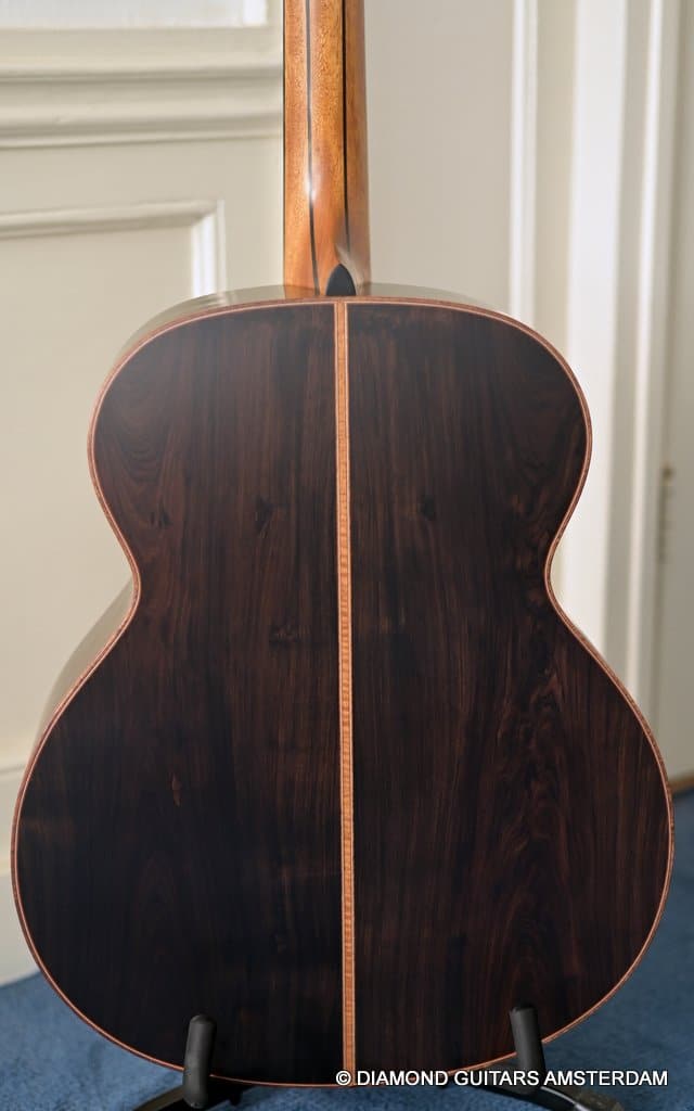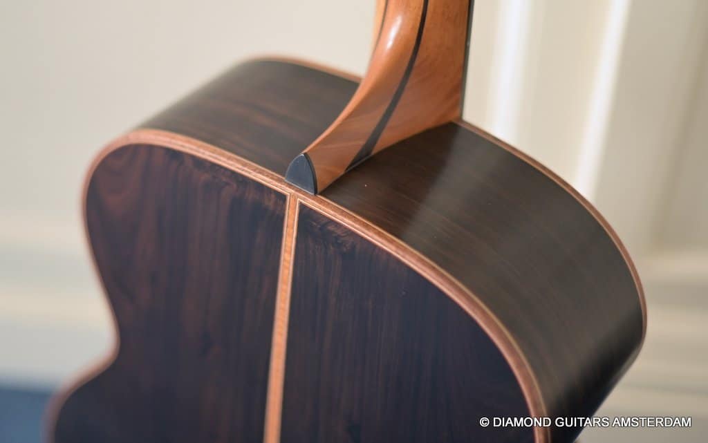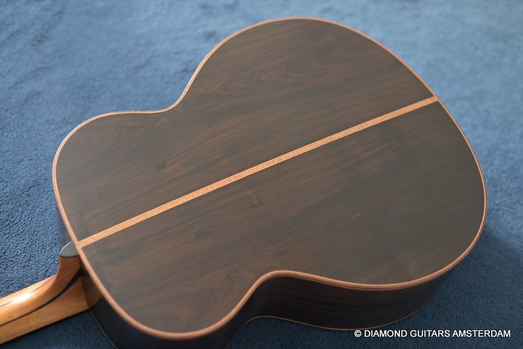 The O-size body was developed by George in the mid-seventies. With a larger lower bout and a traditional size upper bout the bass response is impressive while the mid and high notes are still loud and clear delivering a very balanced guitar with excellent note separation. This is an impressive Lowden amongst the Lowden guitars out there.