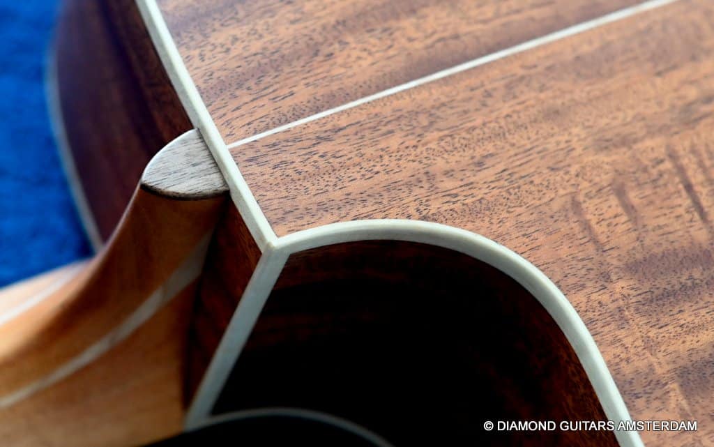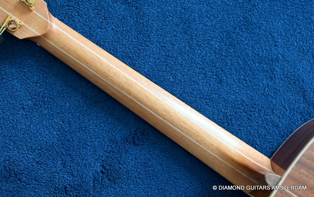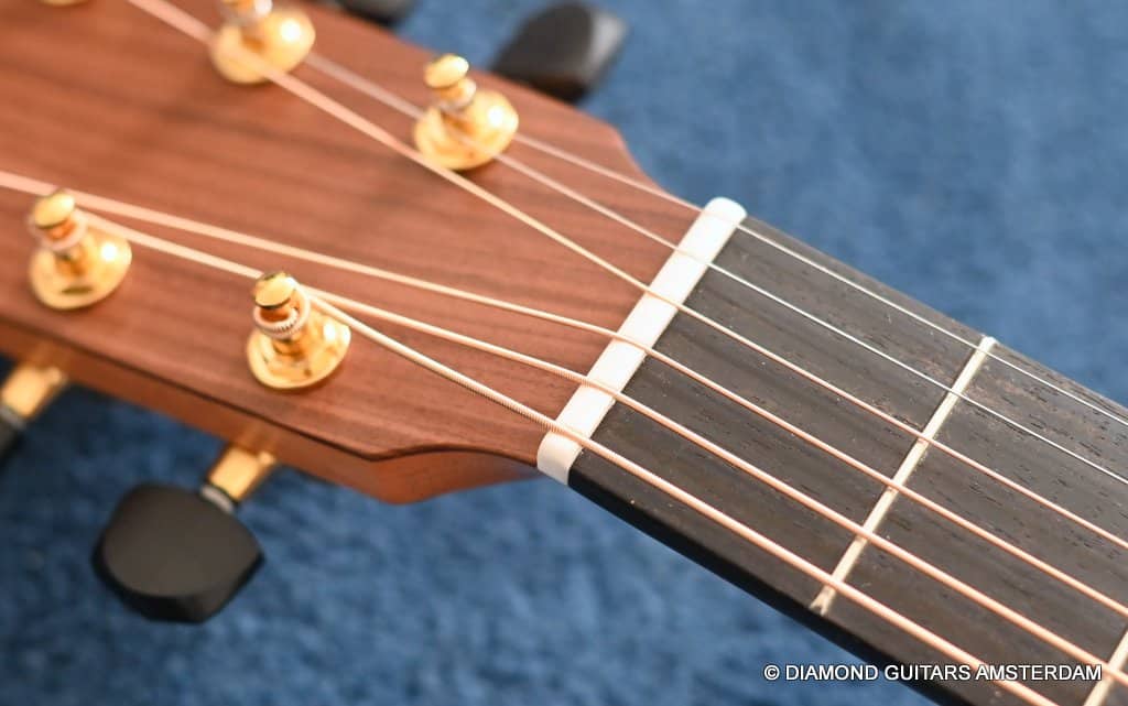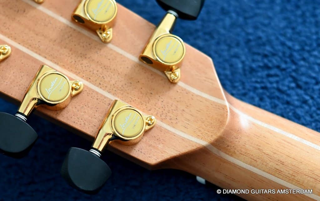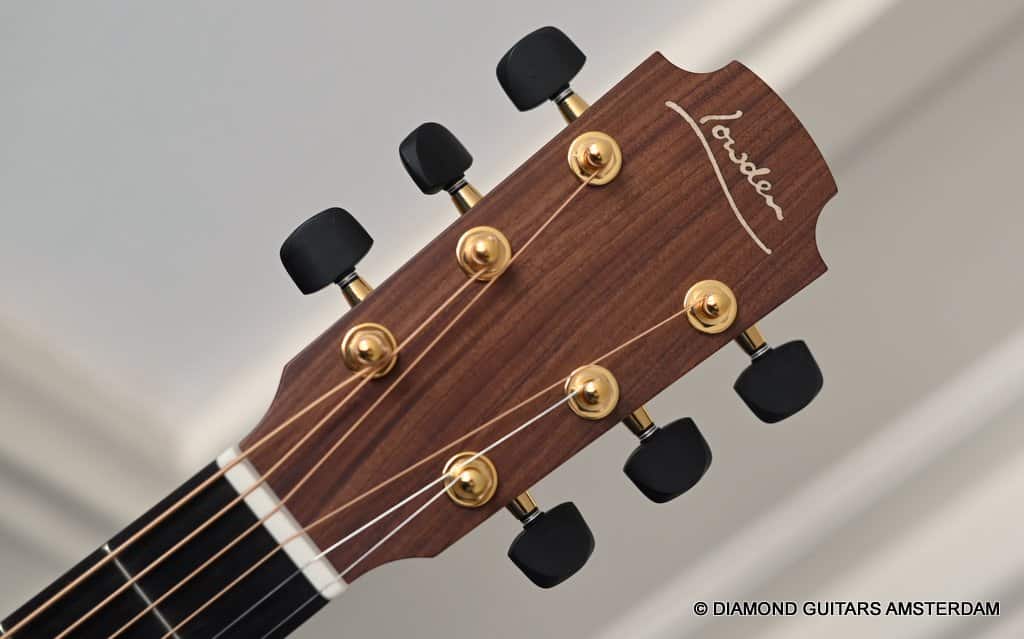 For the back and sides of this Lowden Pierre Bensusan Old Lady ancient Cuban Mahogany is used. This exquisite tonewood was used in all Mahogany pre-war guitars. But also in the lumber for building houses. Due to over-harvesting it was nearly extinct. George managed to get his hands on 18th and 19th century panels of Cuban Mahogany used for cabinetry. This brilliant tonewood produces more Rosewood-like sound qualities, with a more developed mid-range and low end. But it doesn’t have the Rosewood reverb and darkness. As a premium tonewood, Cuban Mahogany exhibits a perfect balanced tone. Cuban Mahogany adds warmth and mellowness to the tone, with pronounced lower mids, appealing high-ends, and superb sustain.