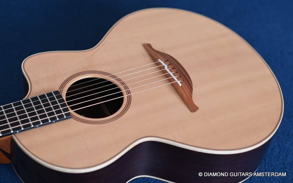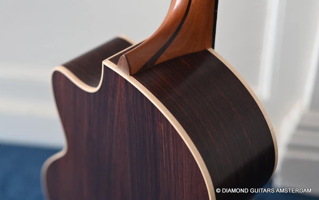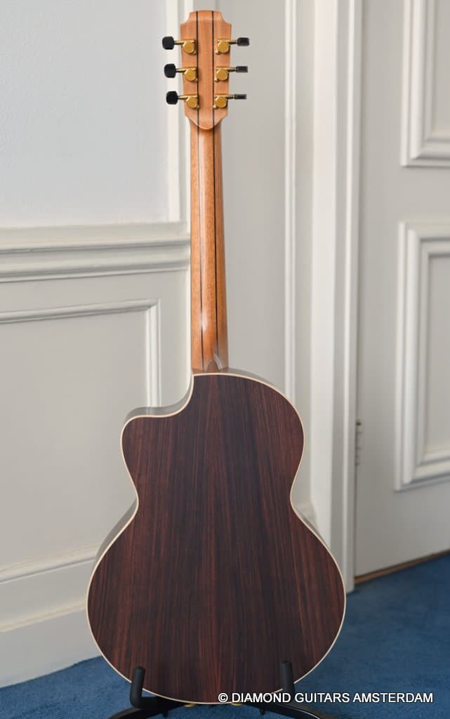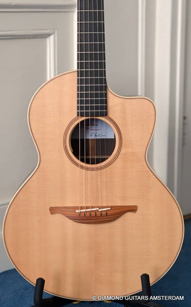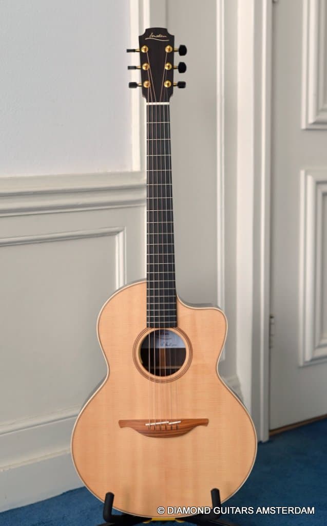 A Lowden S32c has her own distinctive voice and are definitely a class in their own next to the old Martins and Gibson’s. Clarity, sustain, articulation and definition are all what you will find in a Lowden Guitar. This Lowden S32c has a gorgeous Sitka Spruce top with a nicely figured Indian Rosewood back and sides. The Lowden team also added a cutaway for easy access to the superb sounding upper regions of the fretboard. A great small body, short scale guitar that offers surprising power and projection in a guitar that’s a joy to hold en easy to play.