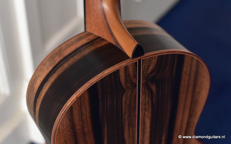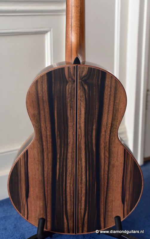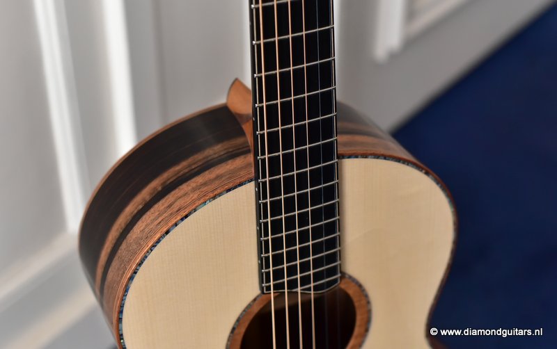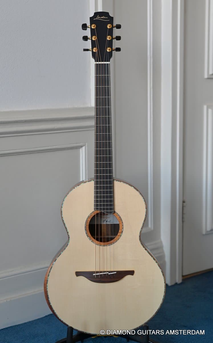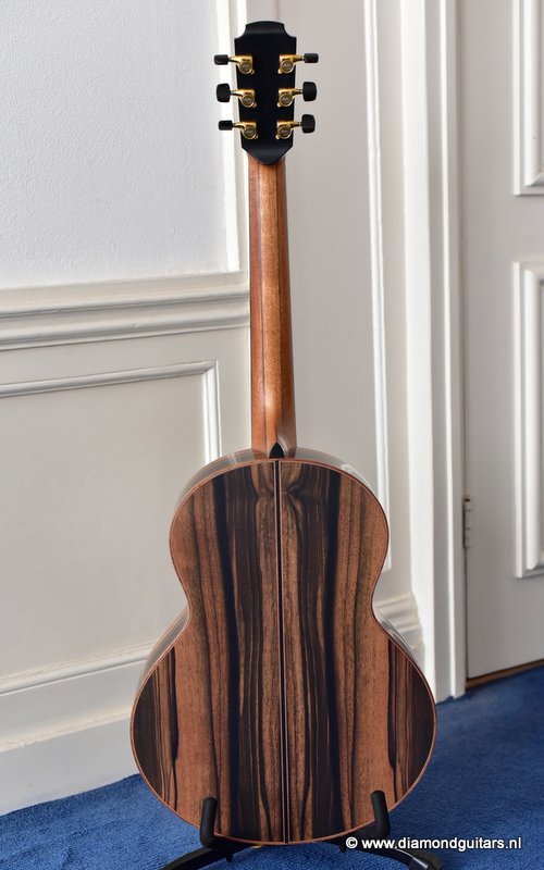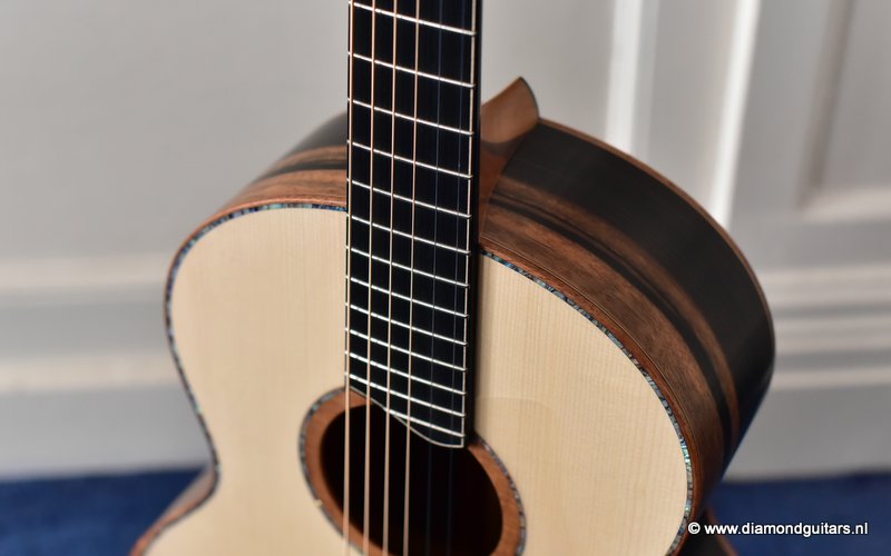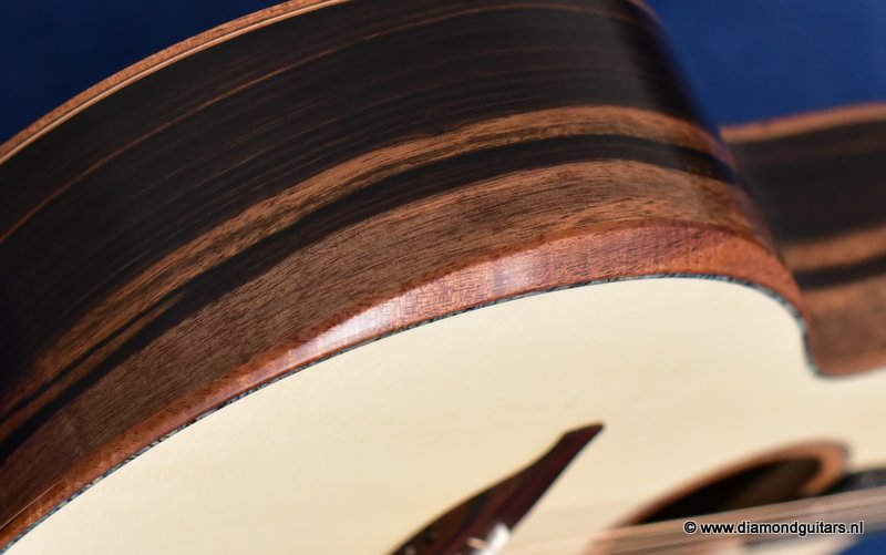 This Lowden S50 is build with stunning Mastergrade Macassar Striped Ebony. She is not only a visually remarkable guitar, but also unique from a tonal point of view. Macassar Ebony is a dense hardwood known to be clear and loud. With it liking to be played with more energy, George chose a mastergrade Adirondack Spruce top to create a balanced sound. Tonally, this combination offers a strong bass and lower mids. Clear, responsive highs and a slightly scooped midrange.