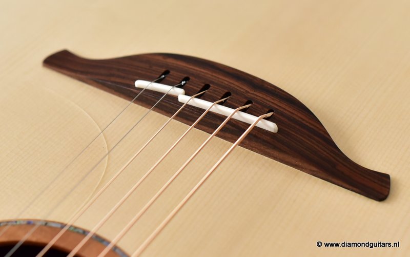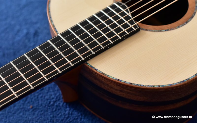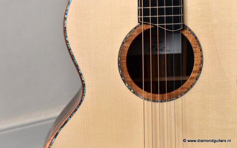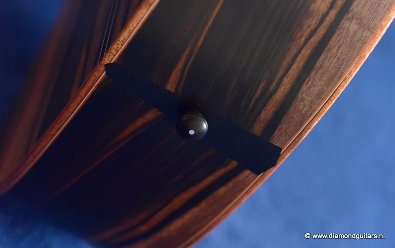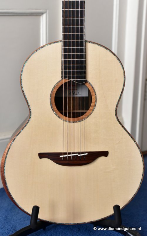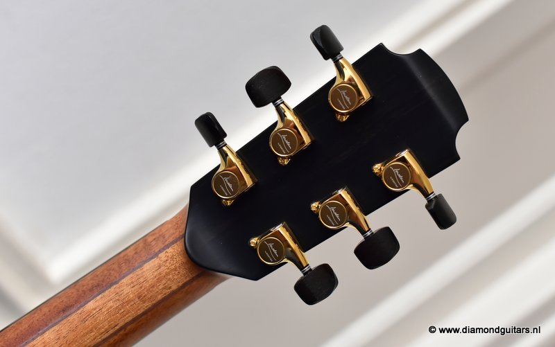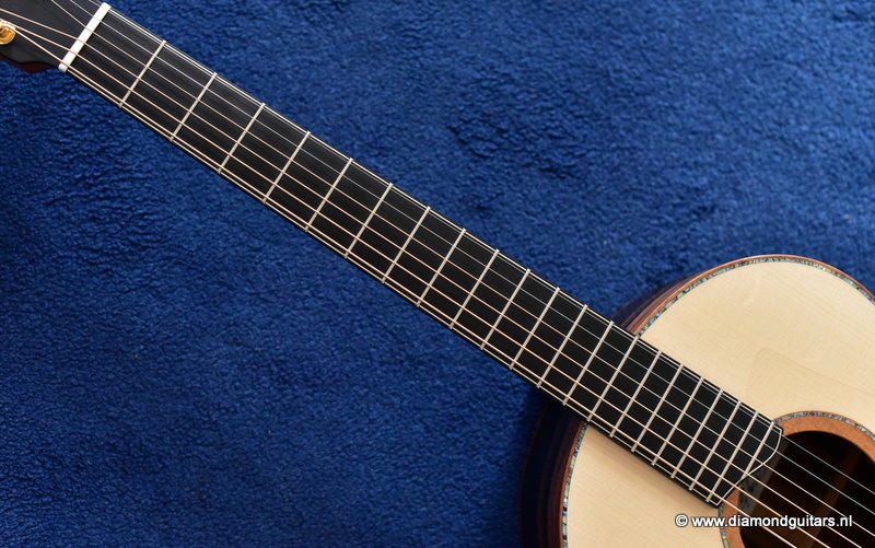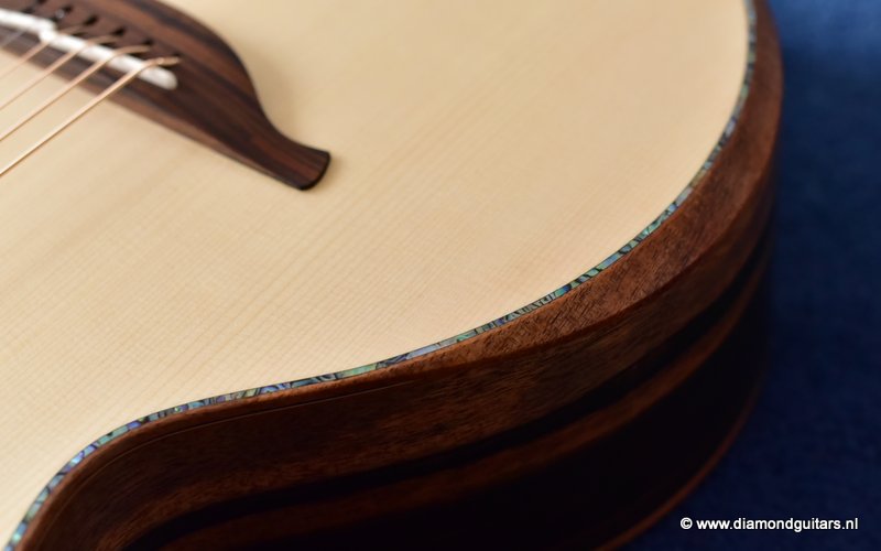 This Lowden S50 is build with stunning Mastergrade Macassar Striped Ebony. She is not only a visually remarkable guitar, but also unique from a tonal point of view. Macassar Ebony is a dense hardwood known to be clear and loud. With it liking to be played with more energy, George chose a mastergrade Adirondack Spruce top to create a balanced sound. Tonally, this combination offers a strong bass and lower mids. Clear, responsive highs and a slightly scooped midrange.