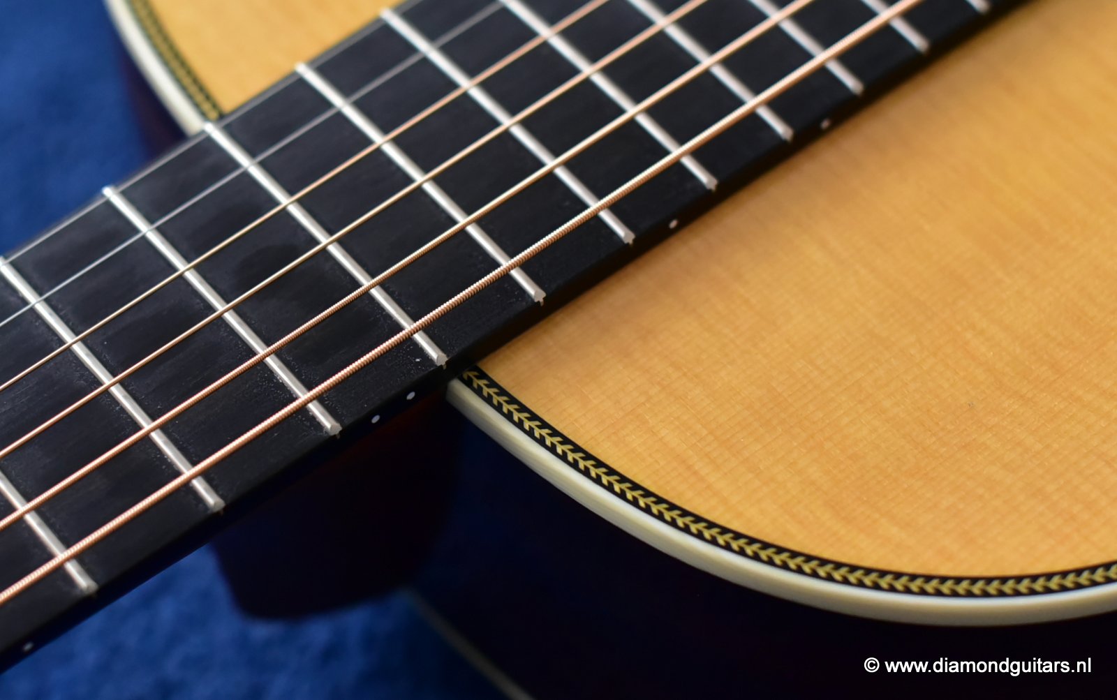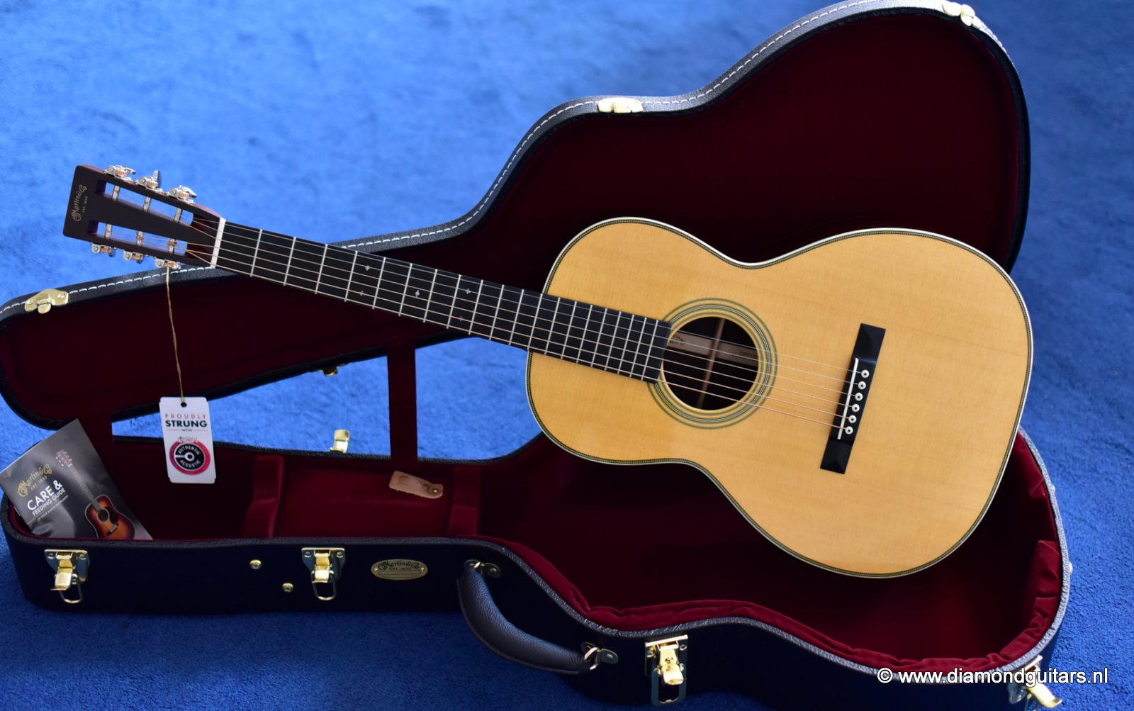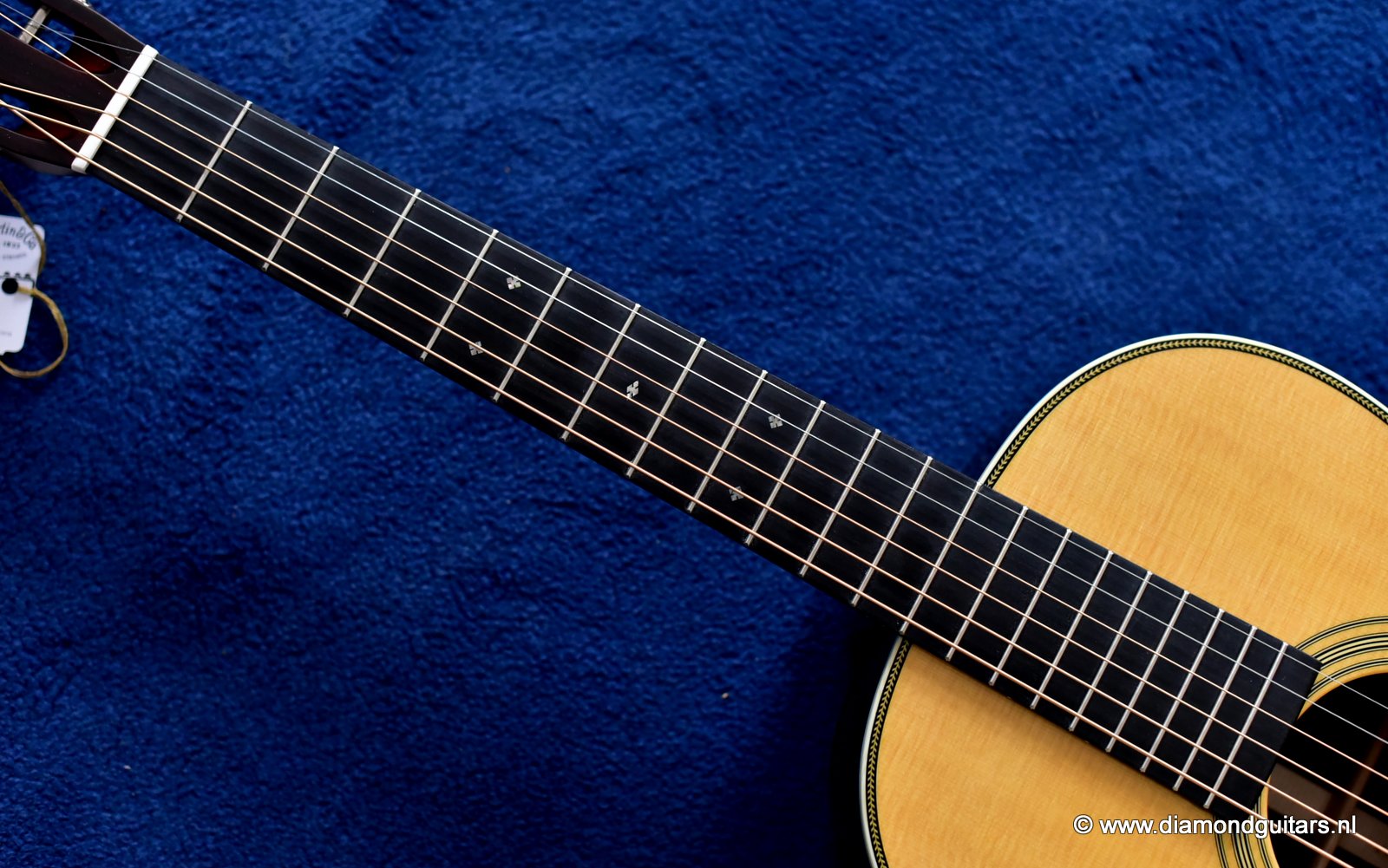 A Martin 00-28VS Vintage Series guitar gives guitarists the opportunity to experience the sound and feel of Martin’s most sought after vintage instruments without breaking the bank. Simply playing this sweet tone machine will benefit your playing in ways you could never imagine. This guitar has a standard short scale neck (632,5mm nut to saddle), a 47,6mm nut width and a 58,75mm string spacing at the bridge. She has herringbone top border, three concentric rings around the soundhole; a rectangular ebony bridge with twin pyramids, and crème color bridge pins with black dots with a matching end pin. She also has grained ivoroid side binding, crème and ebony back purfling and a zipper wooden backstripe. Her heel cap and end graft are grained ivoroid and there is a diamond carved behind the nut.
