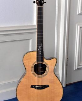 This Martin 000-18 Modern Deluxe combines traditional design with contemporary features. The Sitka Spruce top is aged for Vintage tone (VTS-treatment). Back and sides are genuine Mahogany and all is constructed using natural protein glues. Like vintage D-18s, the instrument has an Ebony fingerboard and bridge and Adirondack scalloped, forward-shifted X-bracing. In addition, Martin’s contemporary High Performance Taper neck, the composite carbon-fiber bridge plate and a hybrid titanium-steel truss rod to keep the weight down as well as JesCar EvoGold frets, Liquidmetal bridge pins, Abalone position markers, Diamonds and Squares long pattern fretboard inlay, European flamed Maple binding and an Abalone Martin script logo in the headstock.