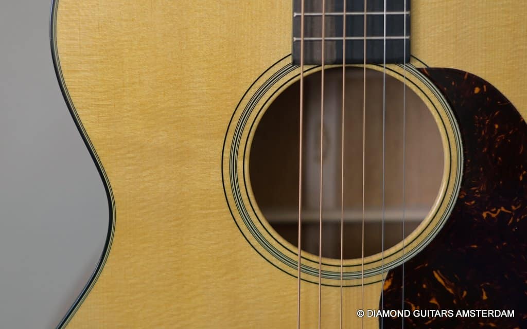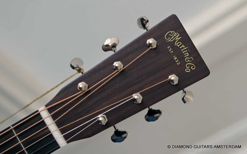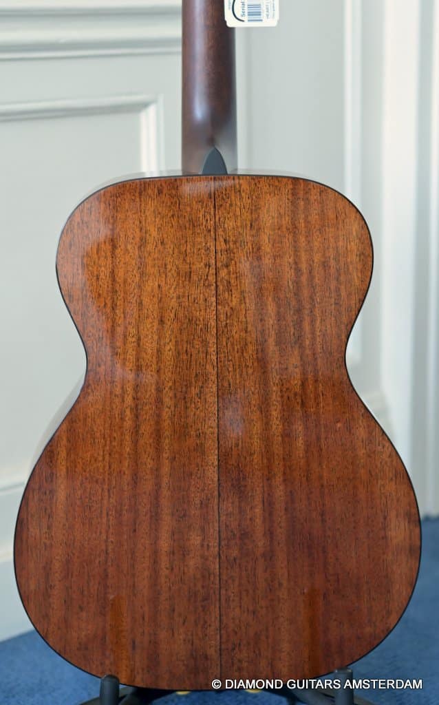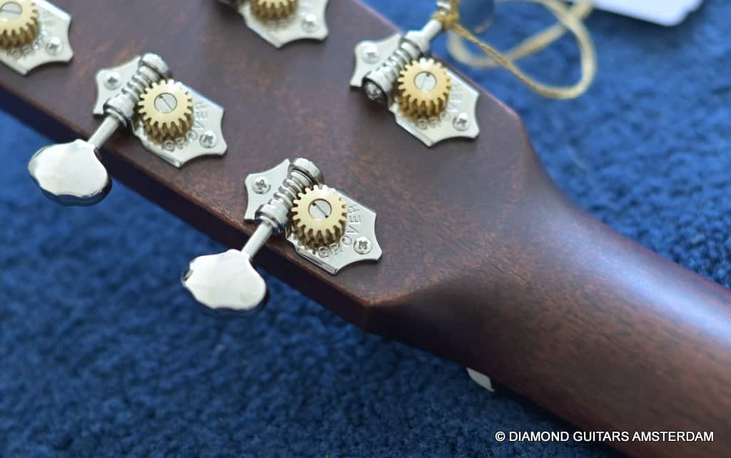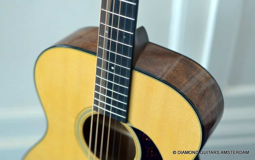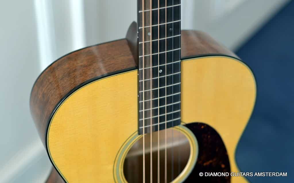 For flatpicked lead lines and fingerpicking the 000-18 works amazingly well, and it’s no slouch in the strumming department either. Her body shape makes this fine acoustic guitar very comfortable and tonally balanced. The proven wood combination of Sitka Spruce for the top and Genuine Mahogany for the back and sides ensures a warm, differentiated sound. She plays comfortably thanks to the modified low oval neck profile. For a subtle vintage look, the top is finished with a slightly golden yellow aging toner. Open tuners and the Script Old Style logo on the headstock also support the look. When played with delicacy, arpeggios notes roll out defined and delicate. Because of the shorter scale length, the string tension is a tad lower, making string bending a bit easier. That is why 000-models are favored by blues players like Elisabeth Cotten, Lonnie Johnson and also Eric Clapton.