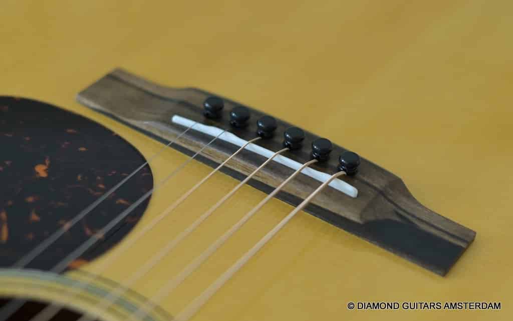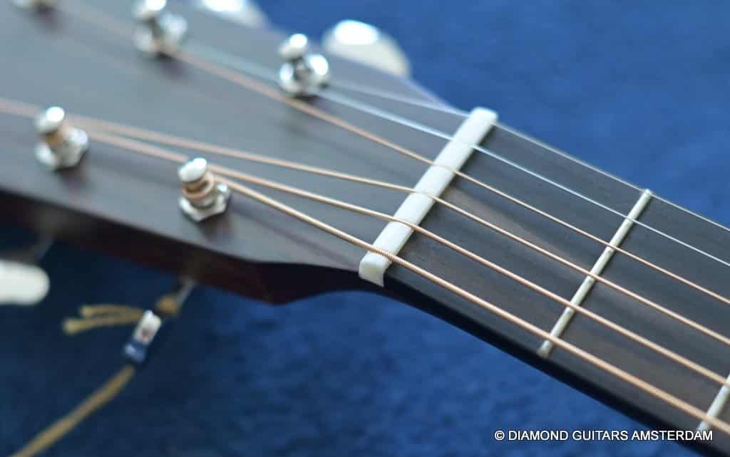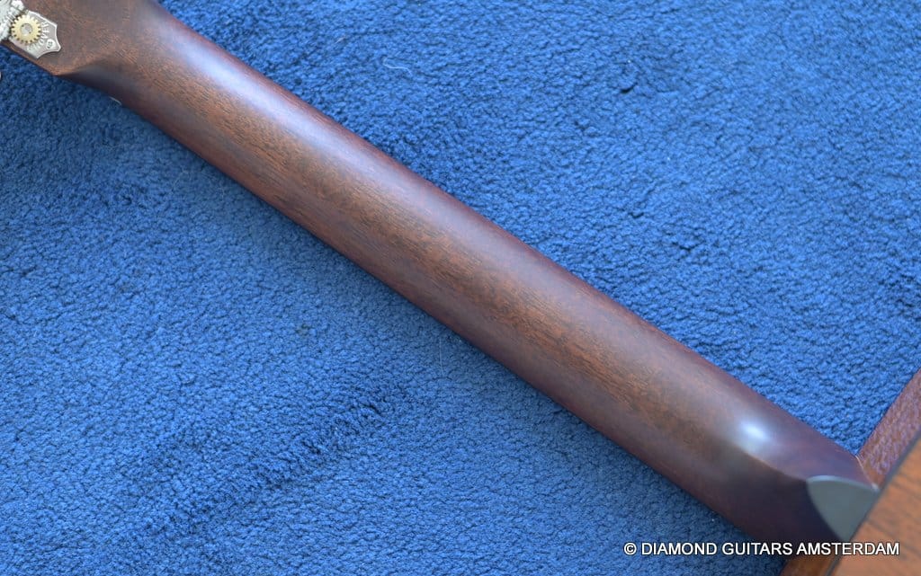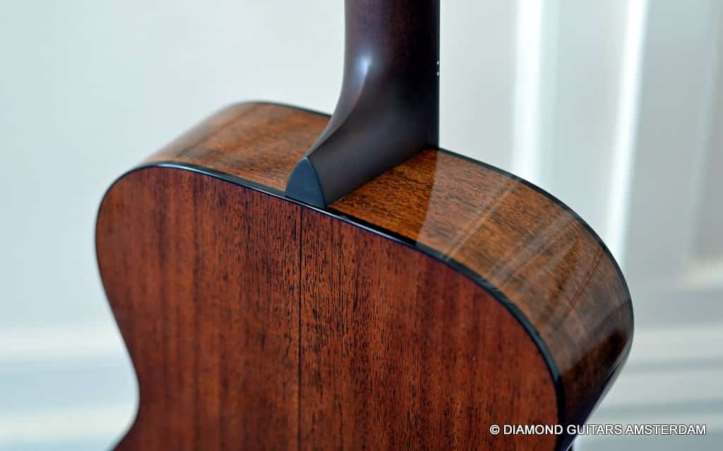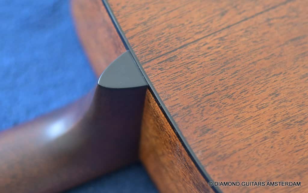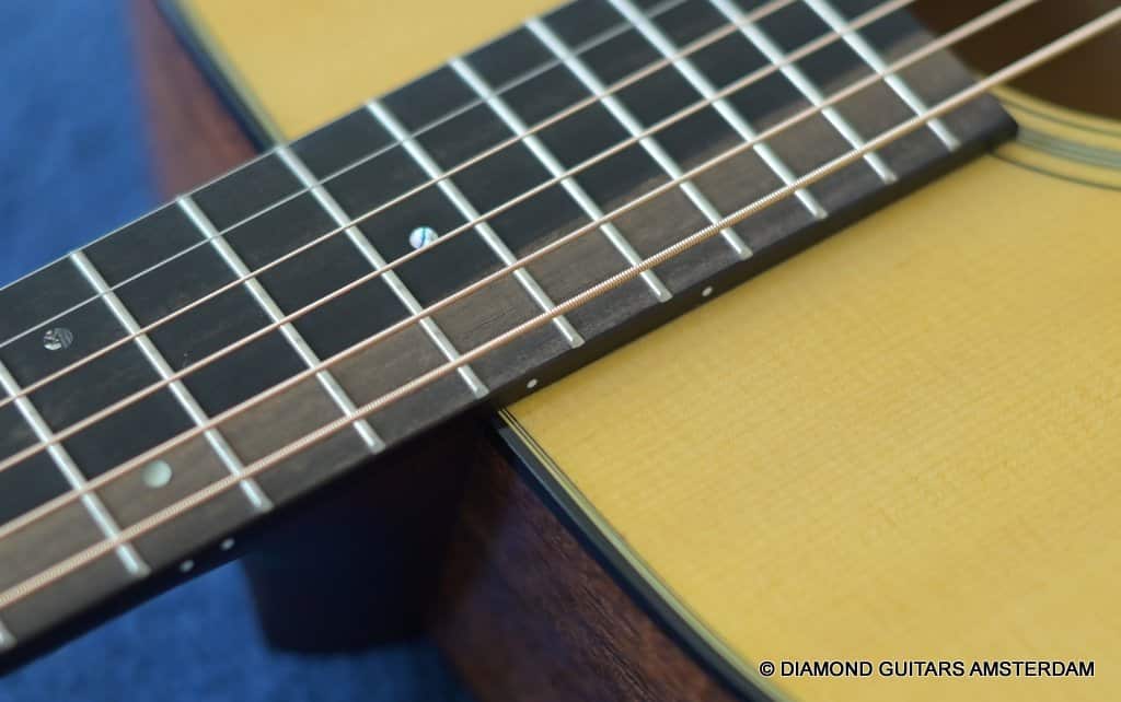 For flatpicked lead lines and fingerpicking the 000-18 works amazingly well, and it’s no slouch in the strumming department either. Her body shape makes this fine acoustic guitar very comfortable and tonally balanced. The proven wood combination of Sitka Spruce for the top and Genuine Mahogany for the back and sides ensures a warm, differentiated sound. She plays comfortably thanks to the modified low oval neck profile. For a subtle vintage look, the top is finished with a slightly golden yellow aging toner. Open tuners and the Script Old Style logo on the headstock also support the look. When played with delicacy, arpeggios notes roll out defined and delicate. Because of the shorter scale length, the string tension is a tad lower, making string bending a bit easier. That is why 000-models are favored by blues players like Elisabeth Cotten, Lonnie Johnson and also Eric Clapton.