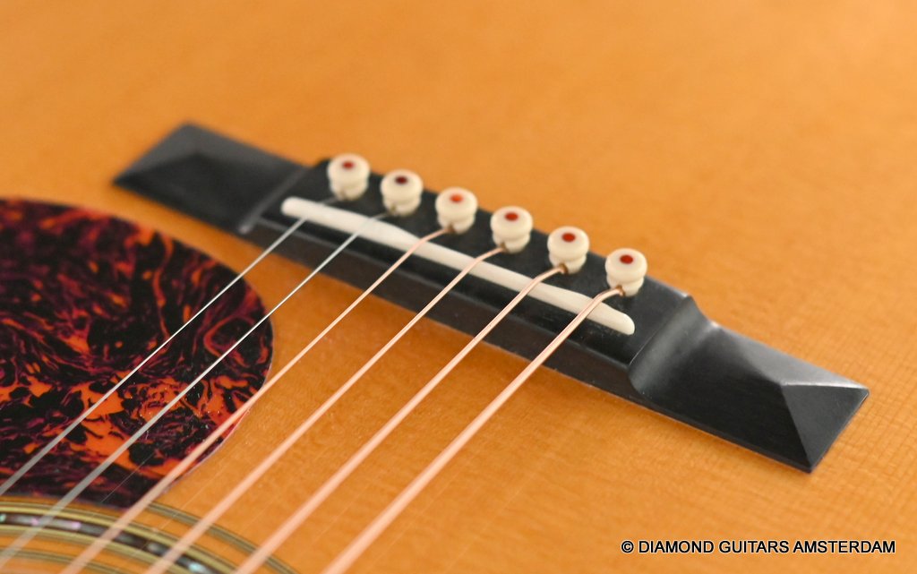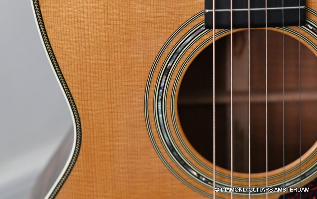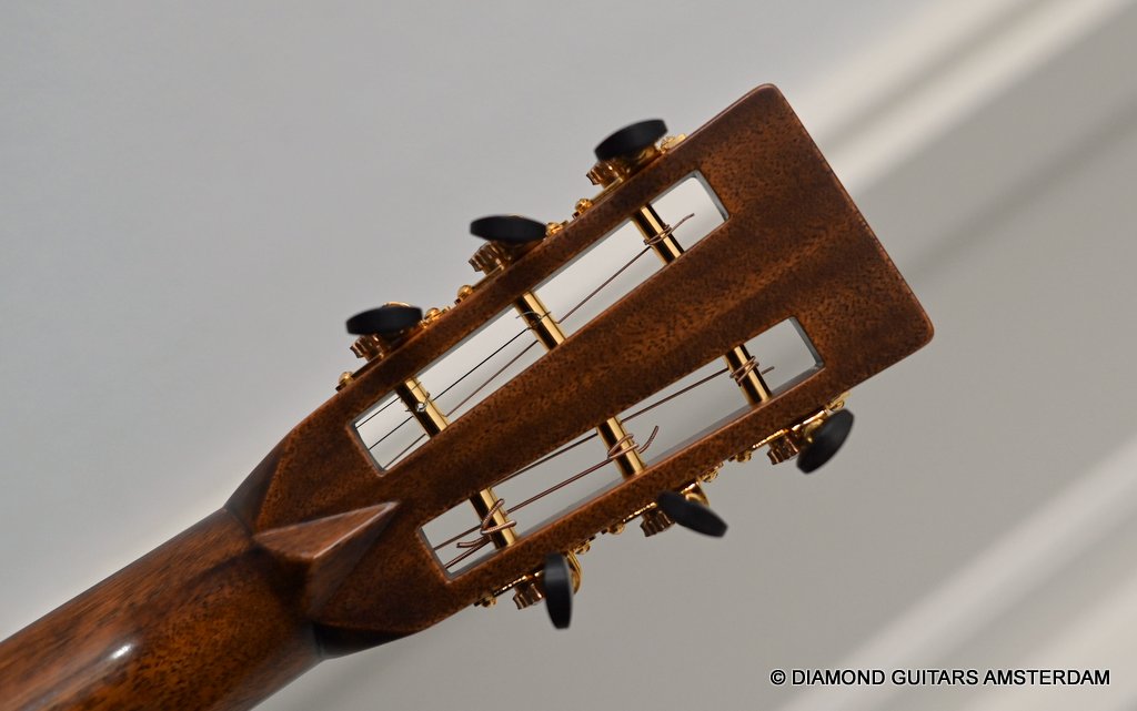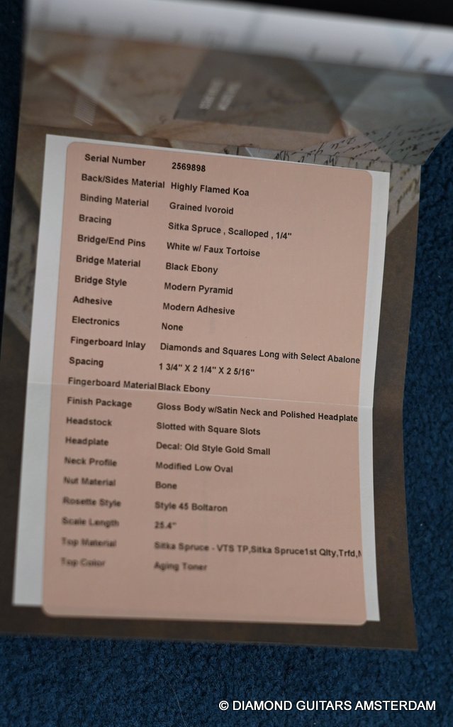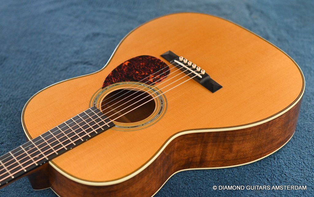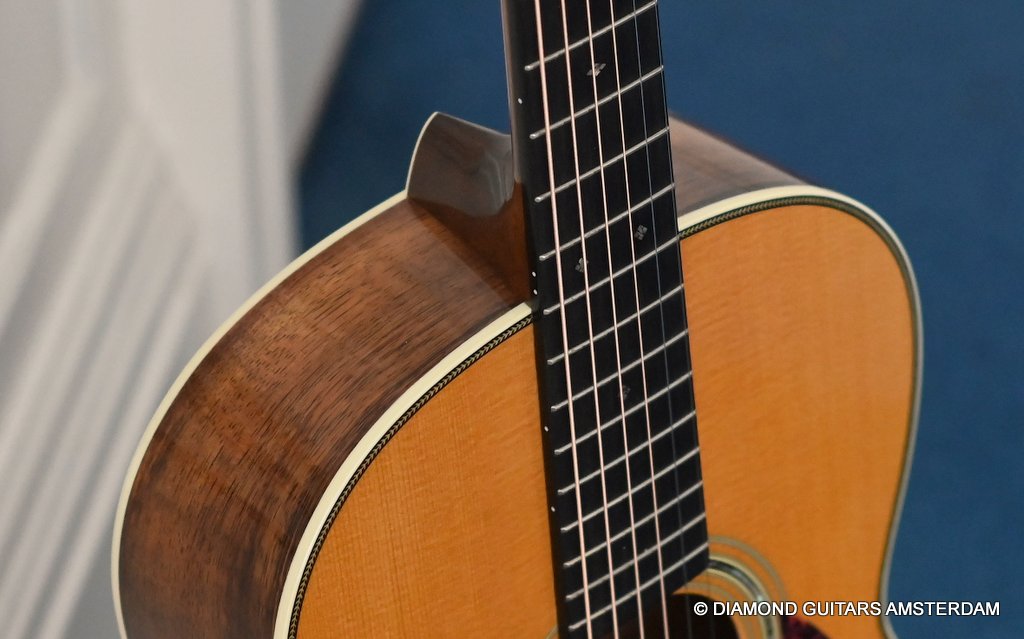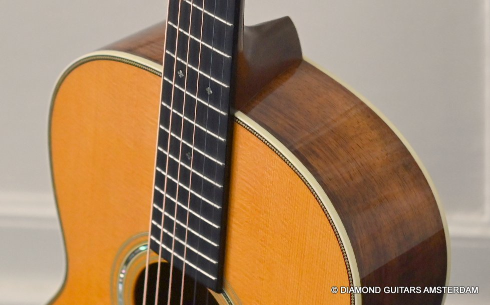 This Martin 000-28S Custom is build with a premium and VTS Sitka Spruce top and Premium flamed Hawaiian Koa. And PREMIUM this baby is! What a tone! Warm sound with complex overtones. And awesome dynamics going from almost silent to very loud accompanied by an awesome sustain. Notes just keep on ringing! She shows the level of tonal enhancement when Martin uses premium tonewood. And moreover, the Hawaiian Koa is beyond spectacular with the book matched Tiger stripe pattern.