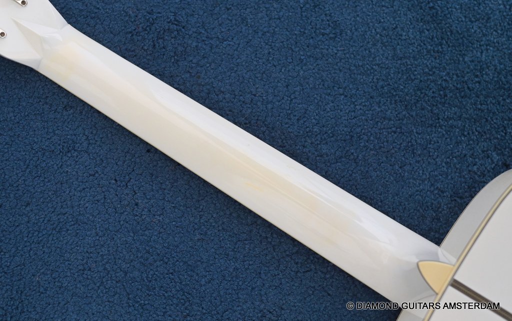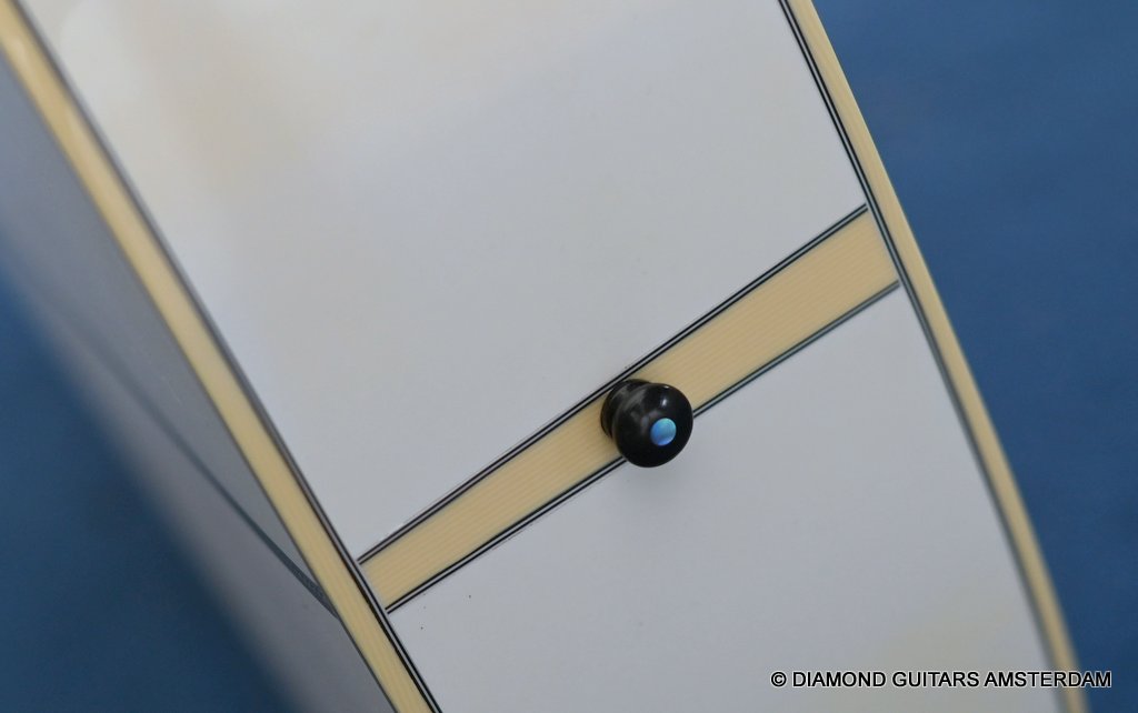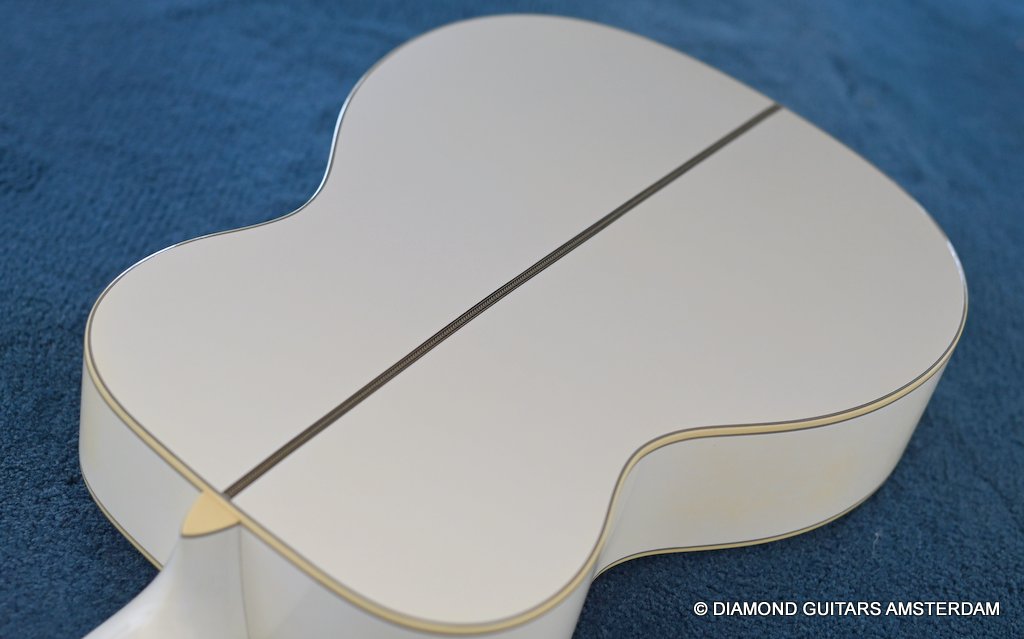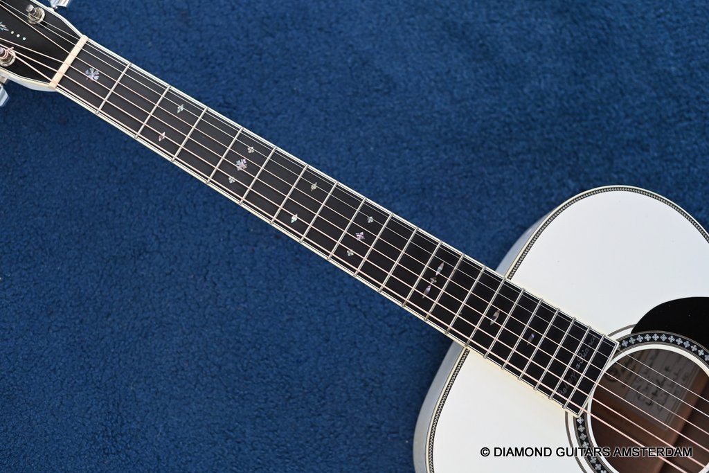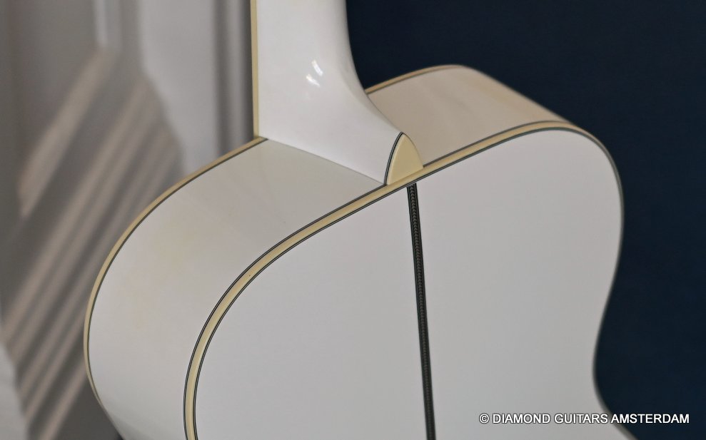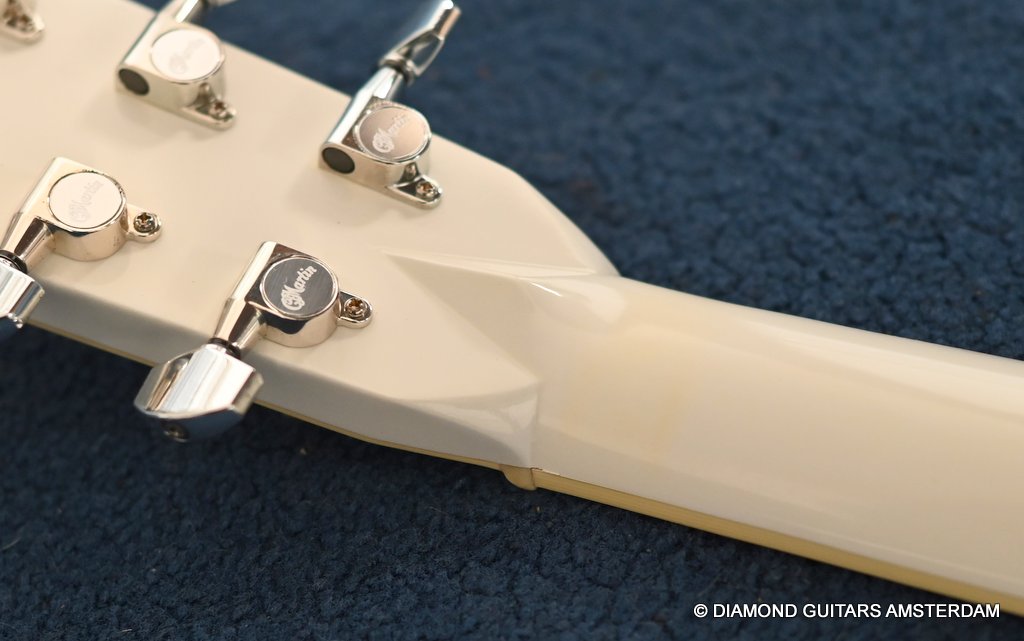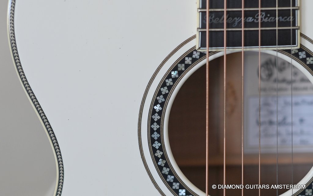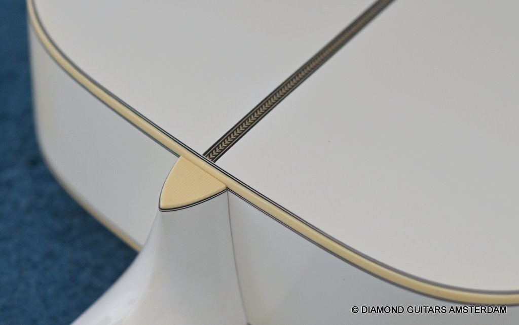 This rare Martin 000-ECHF Bellezza Bianca Eric Clapton Limited Edition made in 2006, bearing serial # 357 of 410, is Martin’s all White w/black trim version of the ever popular “Eric Clapton” 000-28 model, its black & white herringbone trim becomes magical against the white finish. Based on the 14-fret 000 guitar body, the Martin 000-ECHF Bellezza Bianca uses a solid Engelmann Spruce top and Big Leaf Maple for the back and sides. The body blocks and diamond-volute, vintage V-profile neck are Honduran Mahogany. A classic Torch style inlay in Abalone and other Shell adorns the headstock. The rosette also features ‘slotted Abalone diamond’ inlays on a black ring. Between the last two frets, “Bellezza Bianca” is inlaid in Mother of Pearl. The finish is a gloss white Nitrocellulose lacquer, and slightly yellowed Ivoroid binding encircle the guitar’s top, back, fingerboard and headstock.