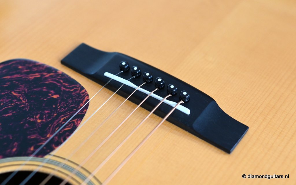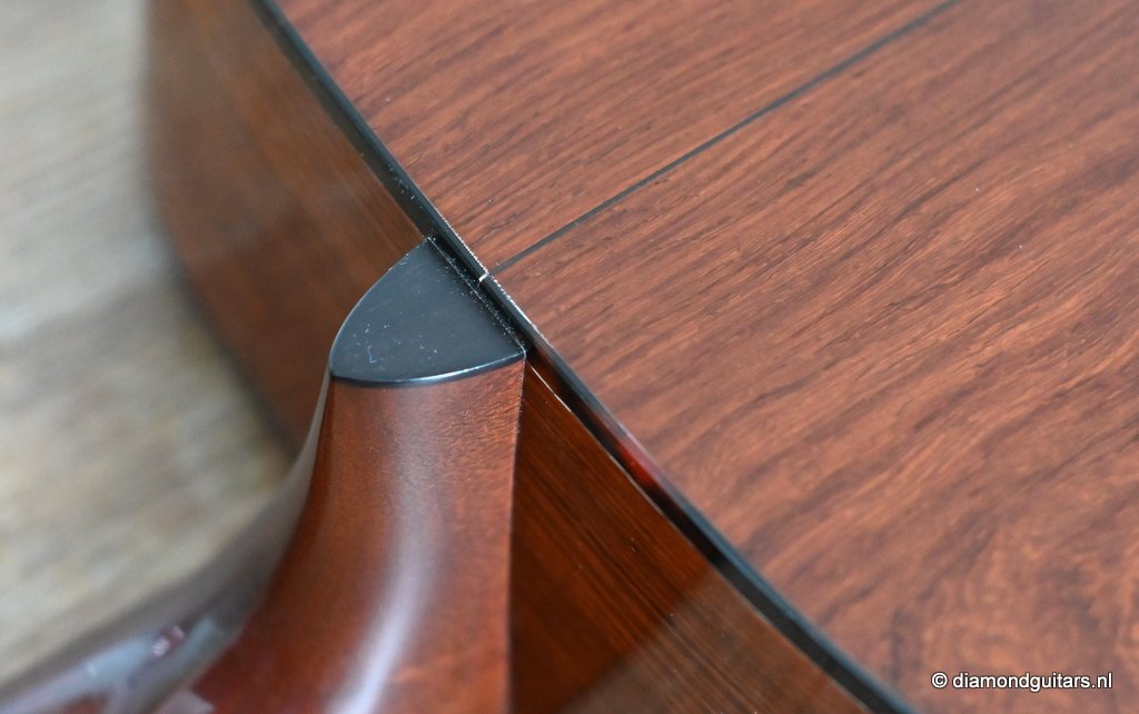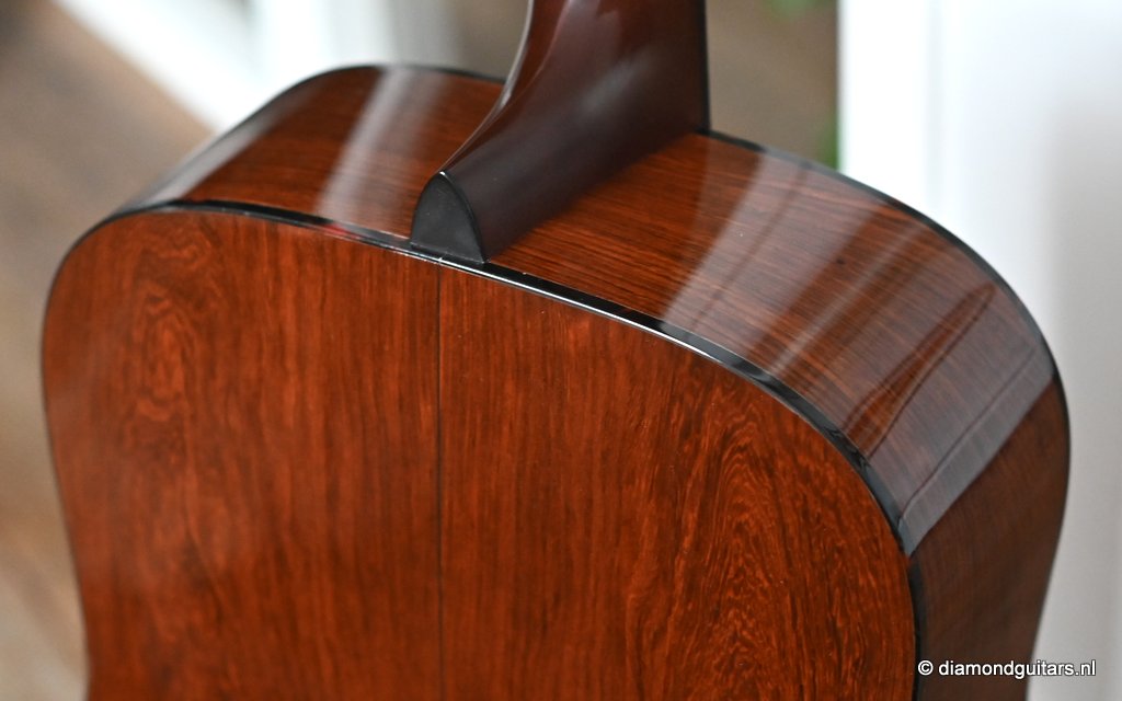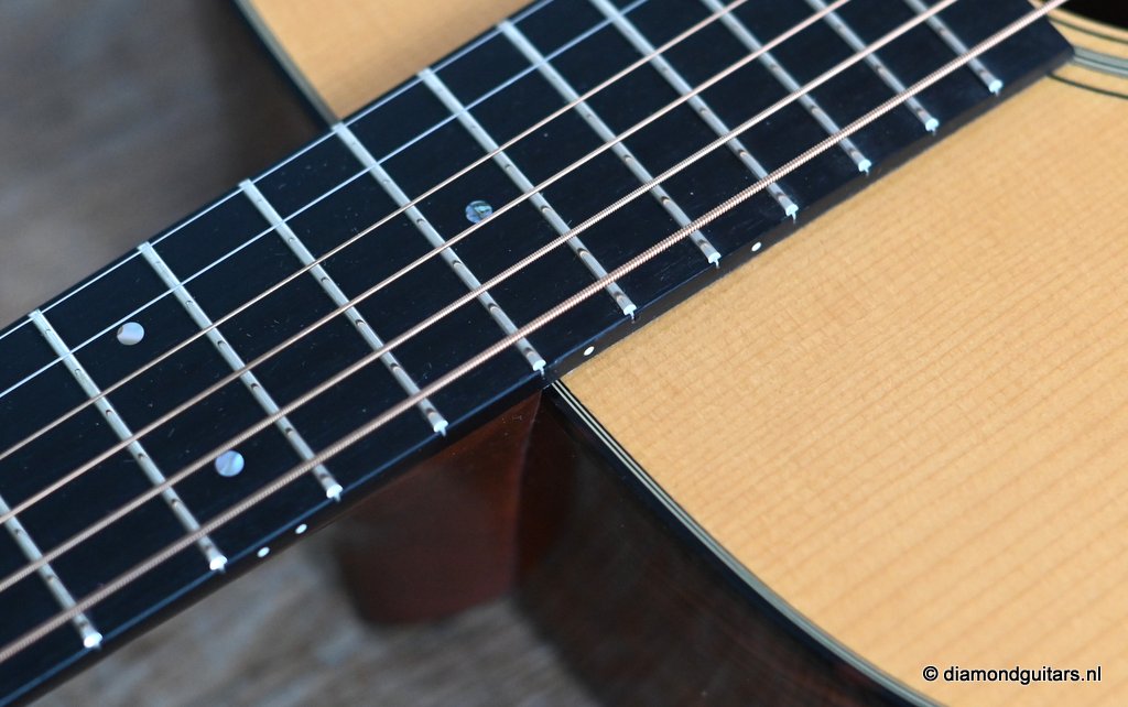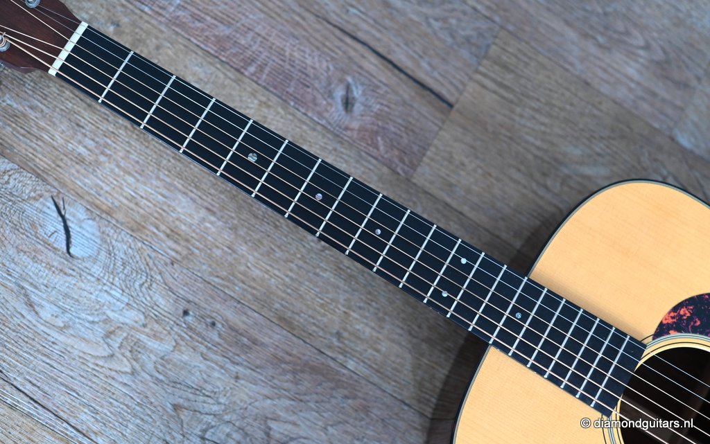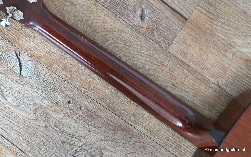 The neck is C-shaped with a 1-11/16 or 43 mm nut width. Very comfortable to play, fast neck. Excellent tone w/fingers or pick.The ideal guitar for someone interested in flatpicking or seriously loud strumming! Her condtion is excellent. Only a few dings on the top and some angel hair marks. Frets are in excellent shape and good for many more miles. Listen to the sound impression here:
