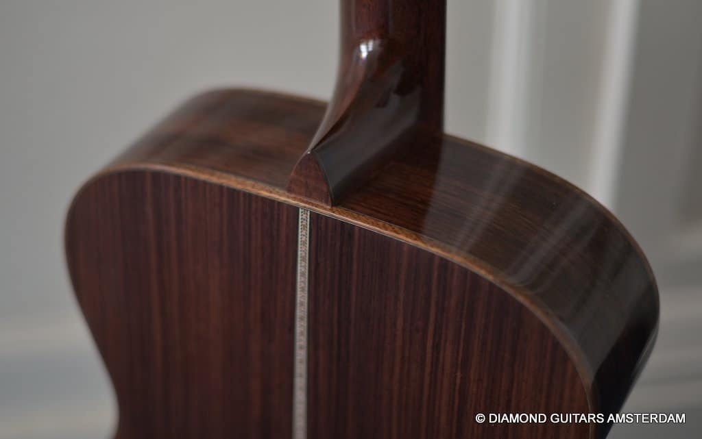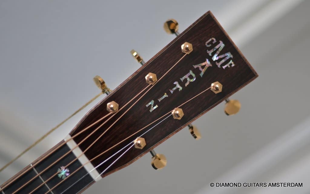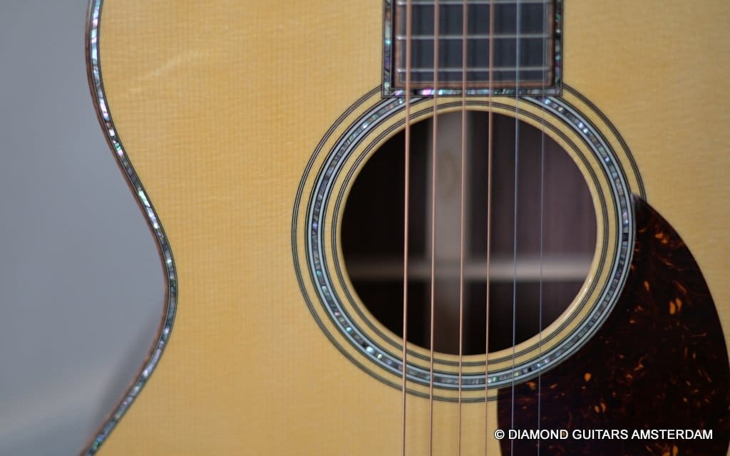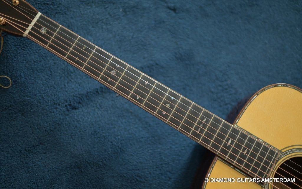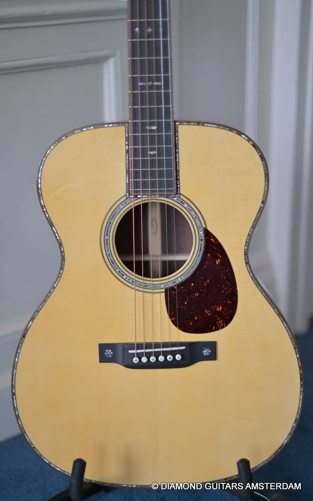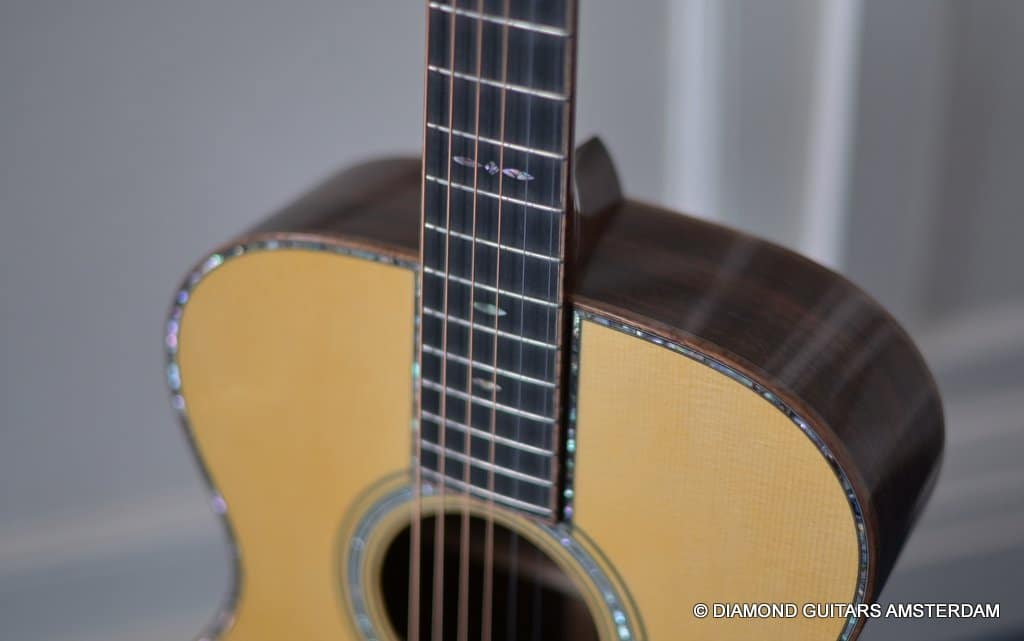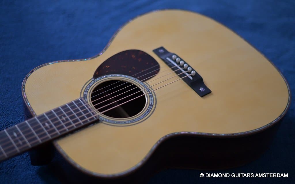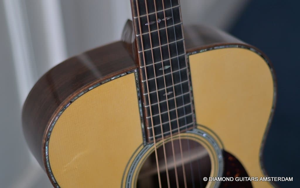 Alpine Spruce is a tonewood with probably the longest tradition in music instrument making, having been used in making guitars, violins, and pianos for centuries. This revered tonewood features exceptional stiffness together with low density, and thus a great foundation for a great guitar sound. The sound properties are well-balanced between pure notes and power to harmonic and dynamic. At present, Alpine Spruce is an exclusive material because it is difficult to find wood with the premium grade needed to ensure the premium quality of the Martin Custom Shop guitars. As to the tonal qualities, one can say the Indian Rosewood give the ‘reverby’ sound to the warmth, complexity and overtones of the sound of this guitar. And because of the longer scale length compared to the 000 this model the tone is a little tighter, louder and more brilliant. That is why guitarists like Eric Clapton and John Mayer love this model!