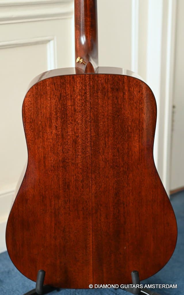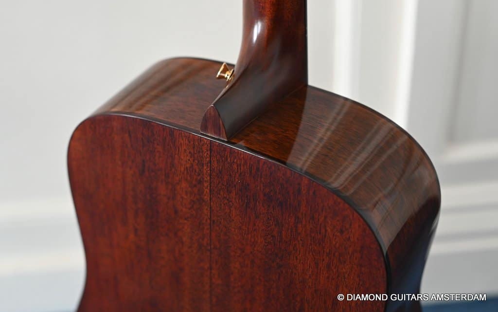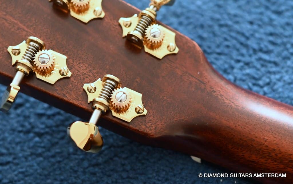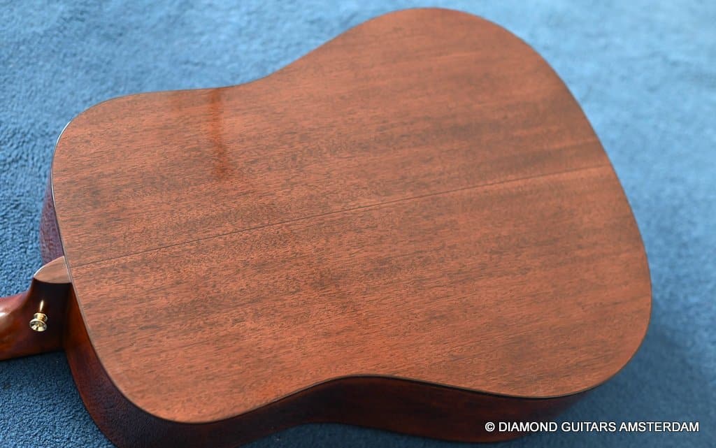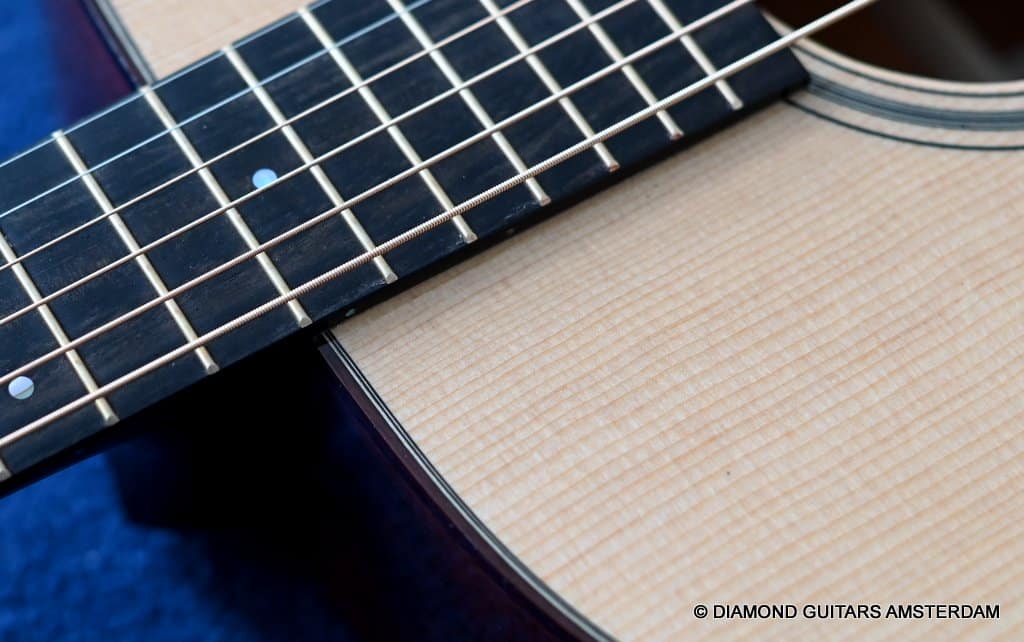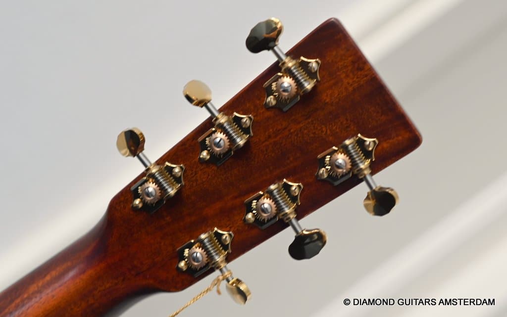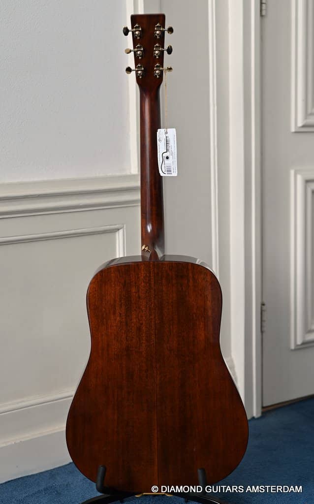 This Martin D-18E Modern Deluxe combines traditional design with contemporary features. The Sitka Spruce top is aged for Vintage tone (VTS-treatment). Back and sides are genuine Mahogany and all is constructed using natural protein glues. Like vintage D-18s, the instrument has an Ebony fingerboard and bridge and Adirondack scalloped, forward-shifted X-bracing. In addition, Martin’s contemporary High Performance Taper neck, the D-18E Modern Deluxe has a composite carbon-fiber bridge plate and a hybrid titanium-steel truss rod to keep the weight down as well as JesCar EvoGold frets, Liquidmetal bridge pins, Abalone position markers, Diamonds and Squares long pattern fretboard inlay, European flamed Maple binding and an Abalone Martin script logo in the headstock.