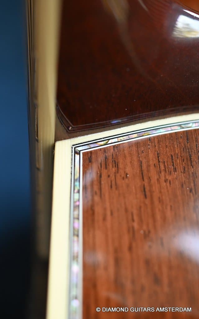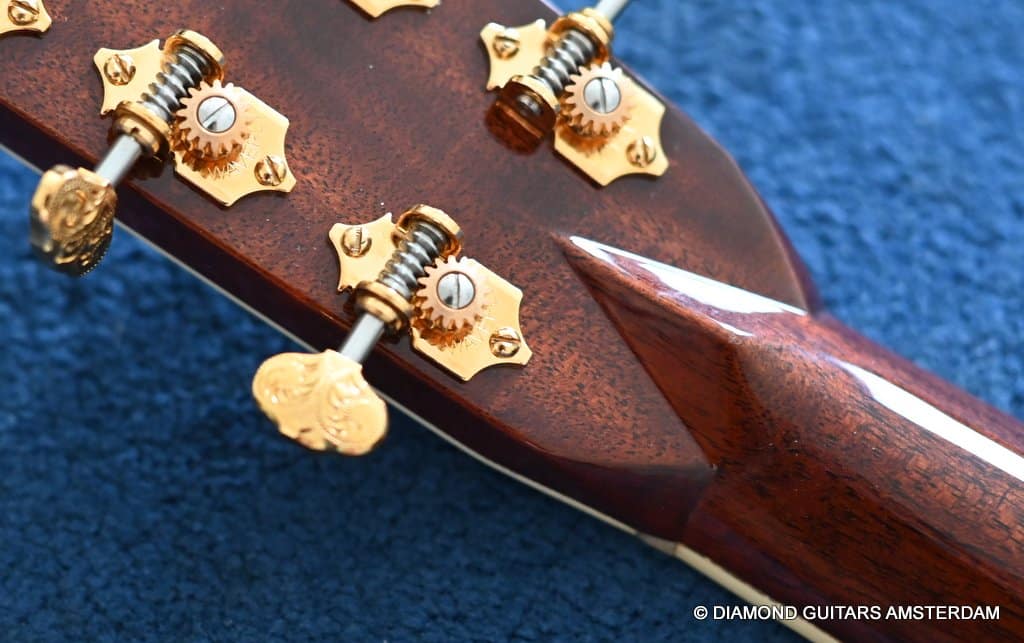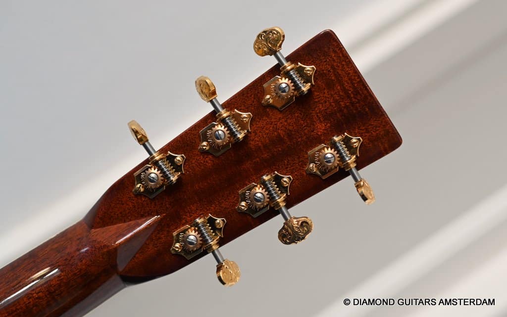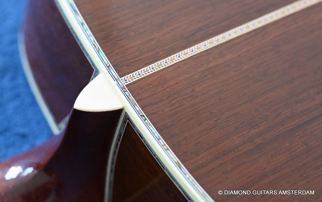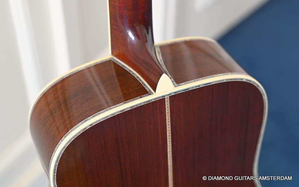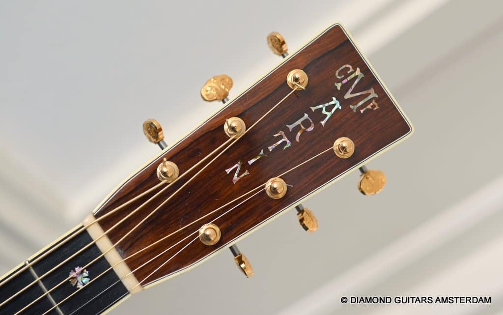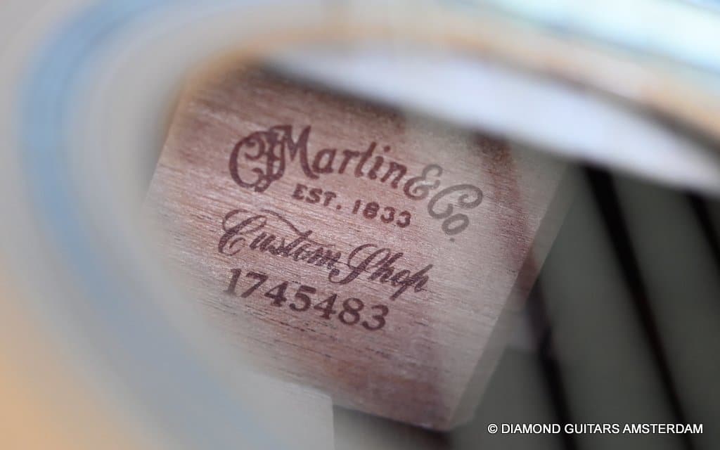 This awesome Martin D-45 Custom has it all. Superb looks and even more important: from a tonal point of view, I doubt if it gets better besides the pre-war sisters. This one is amongst the best of the best: very well-balanced notes all over the fretboard. Flatpicking, strumming and fingerpicking, this magnificent instrument will overwhelm you with inspiration and lead you to new musical horizons. Martin uses the term Golden Era for a variation of their Scalloped Bracing. This type of Scalloping is more aggressive compared to a standard scallop. With Golden Era Scalloping, there is more wood shaved from the Braces and the X brace is a little tighter fit. This variation of scalloping helps the tone and responsiveness, by letting the top vibrate more freely. She also has the pre-war all Mahogany ‘Full Thickness- 30’s Style Heel’ neck with the T-bar instead of the adjustable truss rod. This neck is comparable with the modified low ovel in the lower regions and comes close to the ‘Classic’ neck profile above the 10th fret. No more adjustments of the neck, whatever the condition. This baby won’t bend and thus direct all the energy of the strings to the bridge and then straight into the top. Incredible dynamic tone! Whether you play gentle or loud, she always gives that lush rich Dreadnought tone only Martin can build.