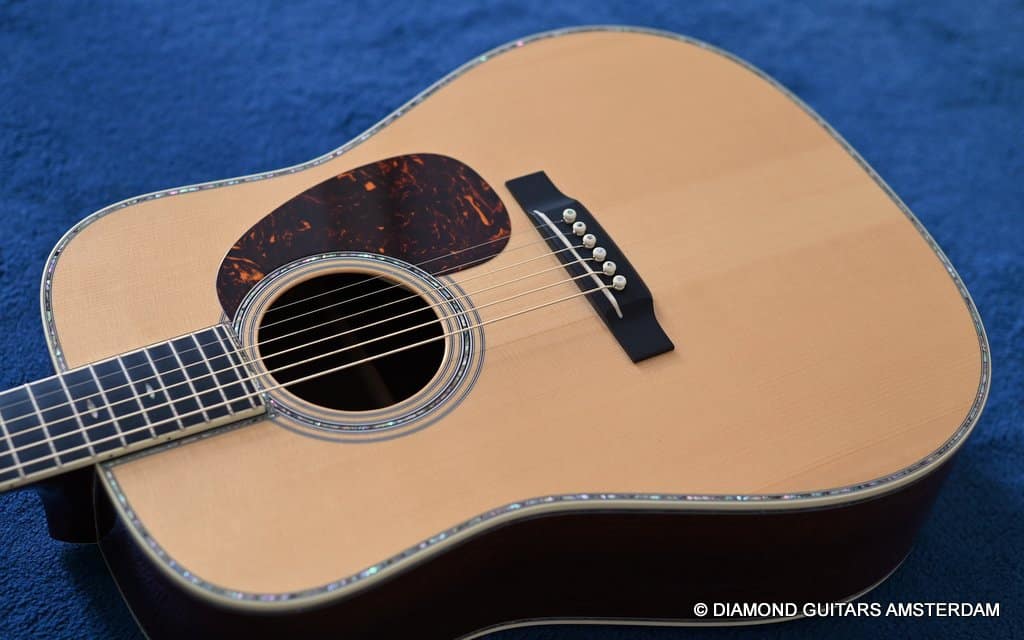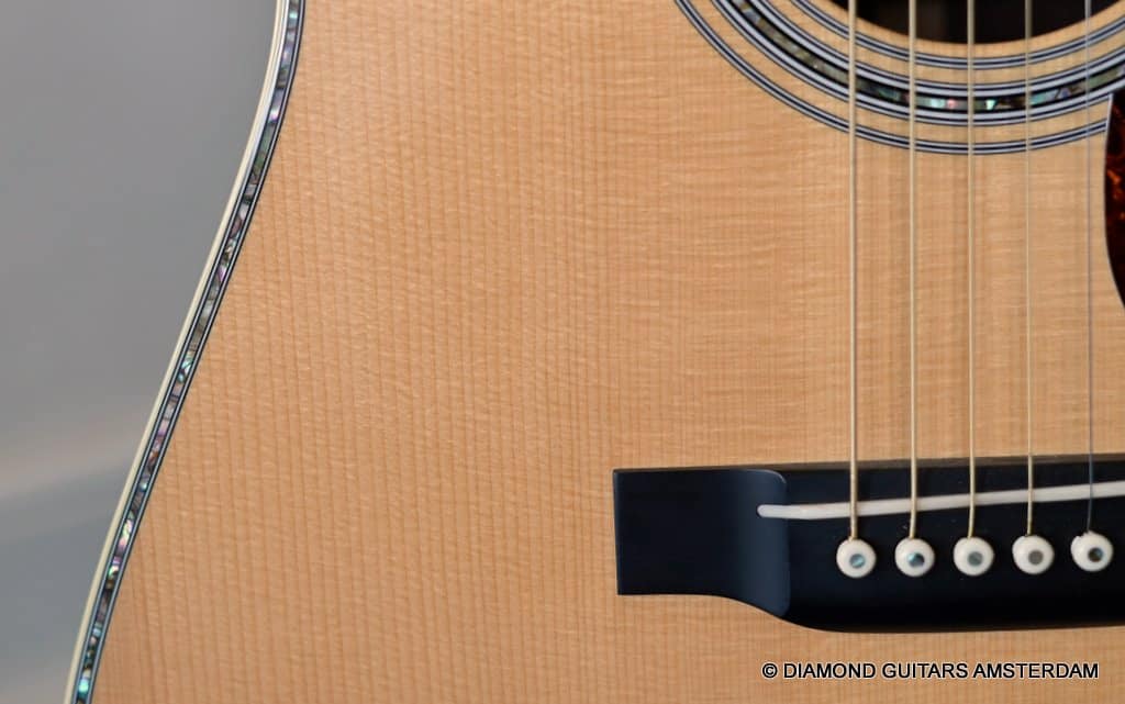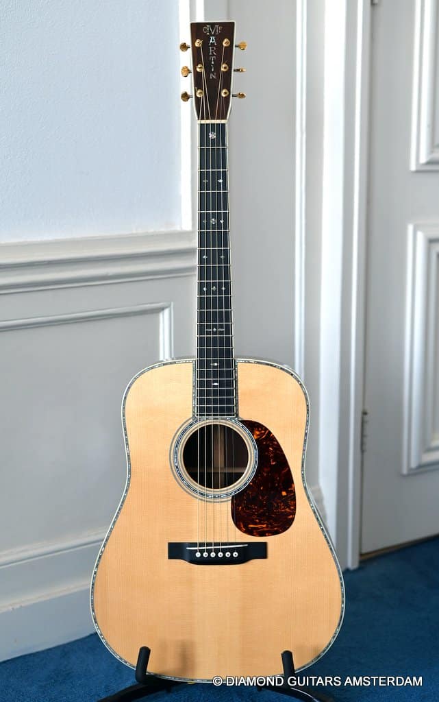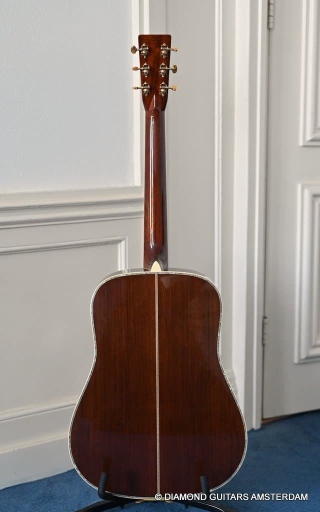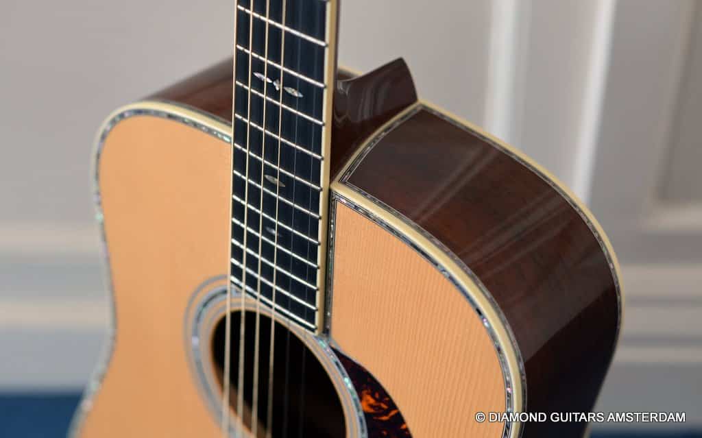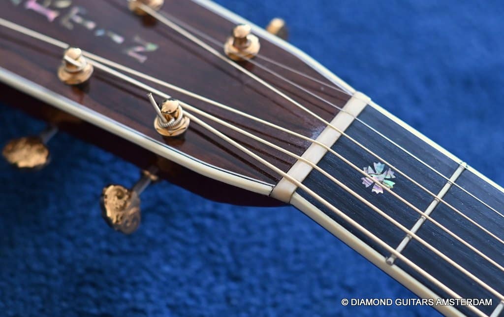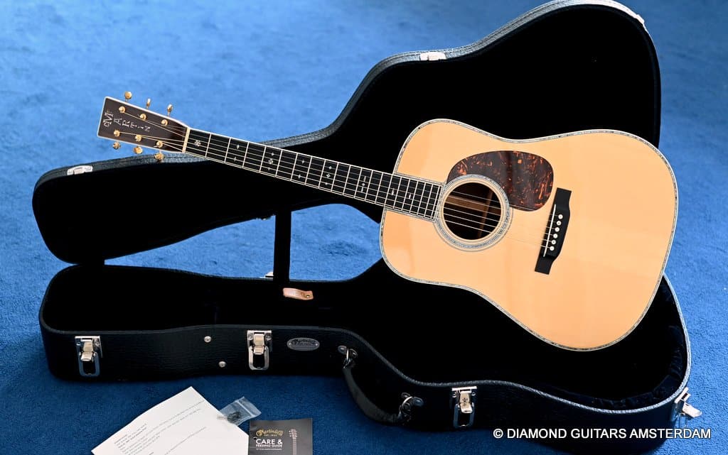 This awesome Martin D-45 Custom has it all. Superb looks and even more important: from a tonal point of view, I doubt if it gets better besides the pre-war sisters. This one is amongst the best of the best: very well-balanced notes all over the fretboard. Flatpicking, strumming and fingerpicking, this magnificent instrument will overwhelm you with inspiration and lead you to new musical horizons. Martin uses the term Golden Era for a variation of their Scalloped Bracing. This type of Scalloping is more aggressive compared to a standard scallop. With Golden Era Scalloping, there is more wood shaved from the Braces and the X brace is a little tighter fit. This variation of scalloping helps the tone and responsiveness, by letting the top vibrate more freely. She also has the pre-war all Mahogany ‘Full Thickness- 30’s Style Heel’ neck with the T-bar instead of the adjustable truss rod. This neck is comparable with the modified low ovel in the lower regions and comes close to the ‘Classic’ neck profile above the 10th fret. No more adjustments of the neck, whatever the condition. This baby won’t bend and thus direct all the energy of the strings to the bridge and then straight into the top. Incredible dynamic tone! Whether you play gentle or loud, she always gives that lush rich Dreadnought tone only Martin can build.