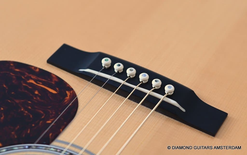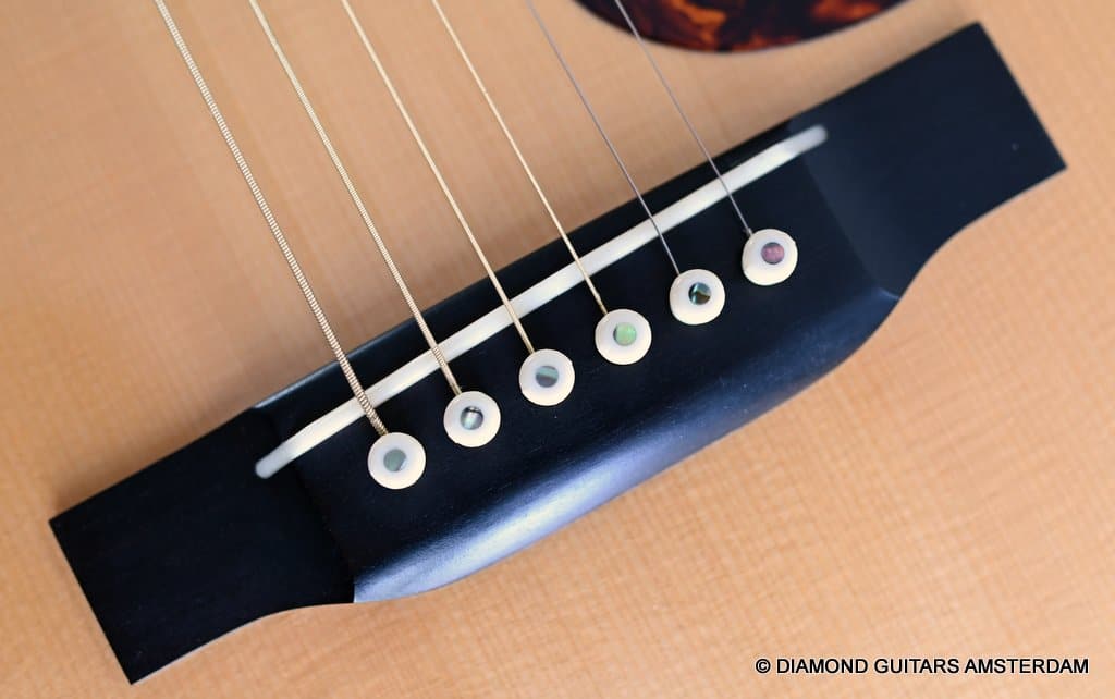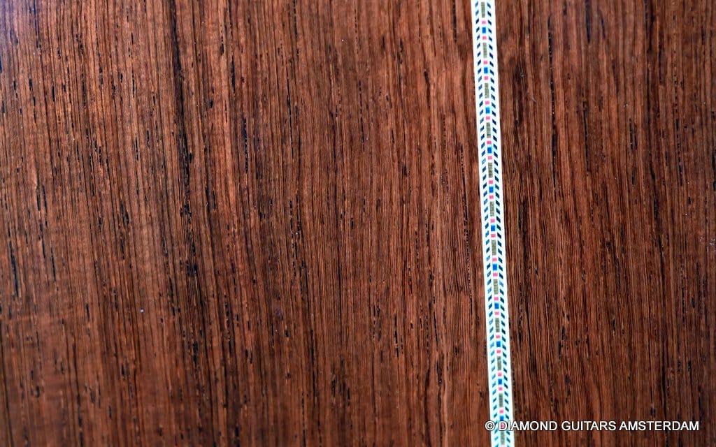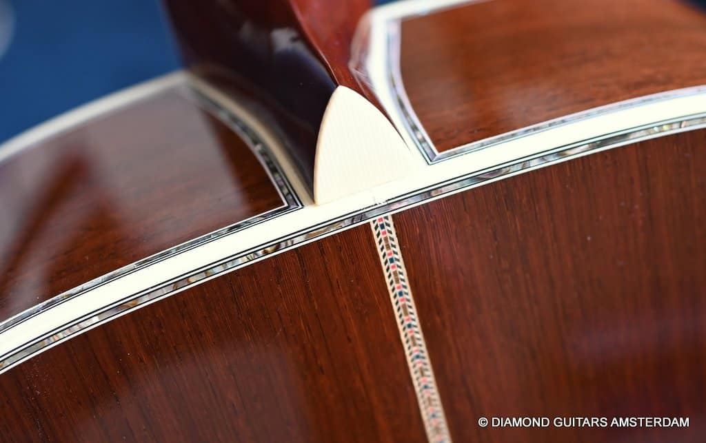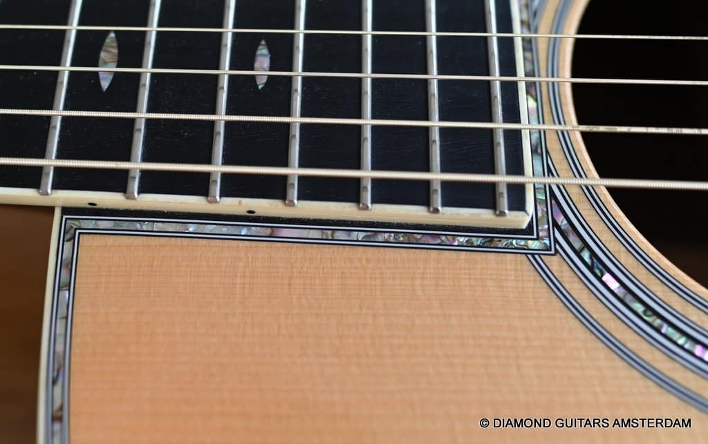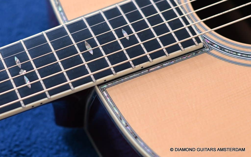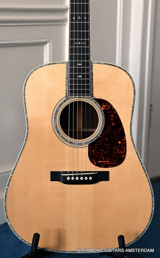 This awesome Martin D-45 Custom has it all. Superb looks and even more important: from a tonal point of view, I doubt if it gets better besides the pre-war sisters. This one is amongst the best of the best: very well-balanced notes all over the fretboard. Flatpicking, strumming and fingerpicking, this magnificent instrument will overwhelm you with inspiration and lead you to new musical horizons. Martin uses the term Golden Era for a variation of their Scalloped Bracing. This type of Scalloping is more aggressive compared to a standard scallop. With Golden Era Scalloping, there is more wood shaved from the Braces and the X brace is a little tighter fit. This variation of scalloping helps the tone and responsiveness, by letting the top vibrate more freely. She also has the pre-war all Mahogany ‘Full Thickness- 30’s Style Heel’ neck with the T-bar instead of the adjustable truss rod. This neck is comparable with the modified low ovel in the lower regions and comes close to the ‘Classic’ neck profile above the 10th fret. No more adjustments of the neck, whatever the condition. This baby won’t bend and thus direct all the energy of the strings to the bridge and then straight into the top. Incredible dynamic tone! Whether you play gentle or loud, she always gives that lush rich Dreadnought tone only Martin can build.