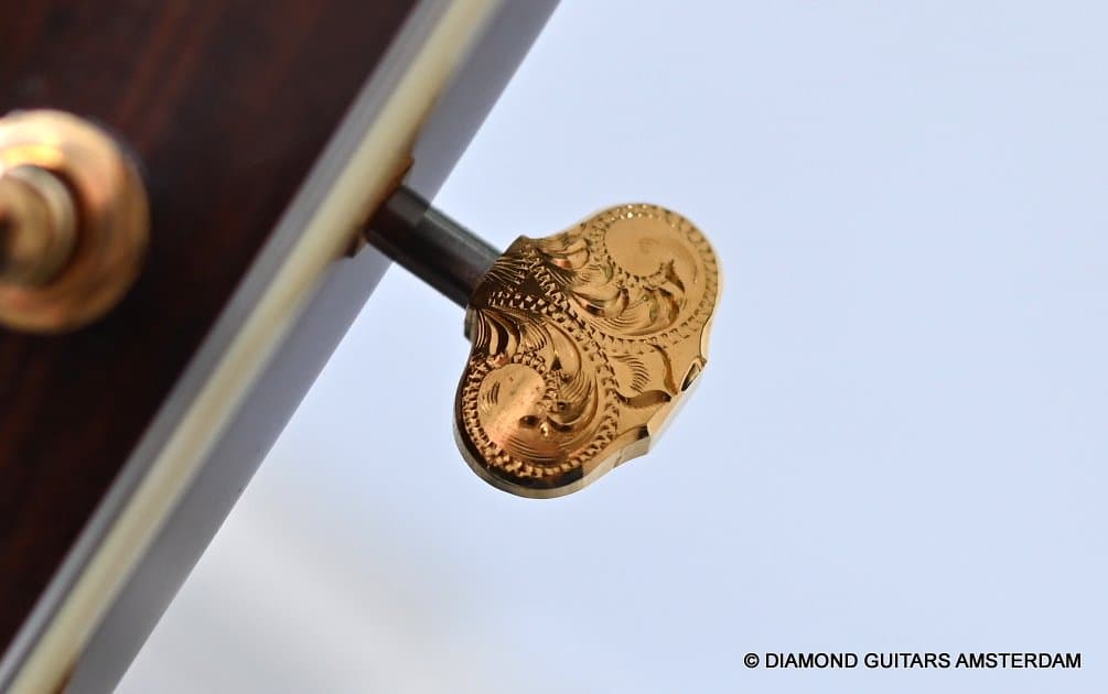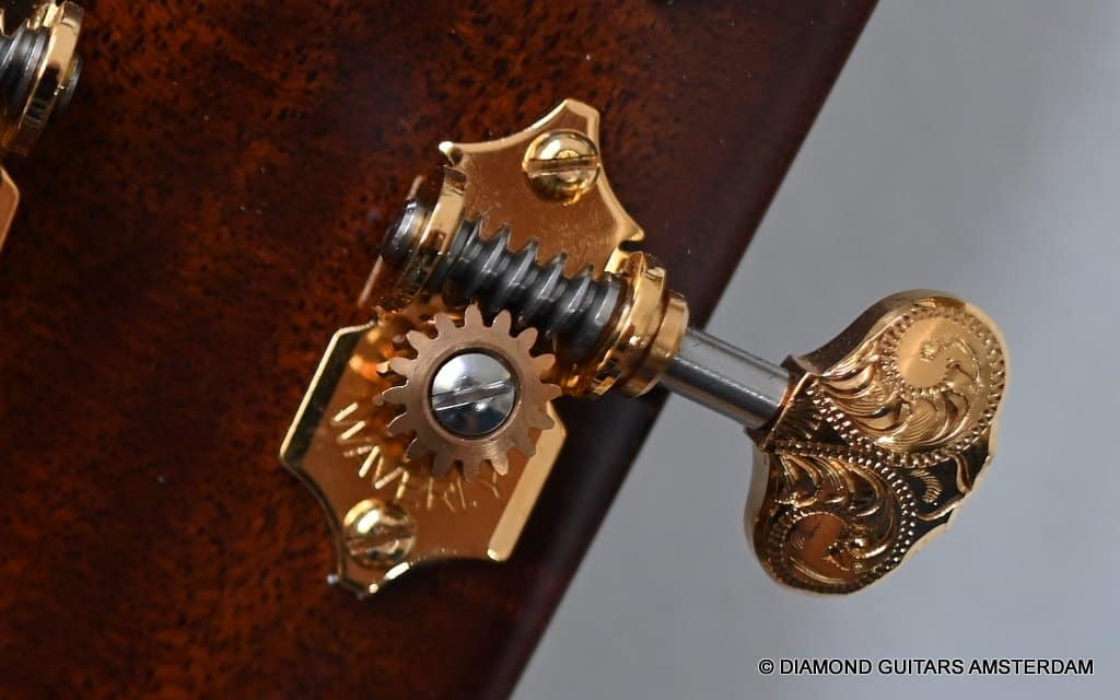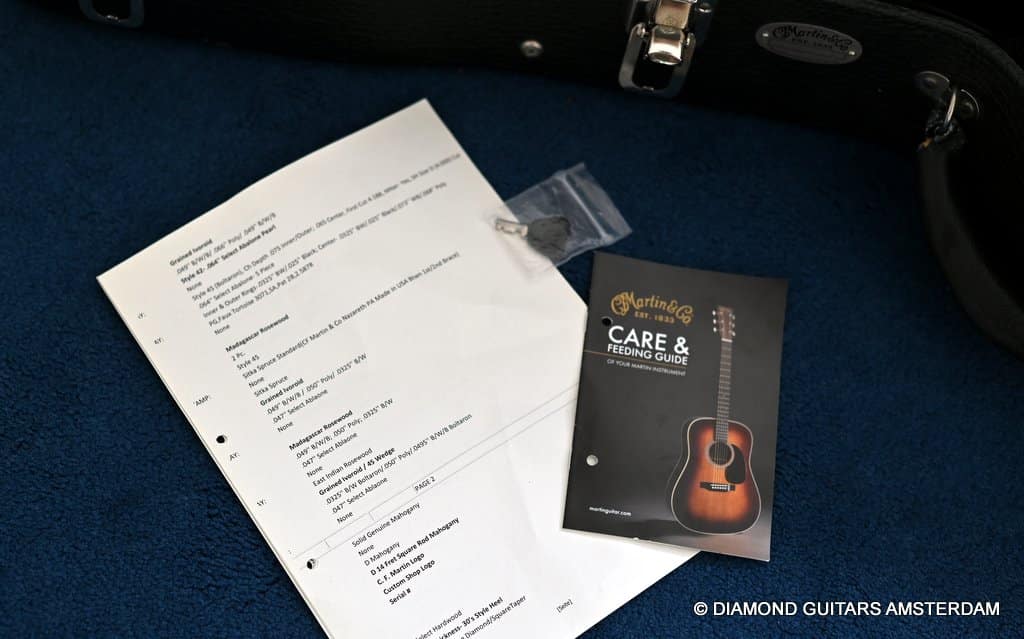 The Adirondack top is top grade – rarely seen these days – tight grain. The straight grain of the back and sides reveal quartersawn Madagascar Rosewood reminding instantly on the pre-war Brazilian Rosewood. The modern Martin D-45 is a distinctive guitar and top of the line. But this D-45 Custom is way above that mark. Premium tonewoods and Golden Era build techniques led to an outstanding guitar in tone and looks. Plus, the bonus hand engraved Waverly gold open back tuners. Sweet! In short, this D-45 Custom is amongst the very best sounding and looking Martin guitars one can get. She is the guitar of choice for legends like Gene Autry and Neil Young, Steven Stills and John Mayer. Even Jimi Hendrix owned and played one back in the days. It’s the perfect guitar for any guitar aficionado & collector. Nice low action. Plays like butter! She has been played in well and shows only slight signs of use. This was not a showpiece hanging on the wall, this baby was played but never abused. Thus, her condition is excellent. Listen to a sound impression here: