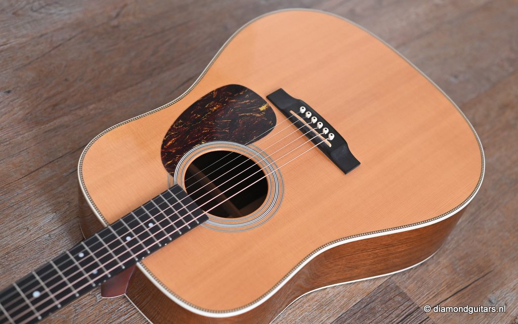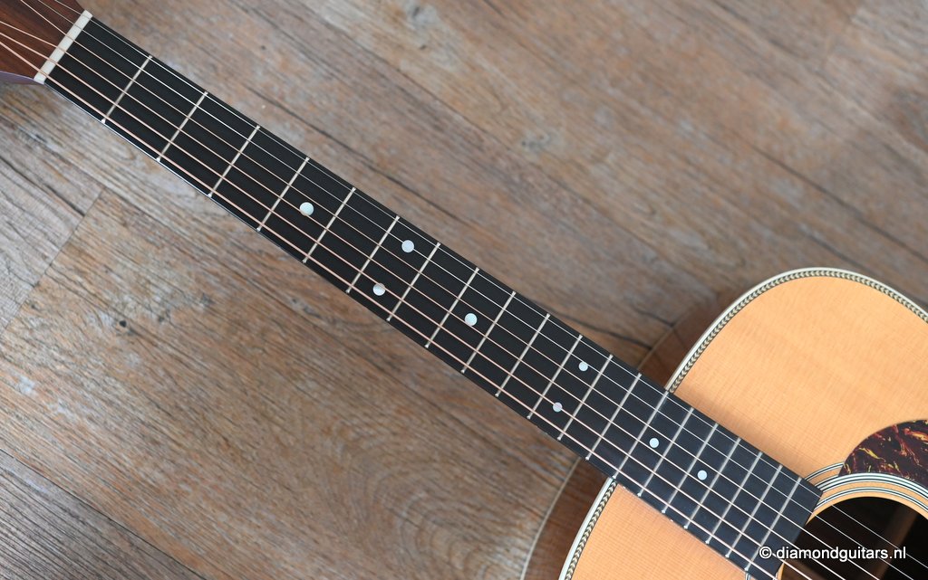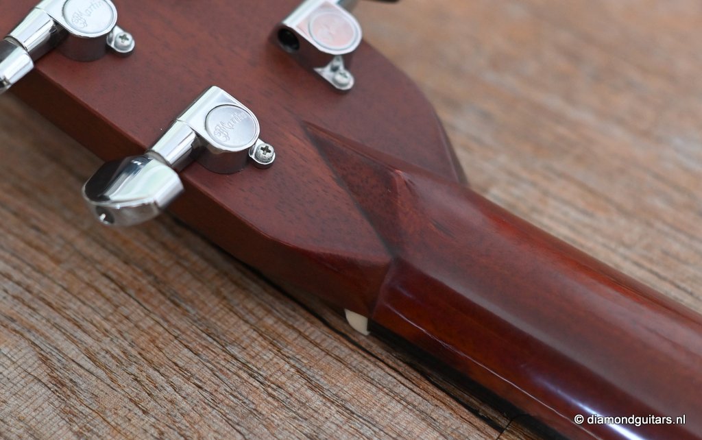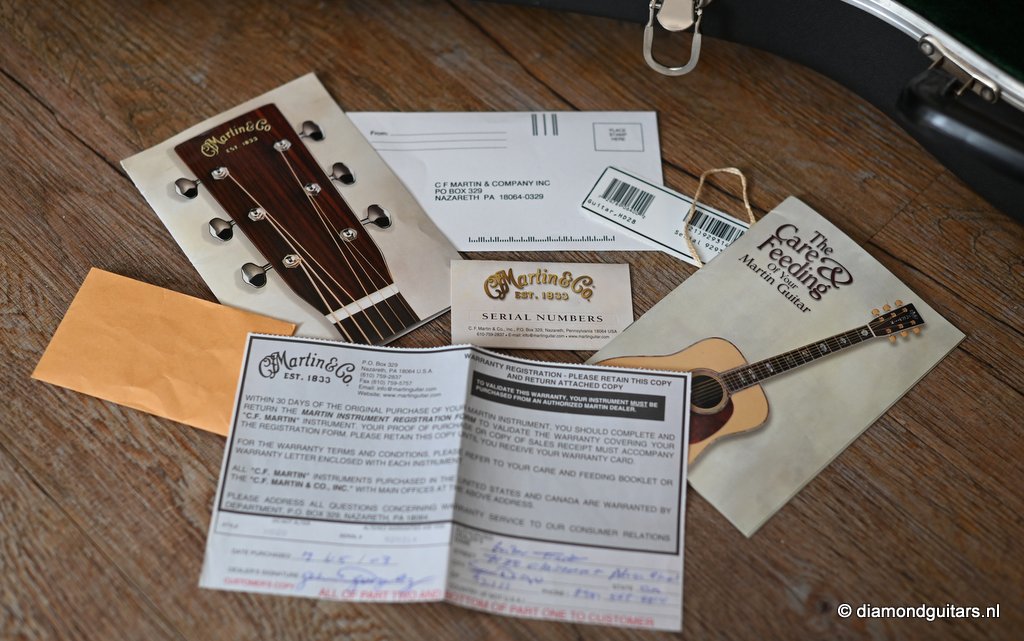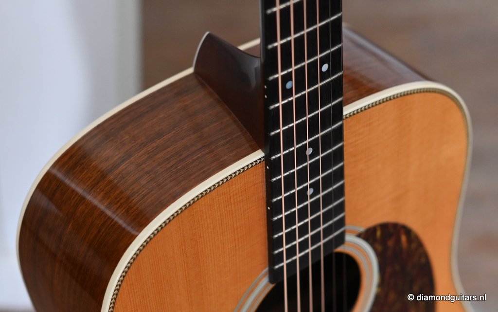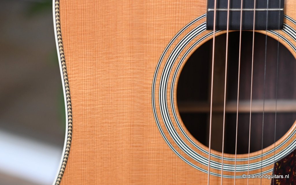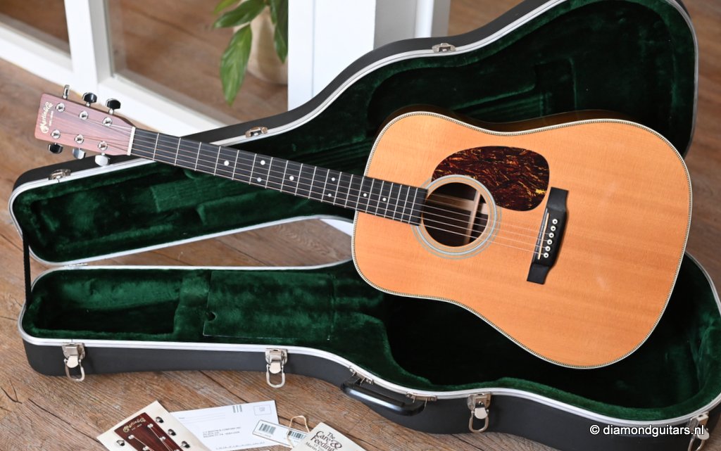 This Martin HD-28 is the last series with the revered standard X-bracing combines the properties of the rear-shifted and forward shifted bracing. This pattern offers the best tonal balance and warmt of the high notes with strong fundamental. Of course this model comes with the classic Herringbone purfling refering to the pre-war specs. The Sitka top aged well and delivers a warm tone. She has excellent volume (it’s still a dread), but with a slightly more focused sound compared to forward-shifted bracing. Notes feel a touch quicker and more direct. Her overtones come with a wonderful harmonic richness. it’s the classic Martin dreadnought tone. Rich and full, but with a tighter low end and a bit more balance across the spectrum. More controlled than the forward-shifted HD-28V/Modern Deluxe, but still warmer and more resonant than a straight-braced D-28.