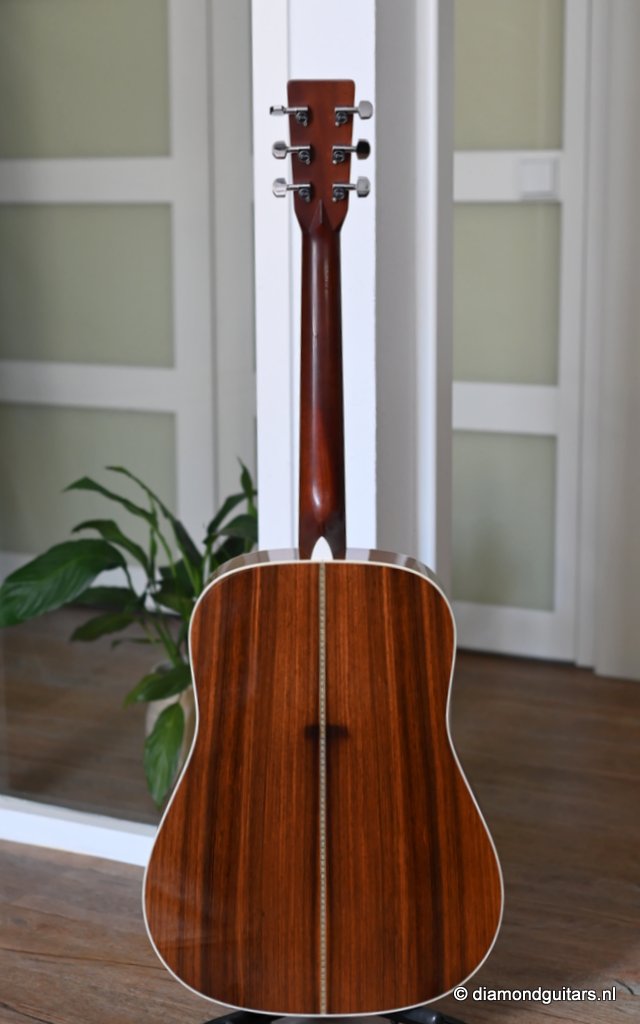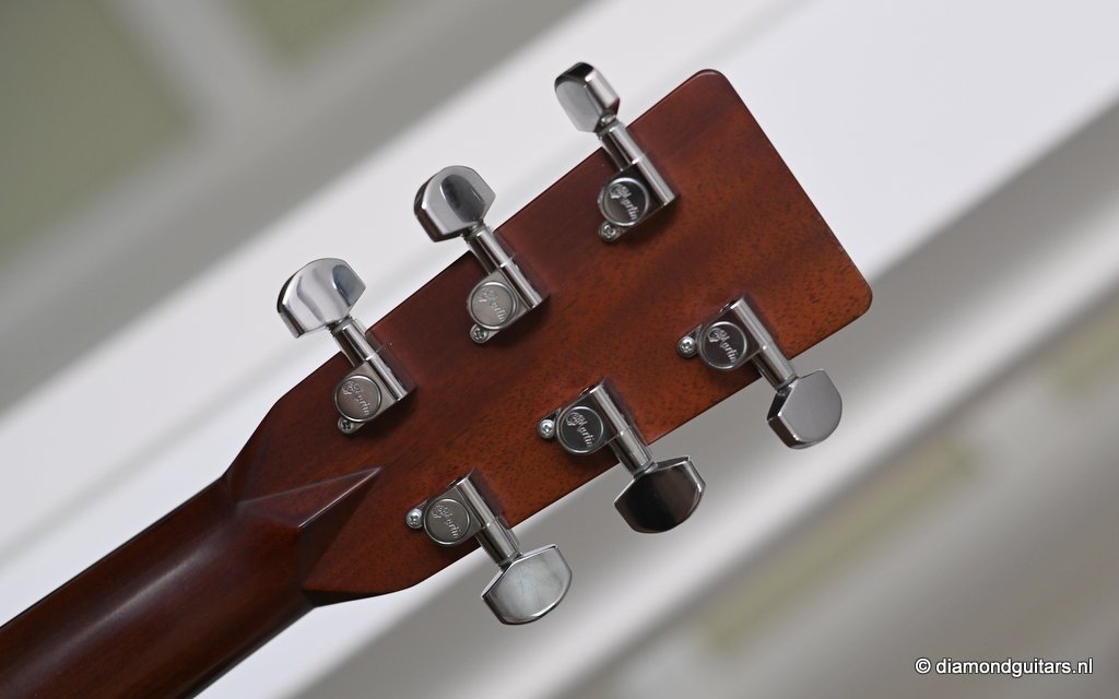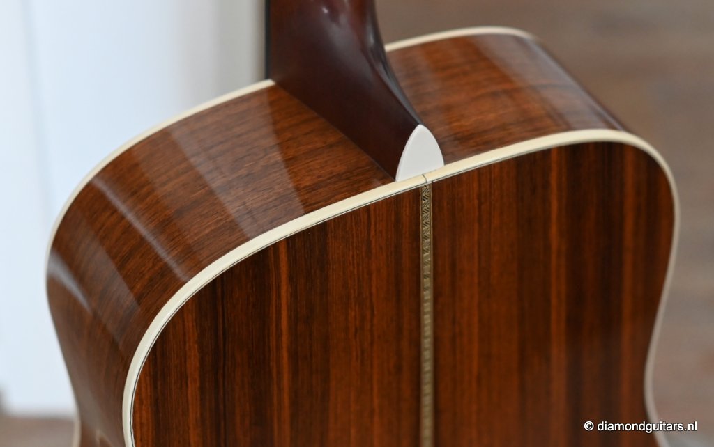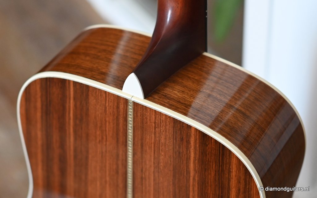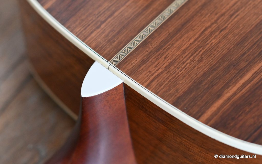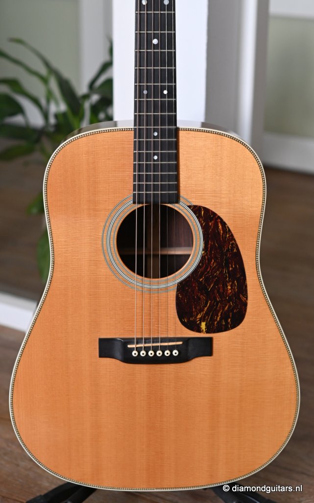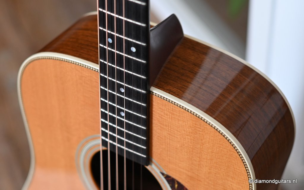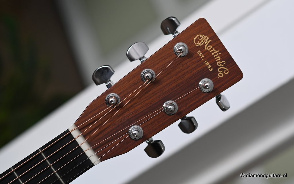 This Martin HD-28 is the last series with the revered standard X-bracing combines the properties of the rear-shifted and forward shifted bracing. This pattern offers the best tonal balance and warmt of the high notes with strong fundamental. Of course this model comes with the classic Herringbone purfling refering to the pre-war specs. The Sitka top aged well and delivers a warm tone. She has excellent volume (it’s still a dread), but with a slightly more focused sound compared to forward-shifted bracing. Notes feel a touch quicker and more direct. Her overtones come with a wonderful harmonic richness. it’s the classic Martin dreadnought tone. Rich and full, but with a tighter low end and a bit more balance across the spectrum. More controlled than the forward-shifted HD-28V/Modern Deluxe, but still warmer and more resonant than a straight-braced D-28.