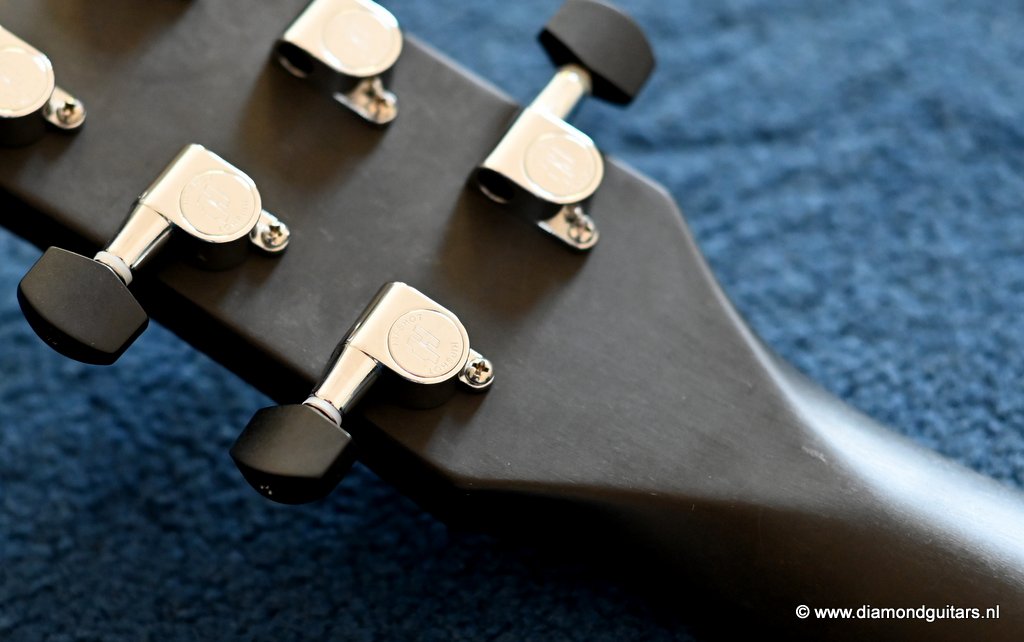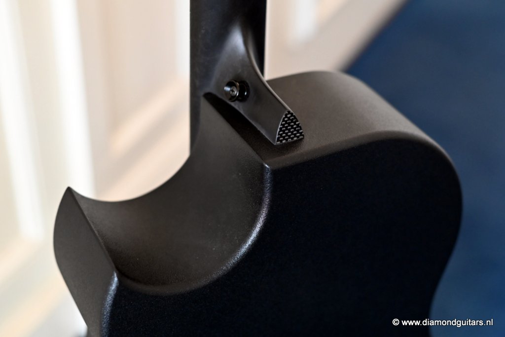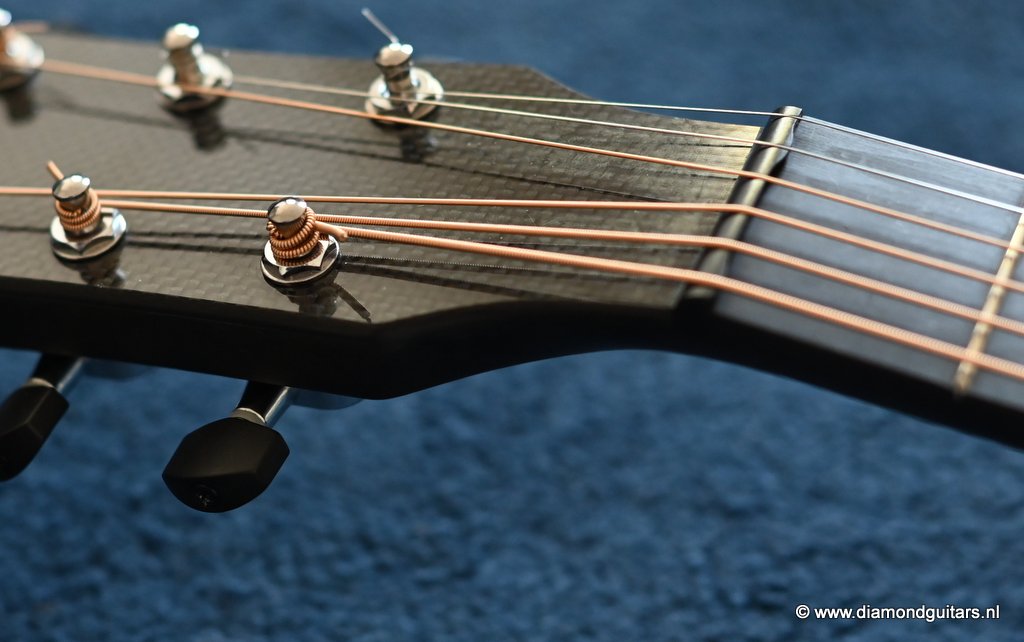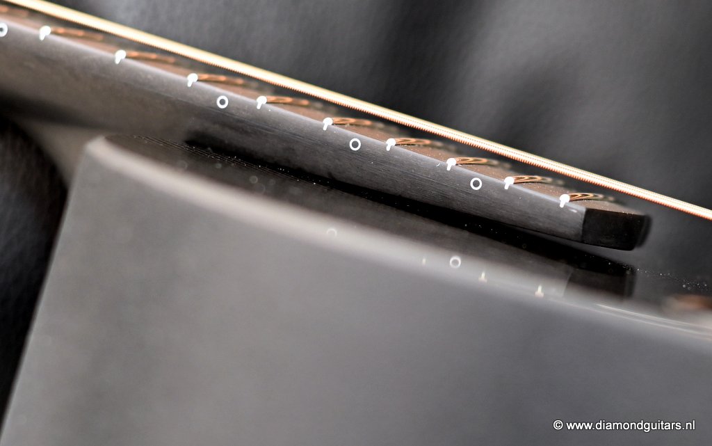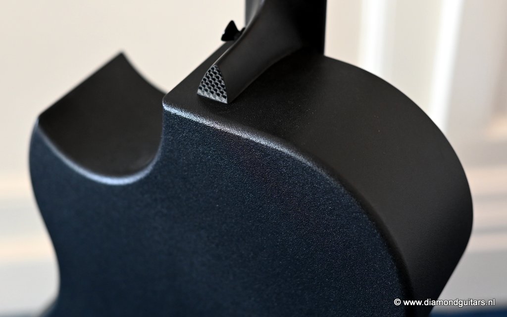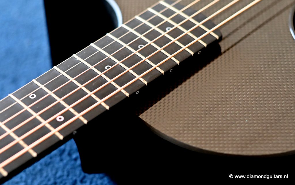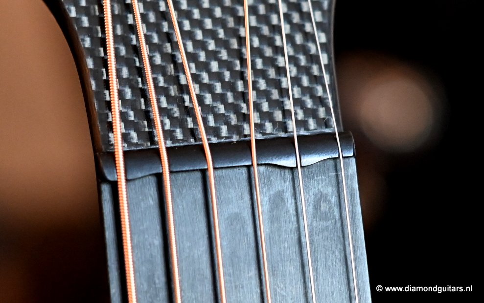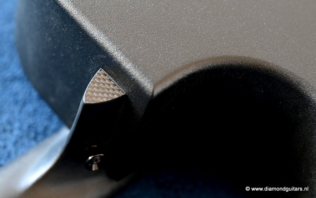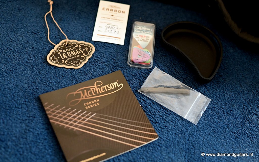 Playing the McPherson Carbon Sable brings a new feel to the guitar world. The neck feels solid, non-sticky and most of all extremely smooth. Nothing sucks the energy out of your hand. My first impression: waauw, that’s a real cool feel or sensation. Made me play the guitar for a long time. She is not lightweight (2.5 kg) but feels solid like the African Blackwood or Cocobolo guitars. You can understand real fast why this guitar gives such a great sustain. Note separation is perfect, intonation is perfect (compensated nuts!), tuning stability is perfect. The perfect guitar? I like her, no doubt about that! The guitar is set up for low action. McPherson also included a medium action saddle, a feedback buster and a sample pack of special McPherson picks.