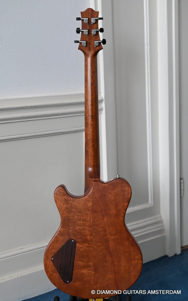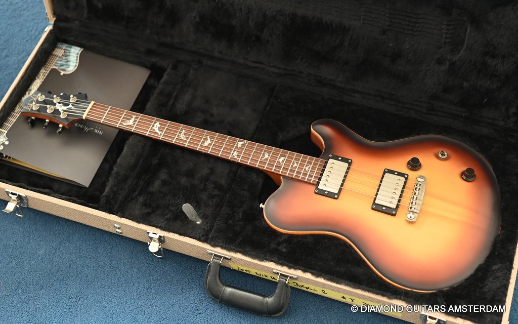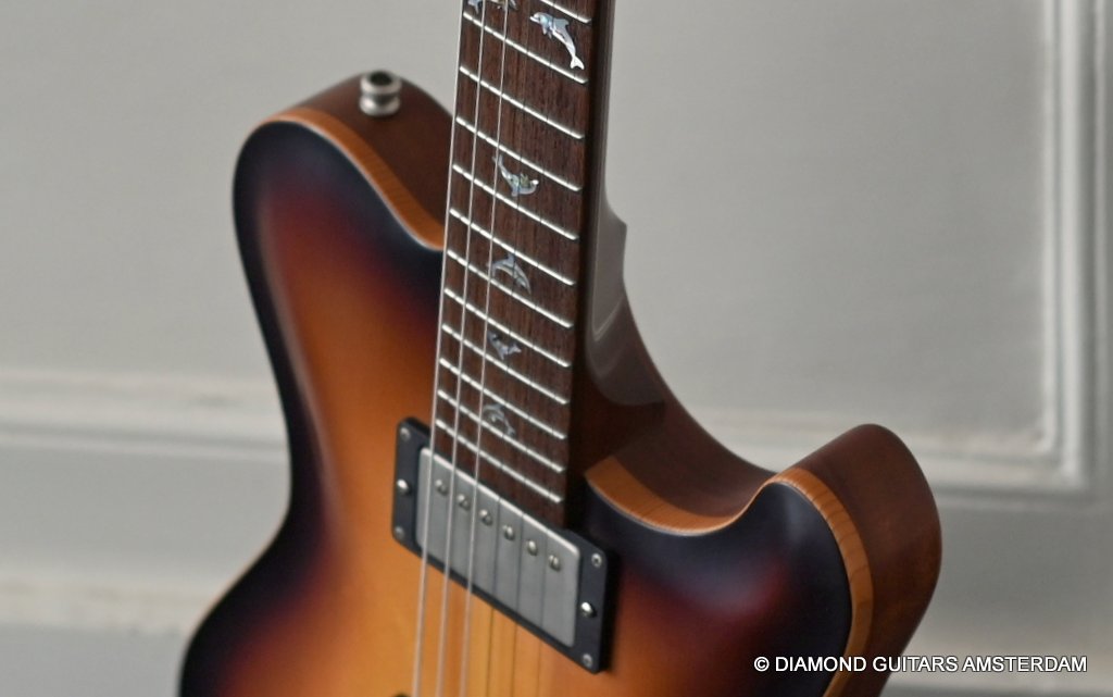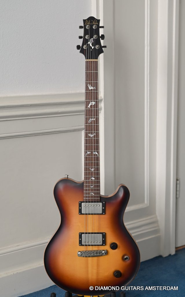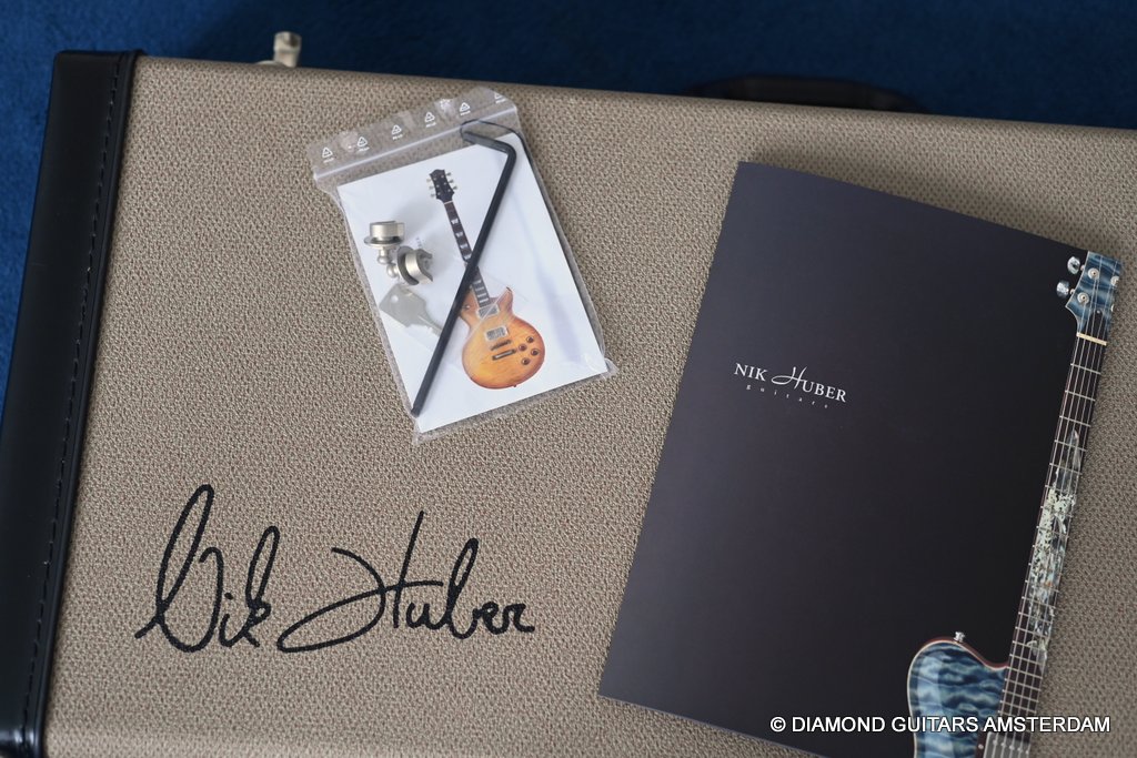 The guitar is equipped with Haussel Vin-N and Classic humbucker pickups, offering versatility through a push-pull coil-tap feature. The VIN+ Neck is equipped with a ceramic magnet and, in combination with its powerful winding, impresses with a higher-output sound that always remains clear and defined. The 1959-B offers the classic PAF sound and measures about 8.4k Ohm. Designed for stability and precision tuning, the Nik Huber Adjustable Stoptail wrap-around bridge with brass studs ensures optimal performance. Additionally, the Schaller M6 Mini tuners with Ebony buttons contribute to the guitar’s overall reliability and tuning accuracy. In summary, the Nik Huber Dolphin II is a masterfully crafted instrument that combines vintage elegance with modern functionality. With its carefully selected materials, attention to detail, and versatile features, this guitar stands out as a top-tier choice for discerning musicians seeking a high-quality and reliable instrument for their musical endeavors. She’s in near mint condition.