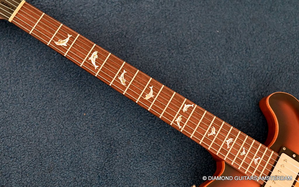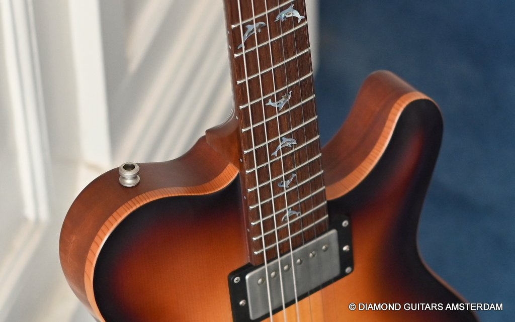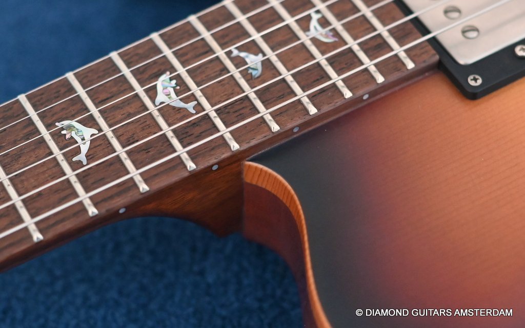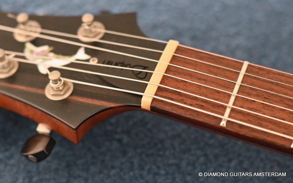 This Nik Huber Dolphin II is constructed with top-level precision and attention to detail using only the finest materials. The body of this guitar boasts an Open Pore Mahogany construction complemented by a clean Spruce top, elegantly presented in that classic Vintage Sunburst semigloss finish. The Open Pore Mahogany neck is paired with an East Indian Rosewood fingerboard, featuring a 25.5-inch scale length, Abalone Dolphin inlays, and a 10″-14″ compound radius with a polished bone nut for optimal playability and tone. The aesthetic appeal of the Nik Huber Dolphin II is further enhanced by an Ebony headstock veneer, along with matching Ebony pickup rings and control knobs.