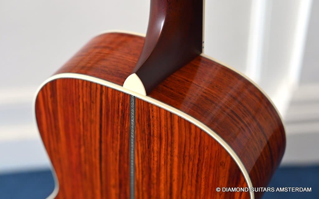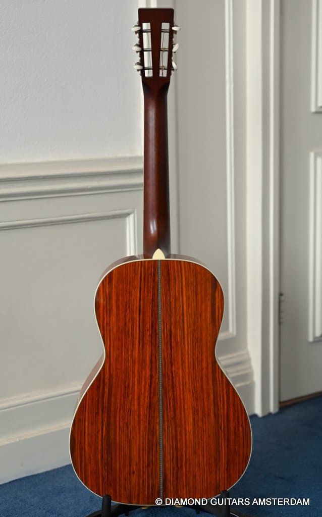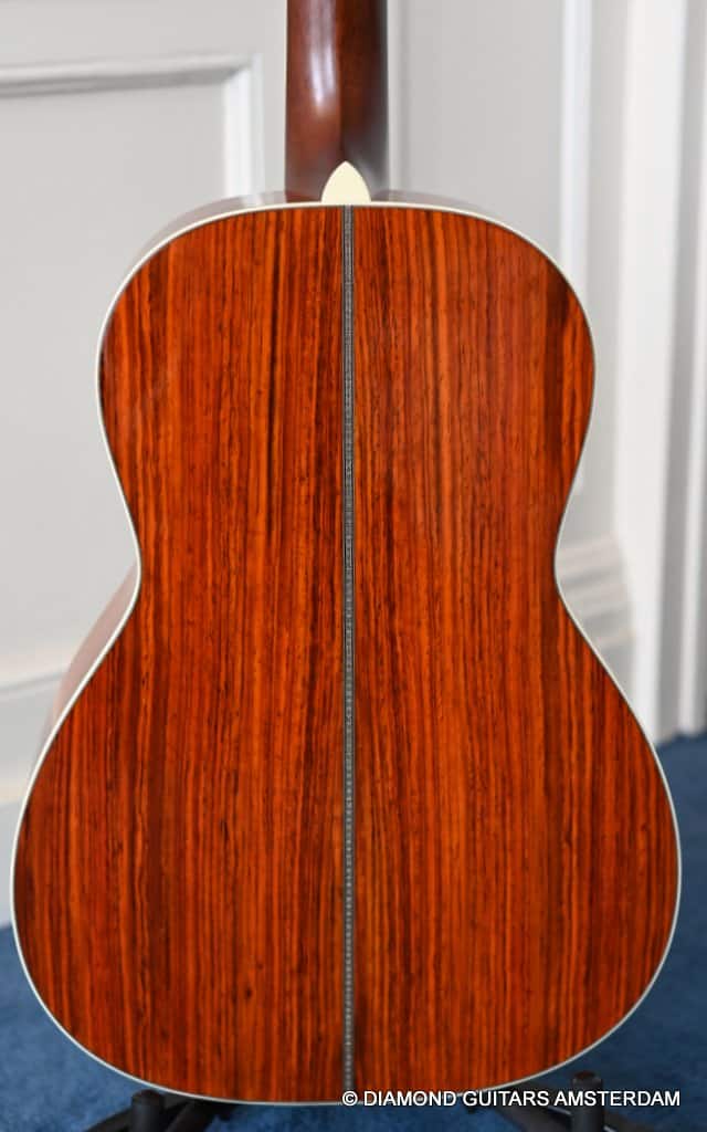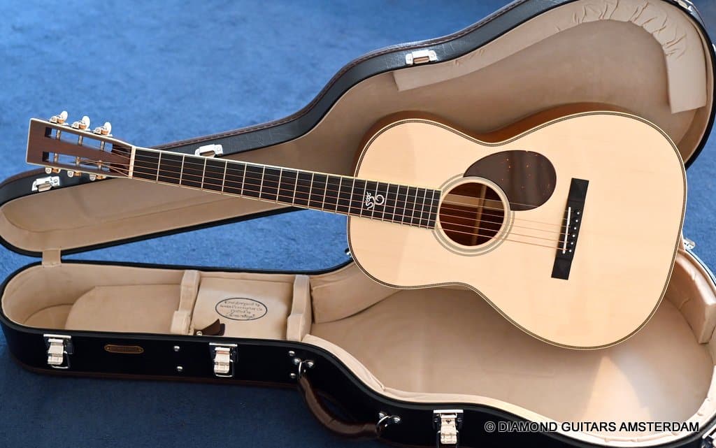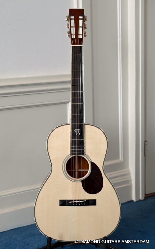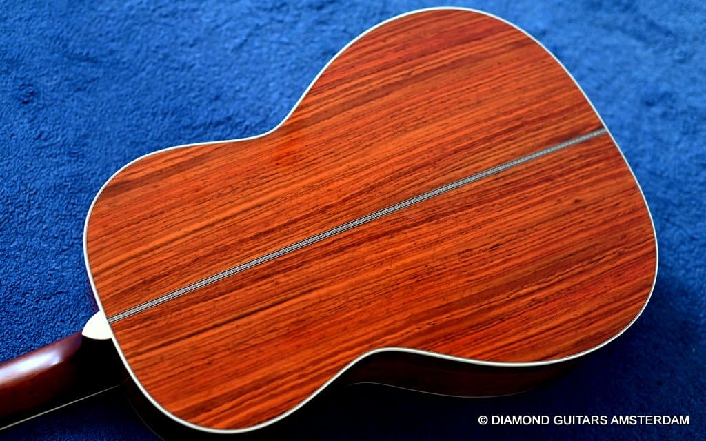 The Santa Cruz 00-Skye is a wonderful creation of Richard Hoover and the renowned jazz guitarist Eric Skye. Beautiful straight-grained Cocobolo combines with a mastergrade Adirondack Red Spruce top, a Honduras Mahogany neck and an Ebony fingerboard to give this slightly deeper body 00-model a bold and refined tone!