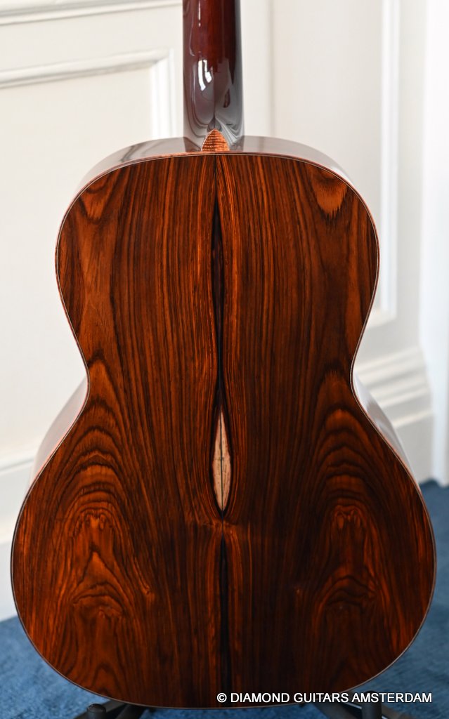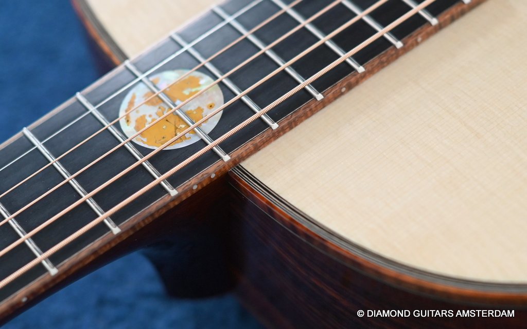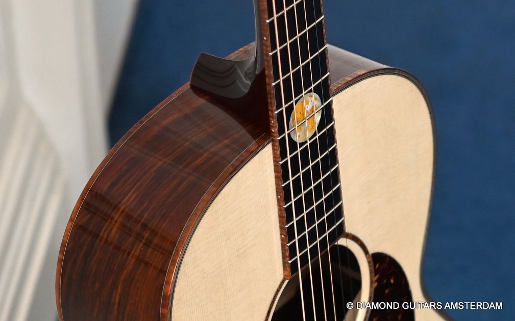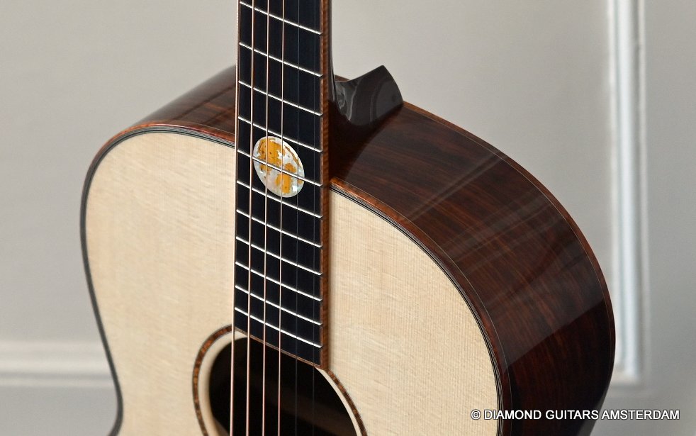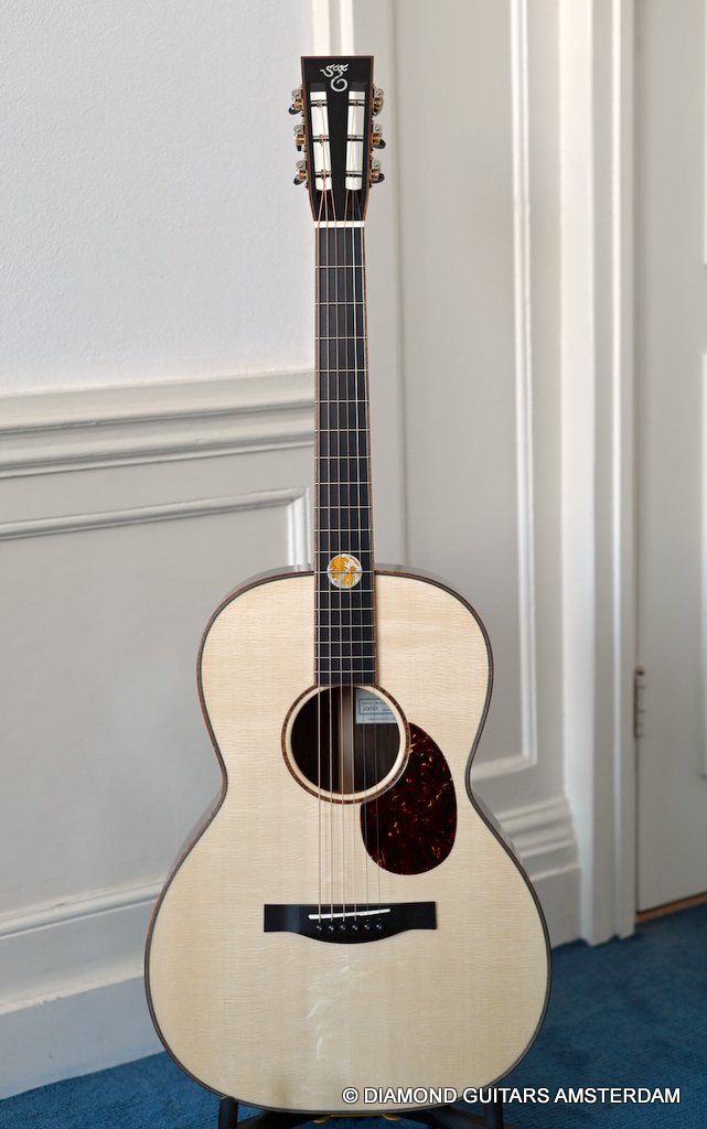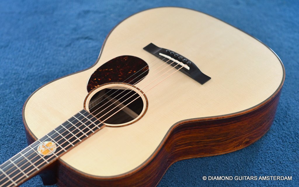Stunning Santa Cruz 000 Custom build with mastergrade Cocobolo Moon Spruce. This time-tested 12-fret design ensures large bass response and overall volume. Ideal finger picker guitar!