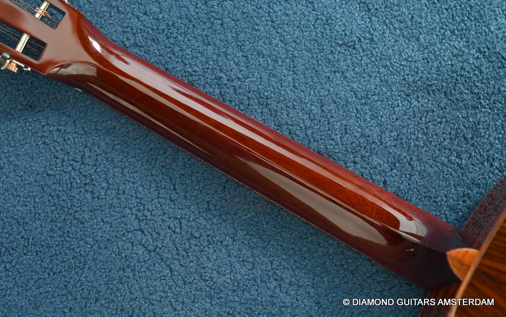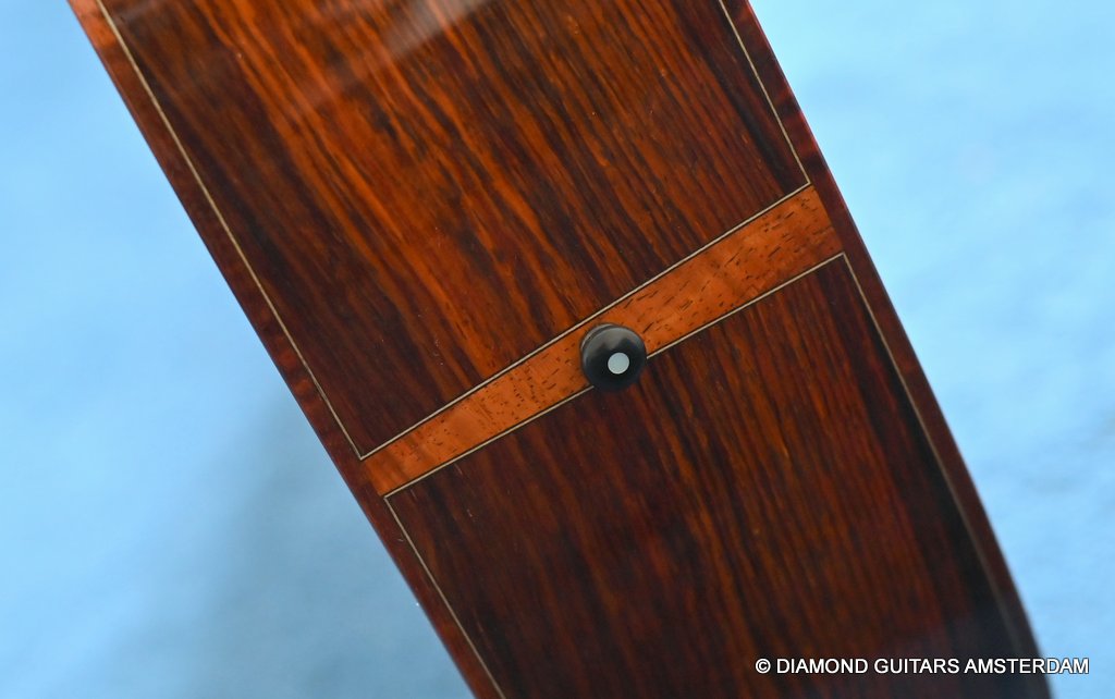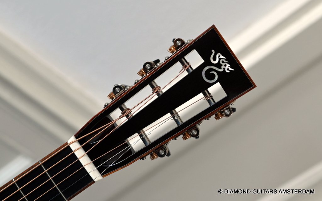 This Santa Cruz 000 Custom is build with mastergrade Cocobolo and Moon Spruce from the Italian Alps. She presents tasty appointments like the Moon inlay at the 12th fret, flamed Koa bindings and soundhole inlay to emphasize master grade quality materials, tone and workmanship. The 000 versatility and ergonomics lend great appeal for traditional picking styles and impressive rhythm work. Expect the predominant bass and throaty presence of the surviving pre-war antiques.