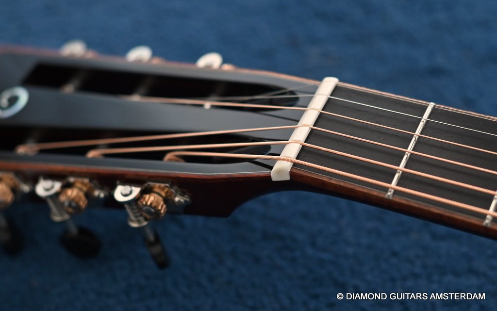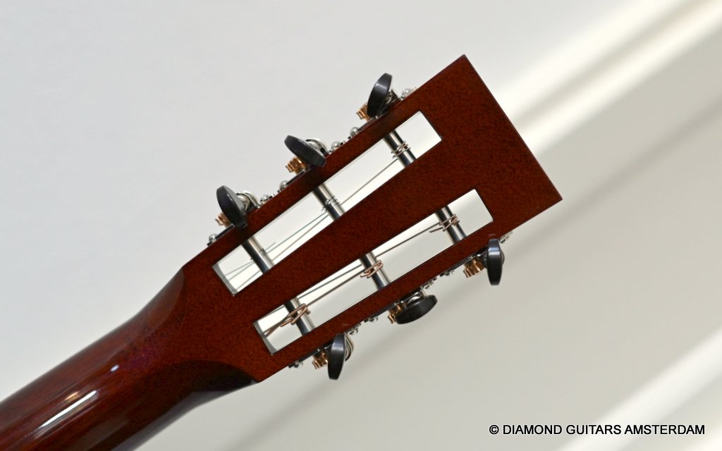The Santa Cruz 000 Custom adds some distinct advantages tonally and cosmetically. The extension of the body to the 12th fret adds additional airspace, which translates into increased sound volume and a more predominate bass in the EQ. The slotted peghead is a standard feature that not only adds classic styling. The reduced mass of the peghead accentuates the guitar’s open, airy ambiance, making it a fingerstyle favorite. You’ve seen this Santa on stage with Jeff Tweedy and Dave Matthews as a solid performing songwriter’s tool. It has also been heard on numerous recordings as a mainstay of pro session players. You will find an immediate purpose for the OOO and wonder why you didn’t have it in your arsenal all along.