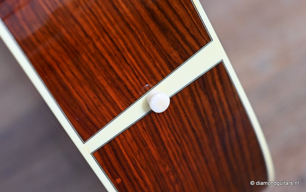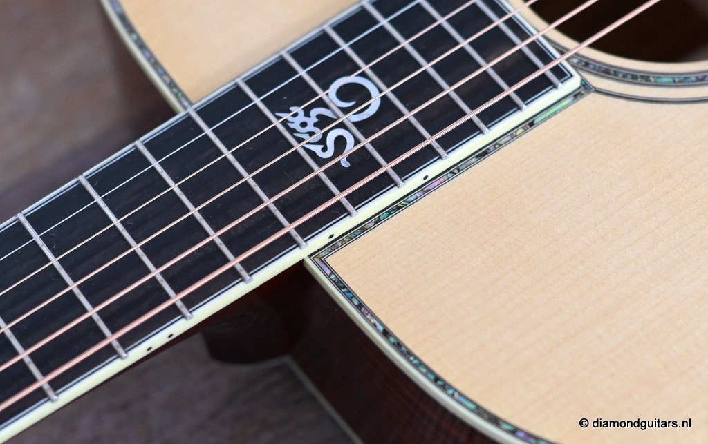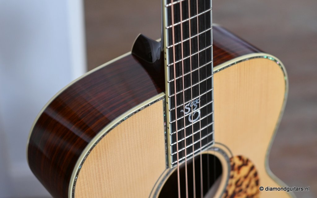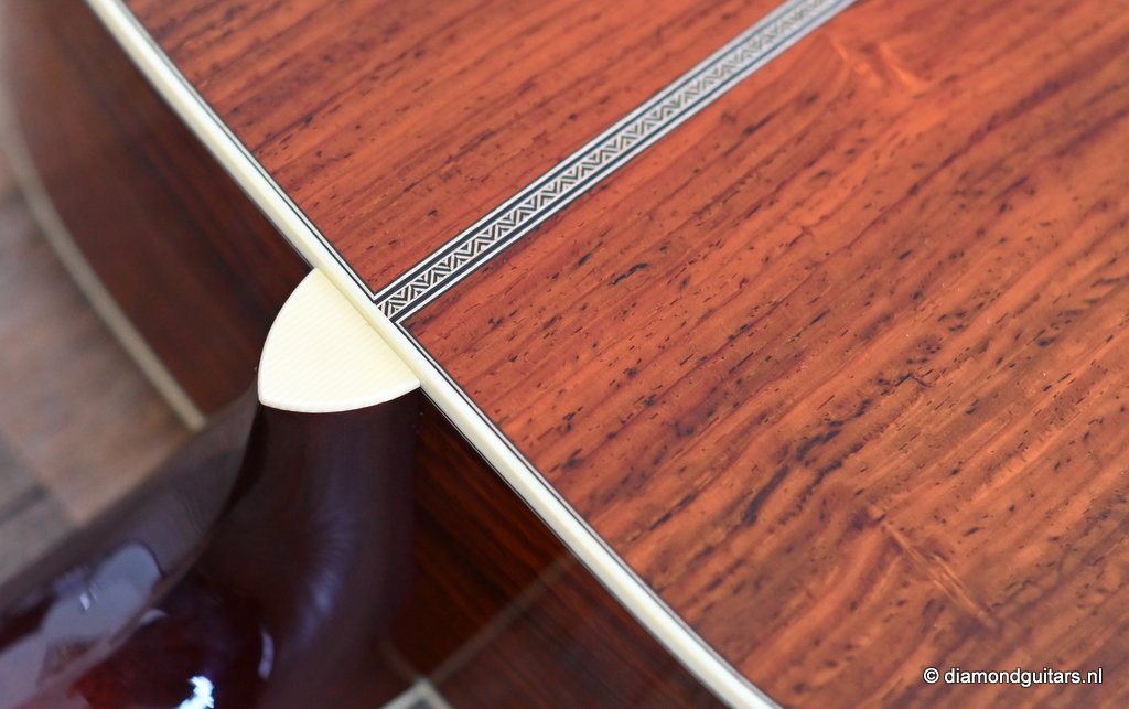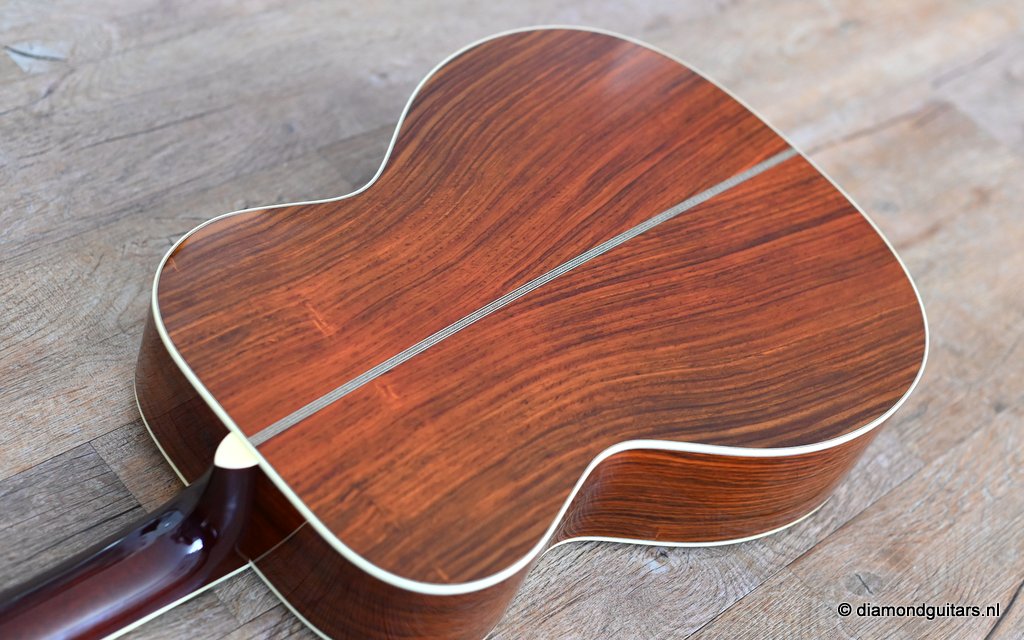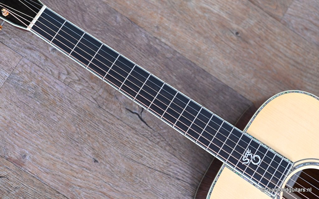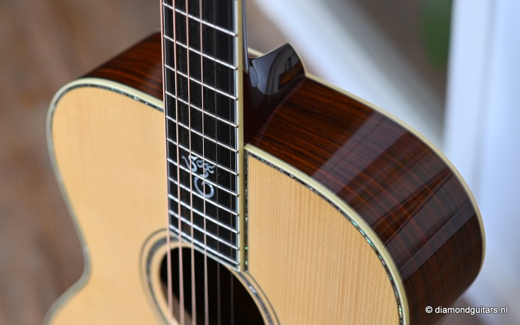 She is build with a set of mastergrade cocobolo ensuring great projection and an abundance of overtones similar to brazilian rosewood. The wood is denser and more resonant than other rosewood species and thus offers awesome sustain too. Combined with old growth Adirondack, this is the quintessential pre-war OM-42. Listen to Richard’s story on this wood HERE. The Mahogany neck has a slight V shape and plays like butter. Construction is predictably first-class, with quality materials everywhere. Top-notch tonal qualities put this babe where she belongs: the absolute top of the line! To top that off, we added the classic Abalone Torch to the headstock. Listen to a sound impression here: