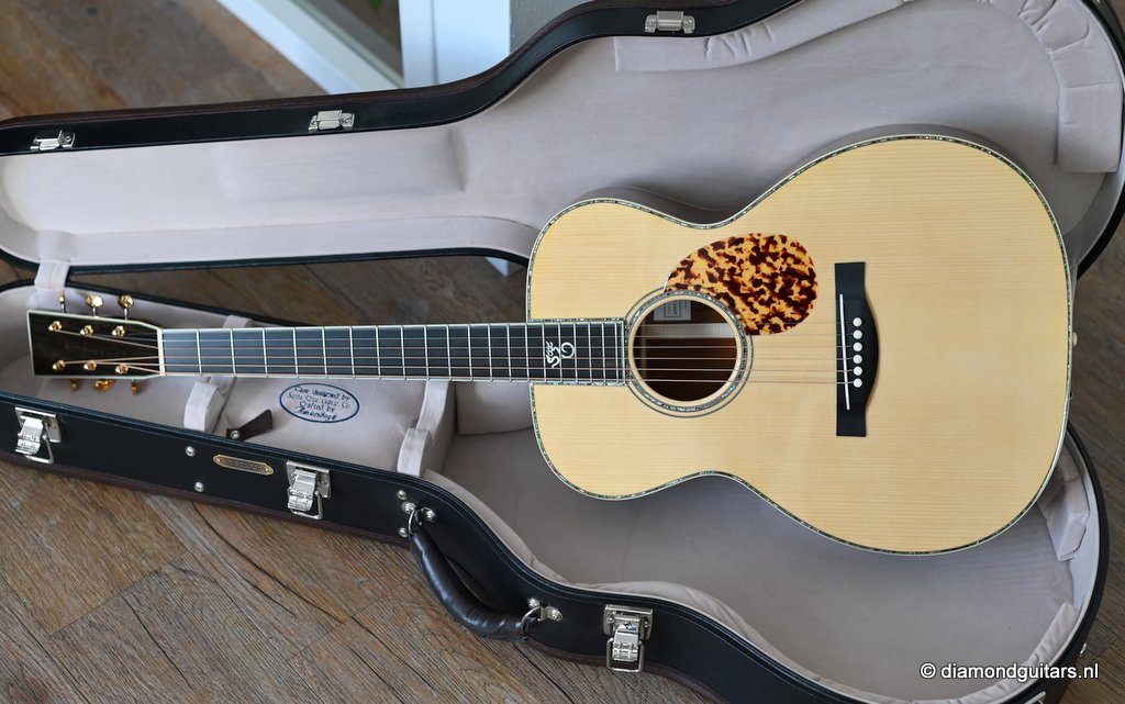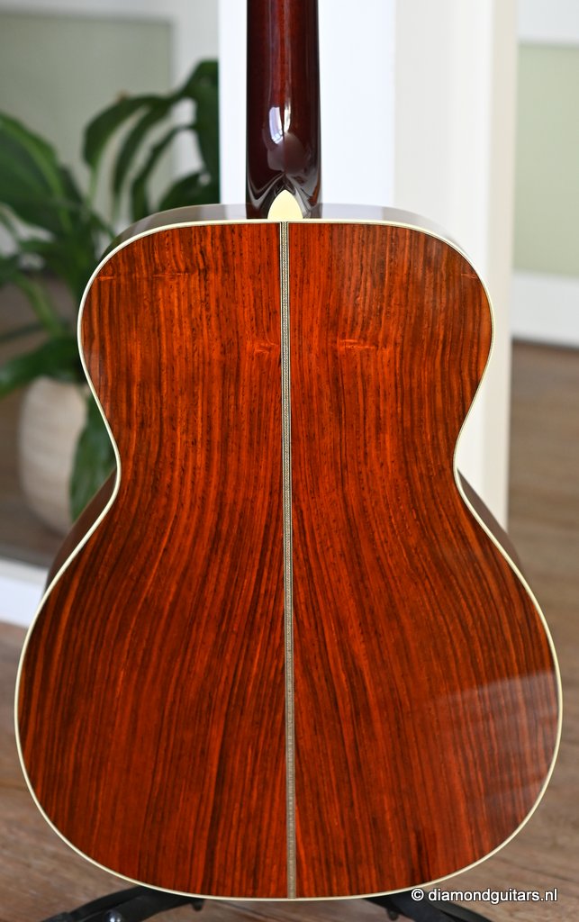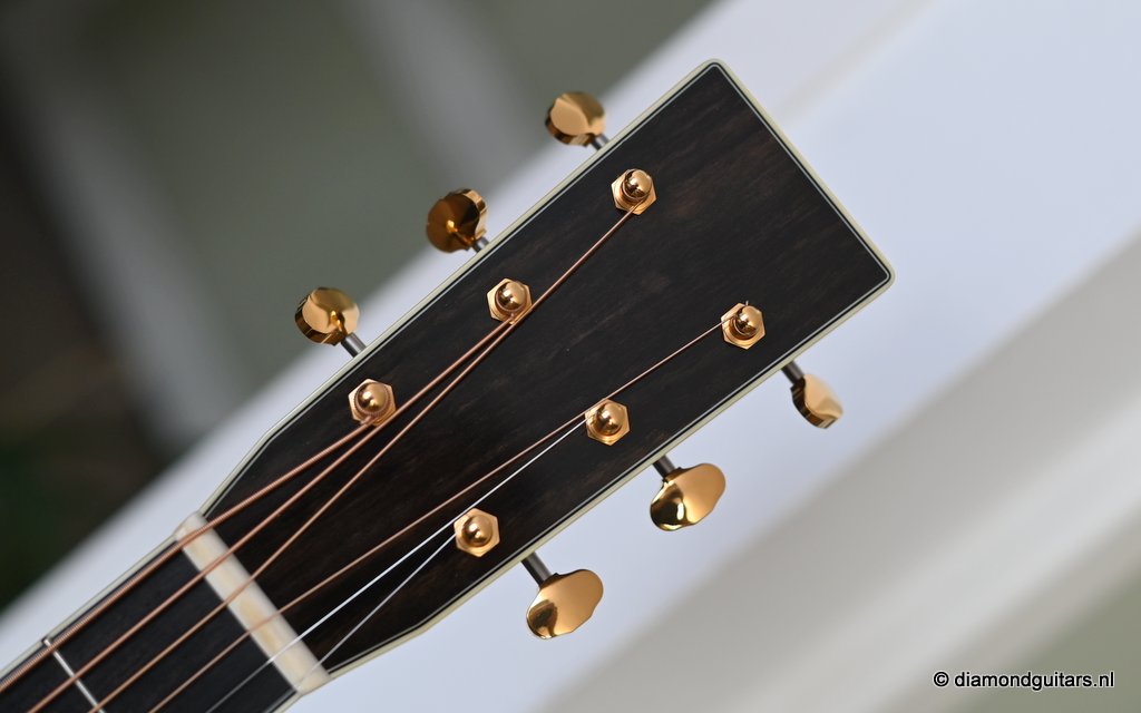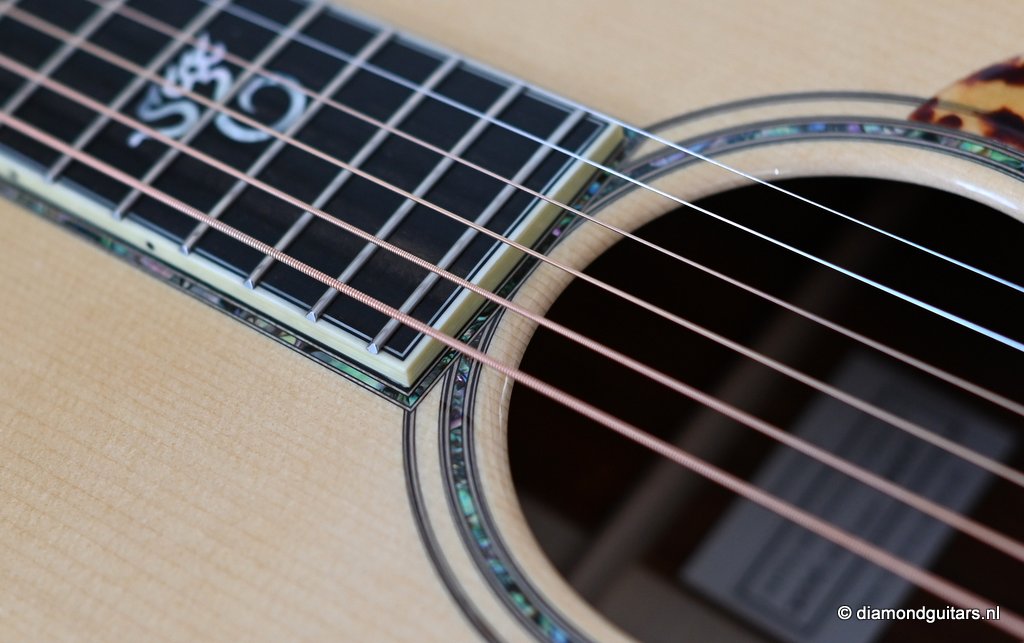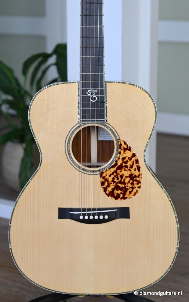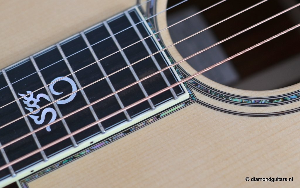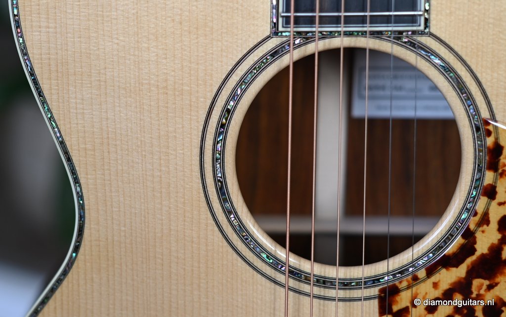 She is build with a set of mastergrade cocobolo ensuring great projection and an abundance of overtones similar to brazilian rosewood. The wood is denser and more resonant than other rosewood species and thus offers awesome sustain too. Combined with old growth Adirondack, this is the quintessential pre-war OM-42. Listen to Richard’s story on this wood HERE. The Mahogany neck has a slight V shape and plays like butter. Construction is predictably first-class, with quality materials everywhere. Top-notch tonal qualities put this babe where she belongs: the absolute top of the line! To top that off, we added the classic Abalone Torch to the headstock. Listen to a sound impression here: