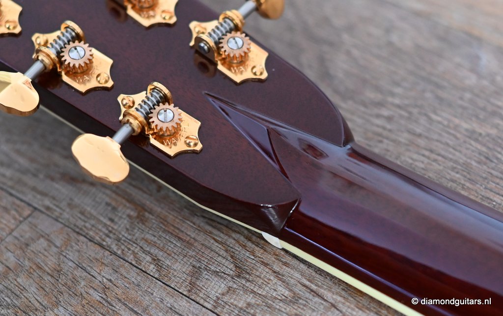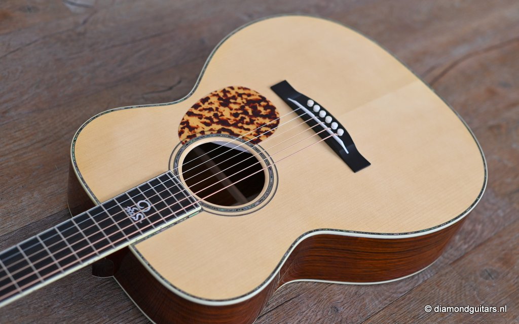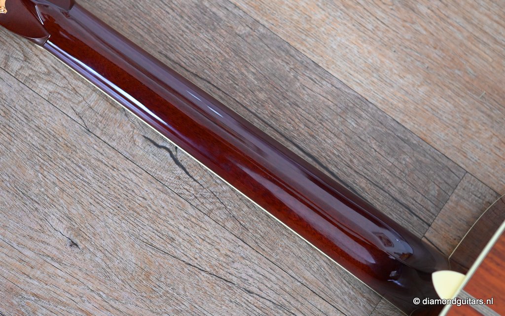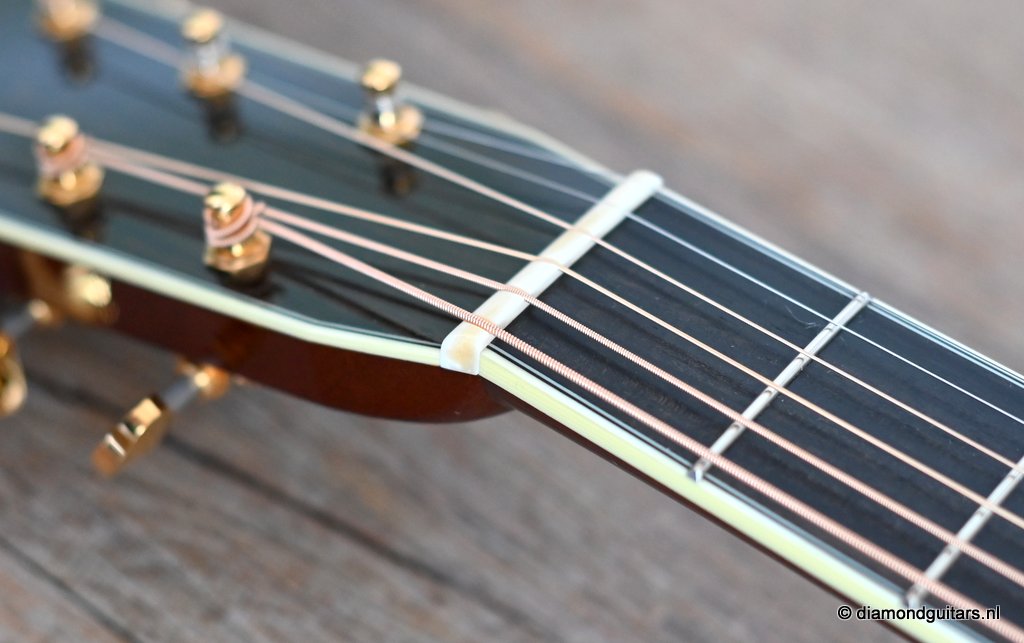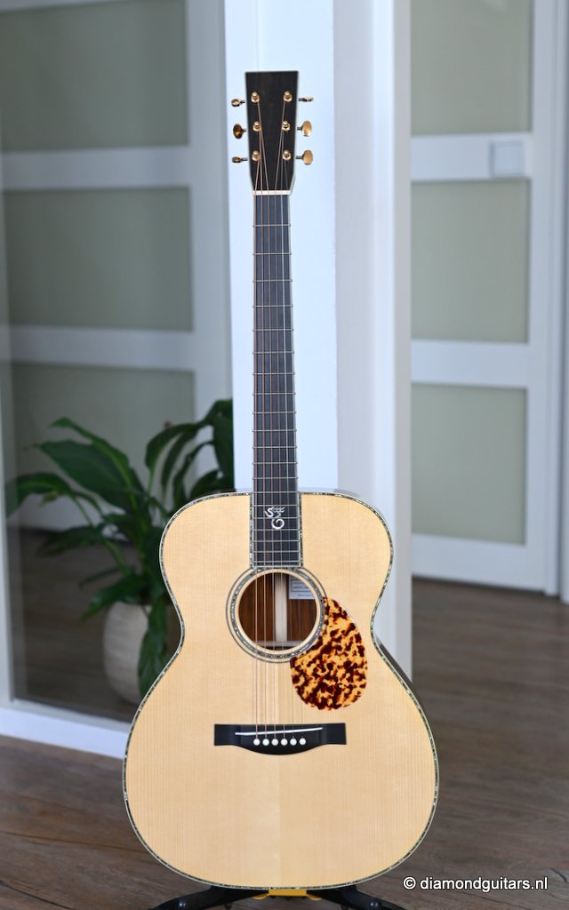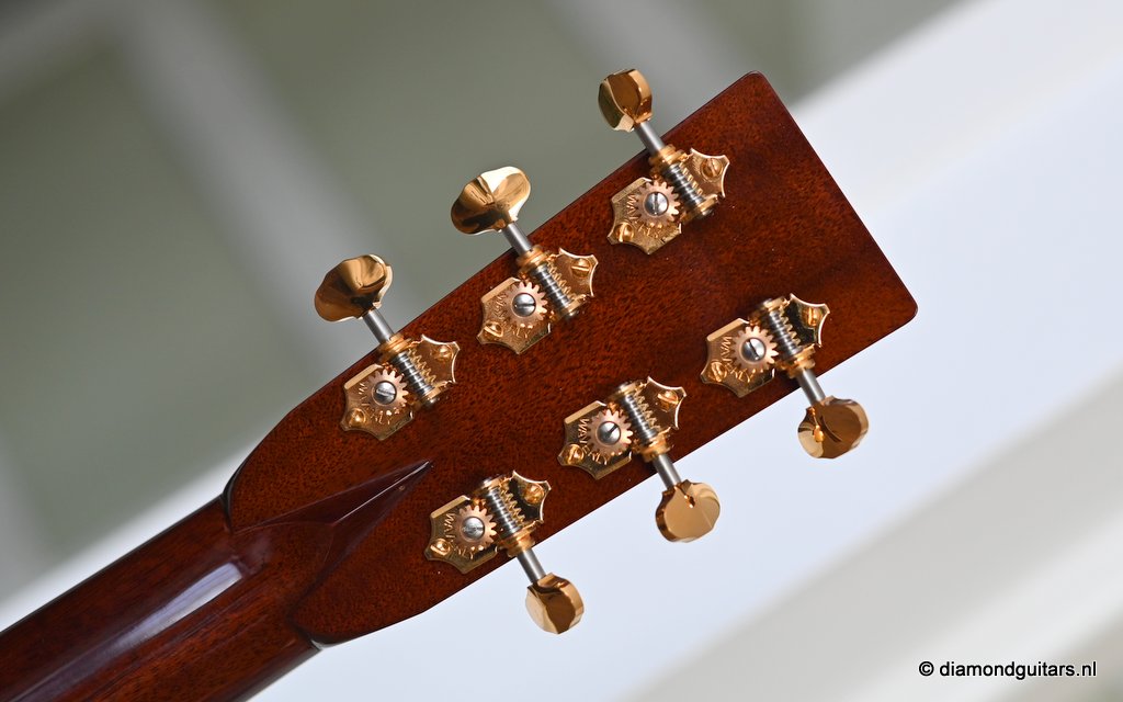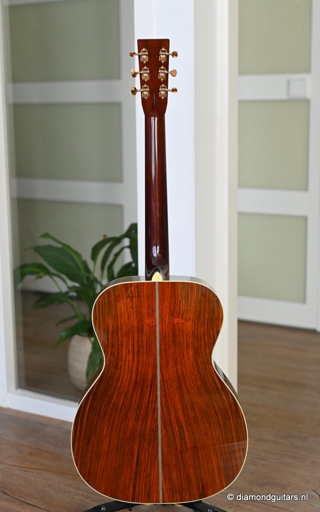 She is build with a set of mastergrade cocobolo ensuring great projection and an abundance of overtones similar to brazilian rosewood. The wood is denser and more resonant than other rosewood species and thus offers awesome sustain too. Combined with old growth Adirondack, this is the quintessential pre-war OM-42. Listen to Richard’s story on this wood HERE. The Mahogany neck has a slight V shape and plays like butter. Construction is predictably first-class, with quality materials everywhere. Top-notch tonal qualities put this babe where she belongs: the absolute top of the line! To top that off, we added the classic Abalone Torch to the headstock. Listen to a sound impression here: