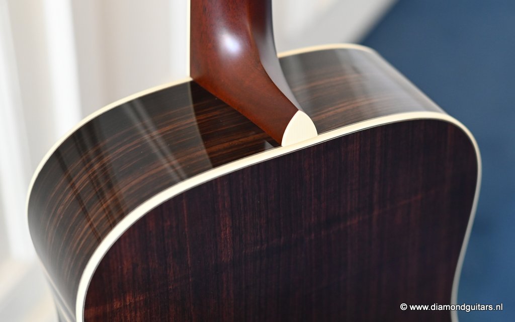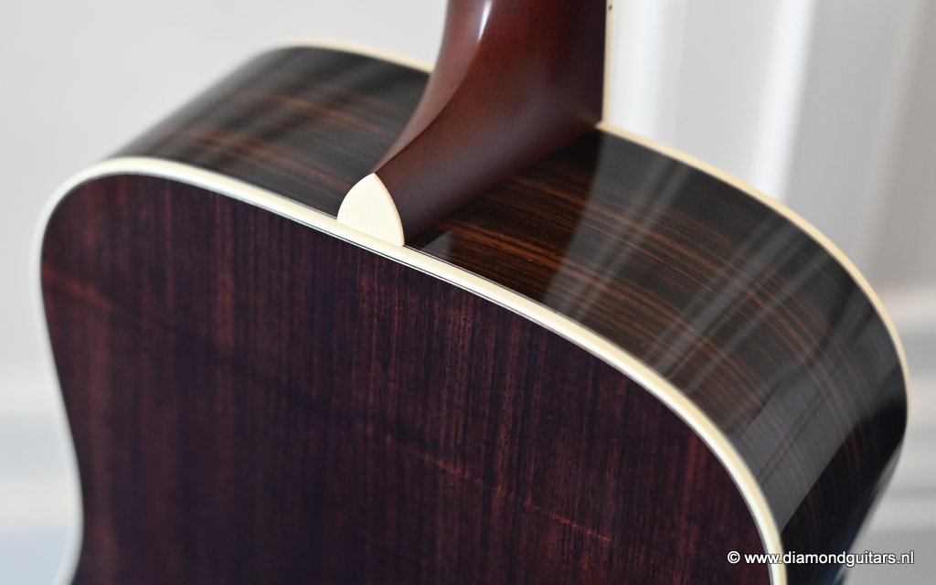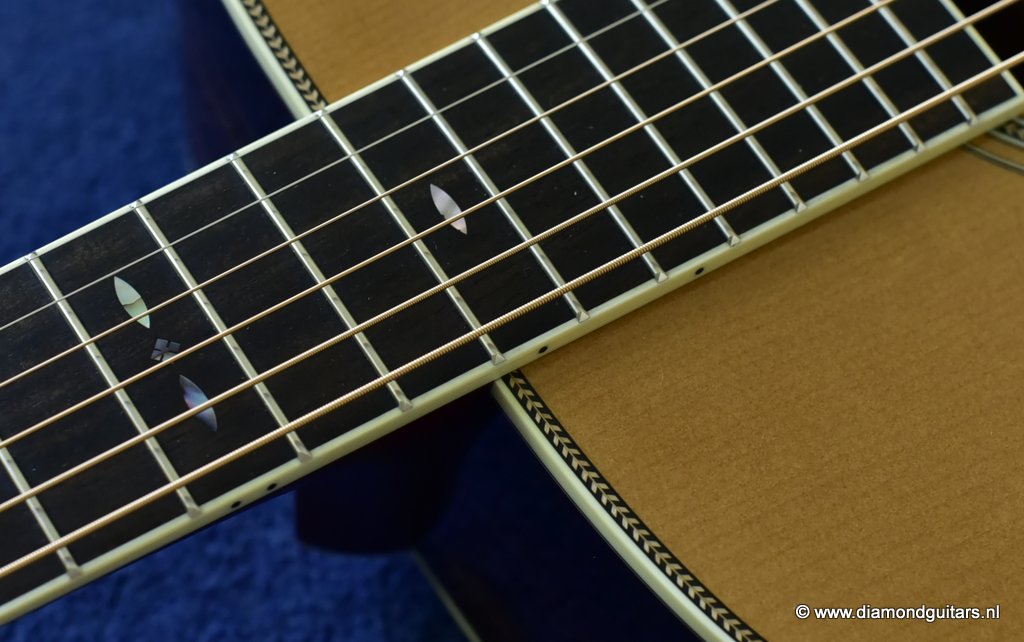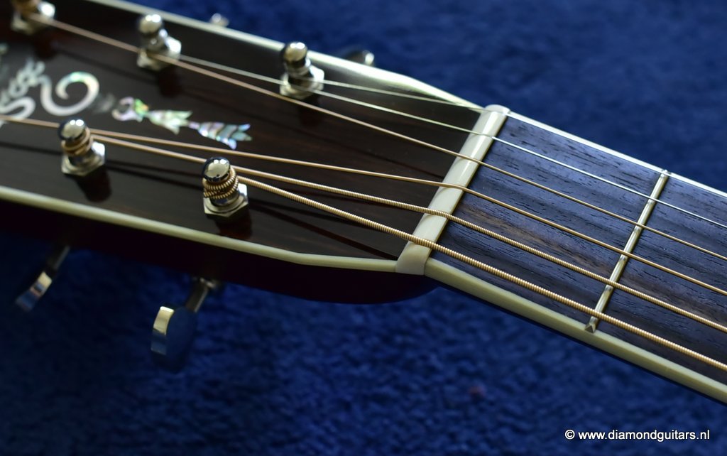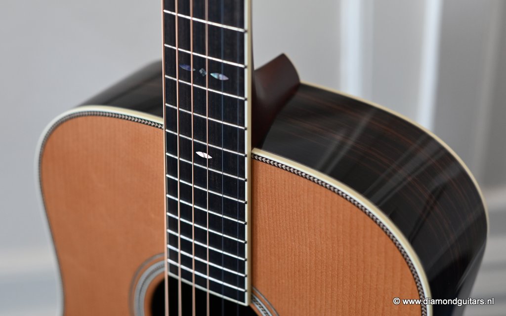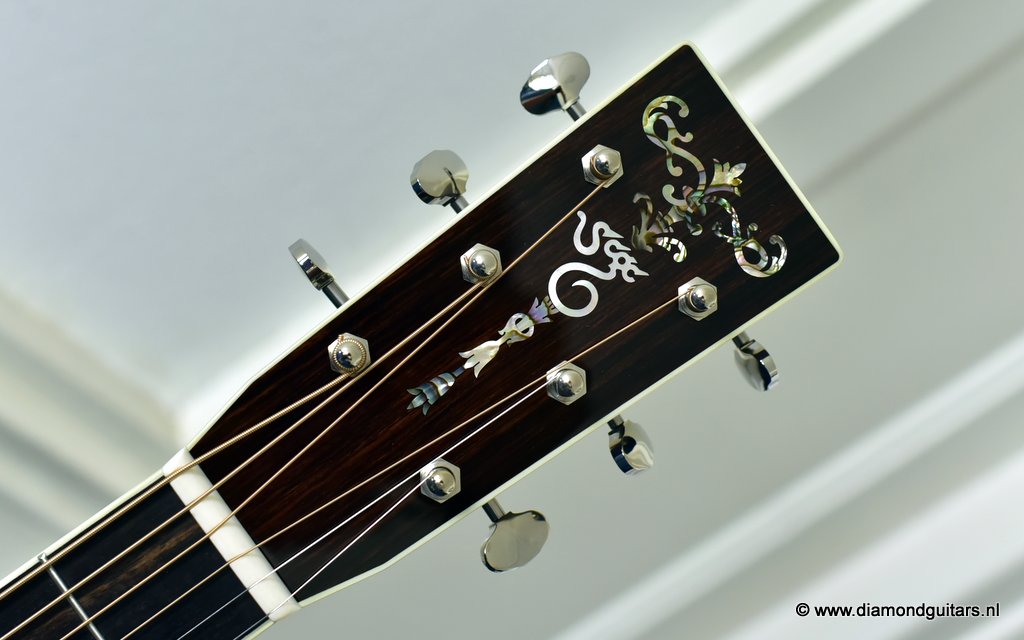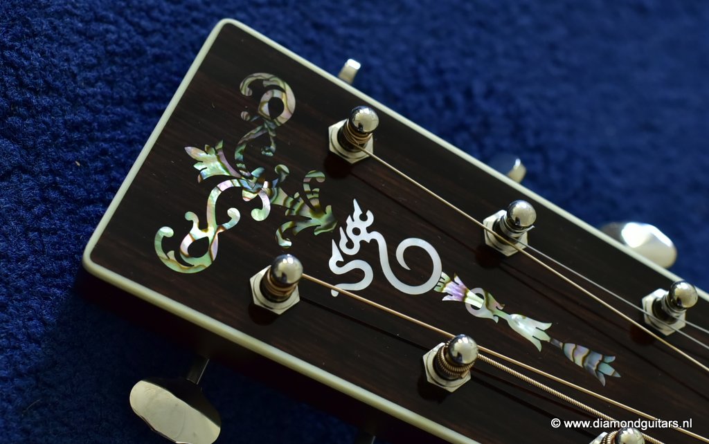 This Santa Cruz D/PW is build with mastergrade East Indian Rosewood and Adirondack Red Spruce for the top. She presents tasty appointments to emphasize master grade quality materials, tone and workmanship. Everything in this guitar is focused on to ton, tone and then some more tone. We also felt it is justified to add two classic pre war design options: the abalone torch on hte headstock and the style 42 fingerboard inlay. Because I could and I love the craftsmanship and the looks. You?