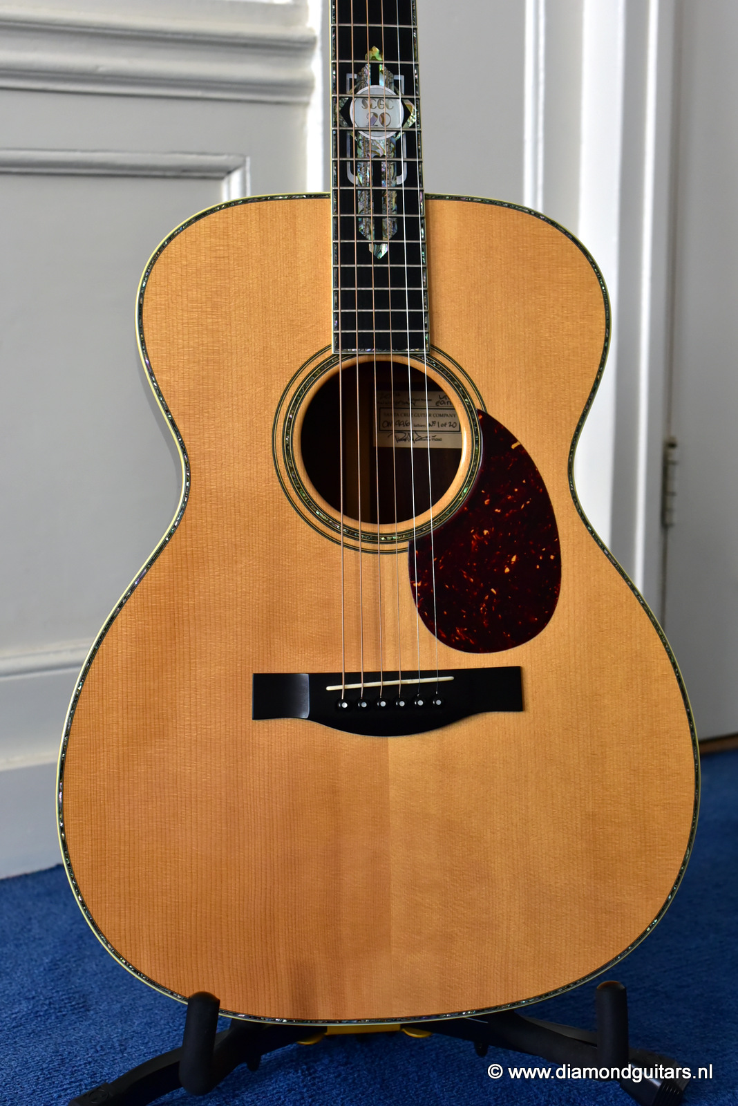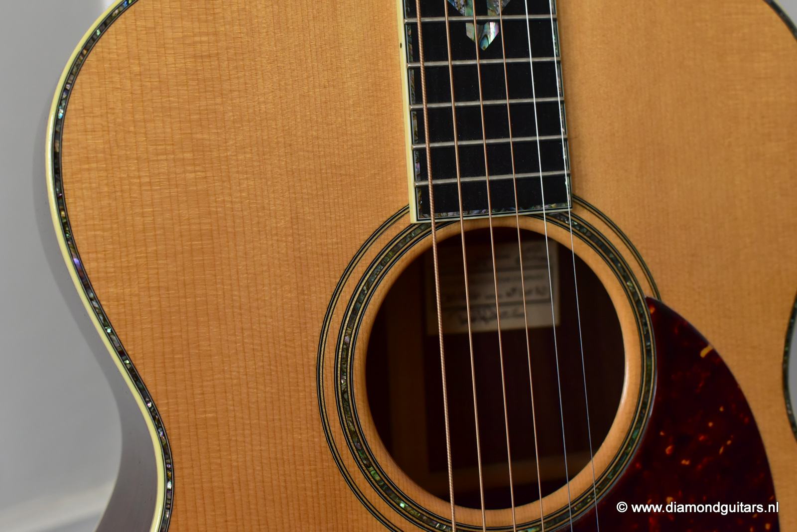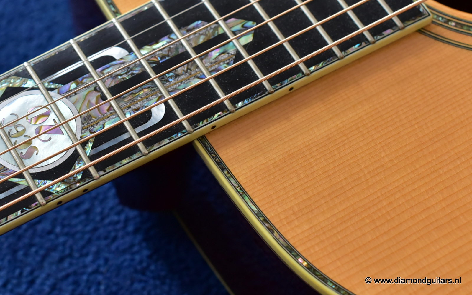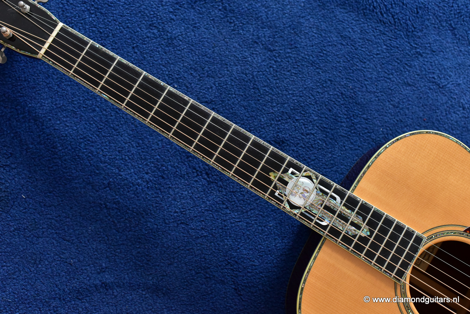 1997 was a special year for Richard. The company was really doing well and new models and techniques were incorparated into his instruments. One of these techniques was the inlay work. The famous inlay artist Larry Robinson designed and crafted the commemorative Art Deco pre war style inlay work on this guitar. A true piece or art! That is not all: this instrument sounds amazing. Full bodied tones in the low end and sprakling highs.