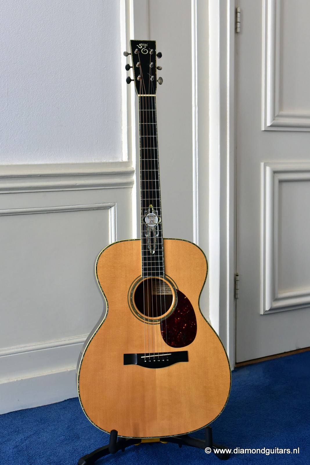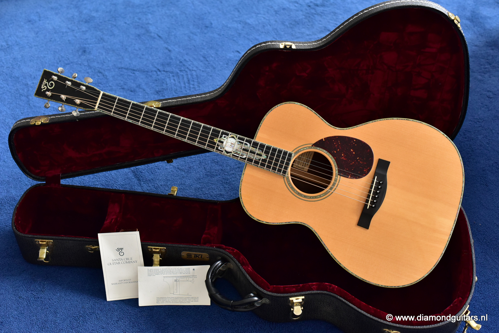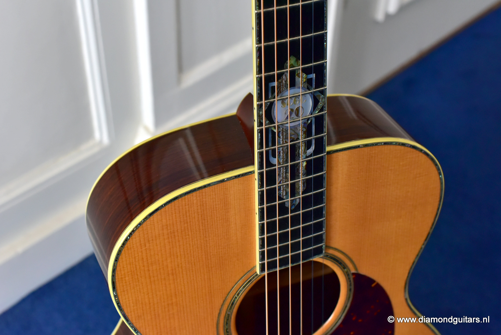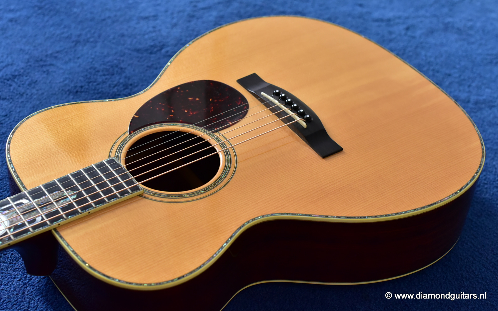 1997 was a special year for Richard. The company was really doing well and new models and techniques were incorparated into his instruments. One of these techniques was the inlay work. The famous inlay artist Larry Robinson designed and crafted the commemorative Art Deco pre war style inlay work on this guitar. A true piece or art! That is not all: this instrument sounds amazing. Full bodied tones in the low end and sprakling highs.