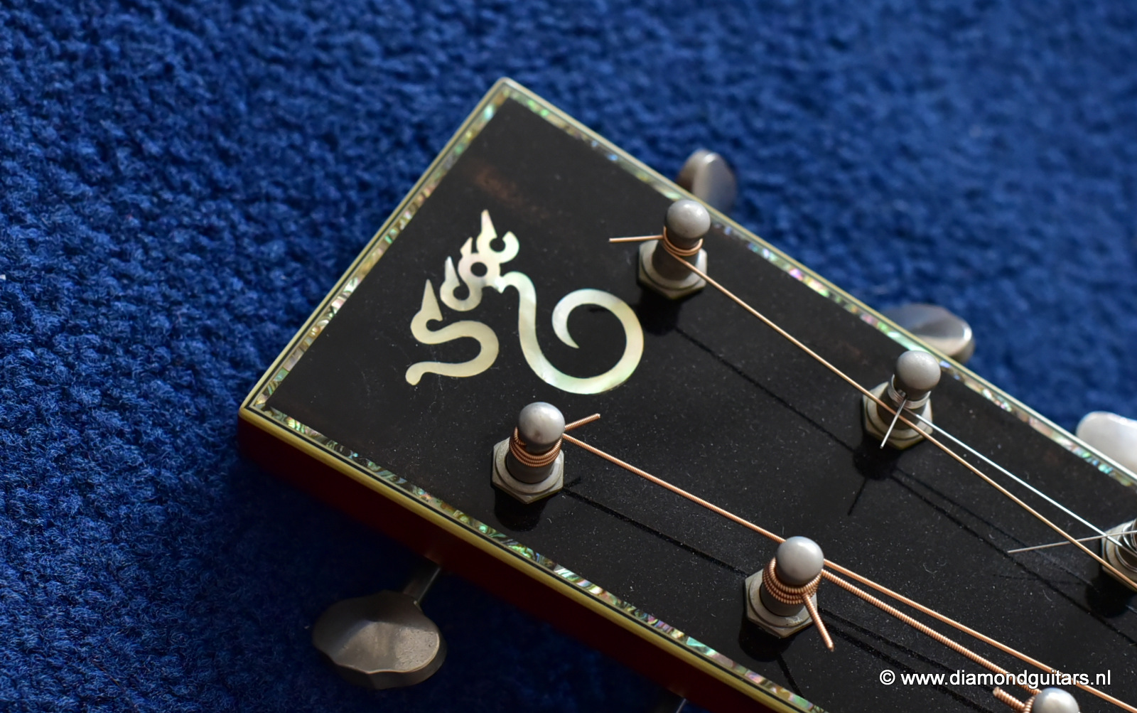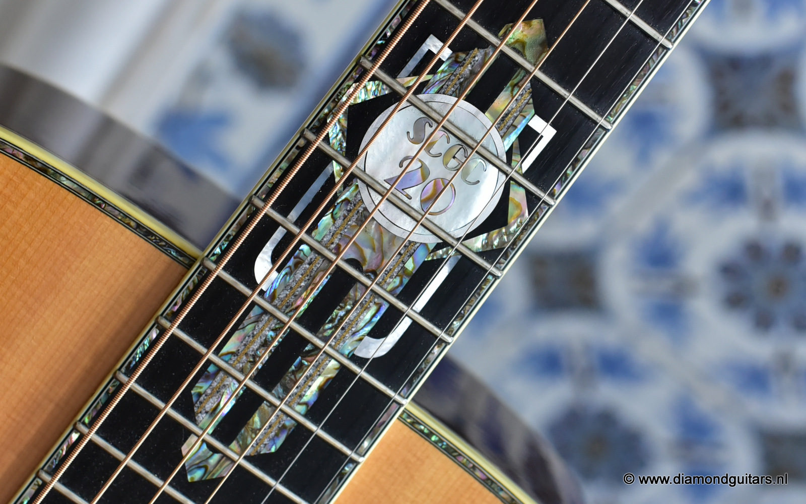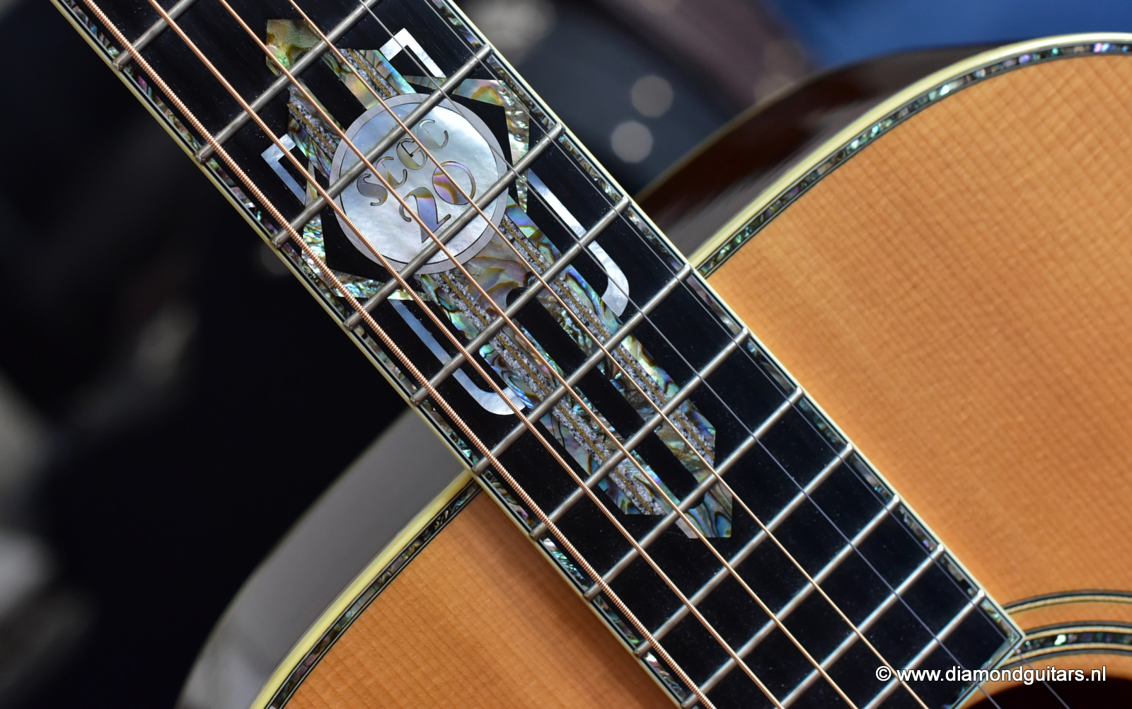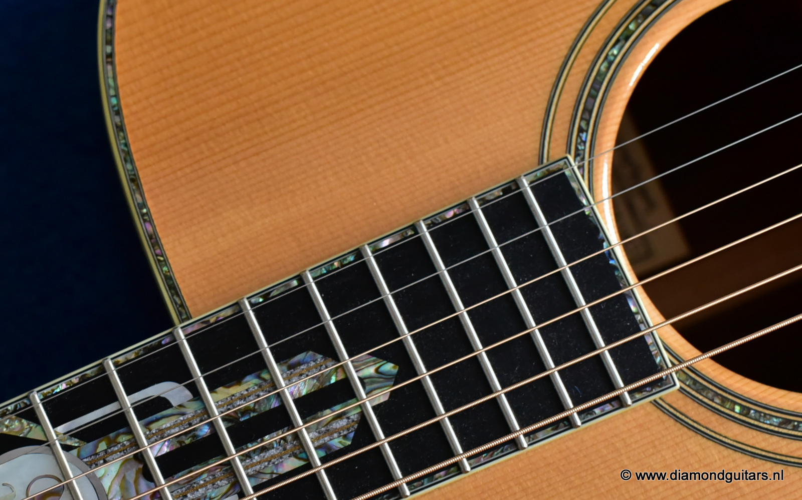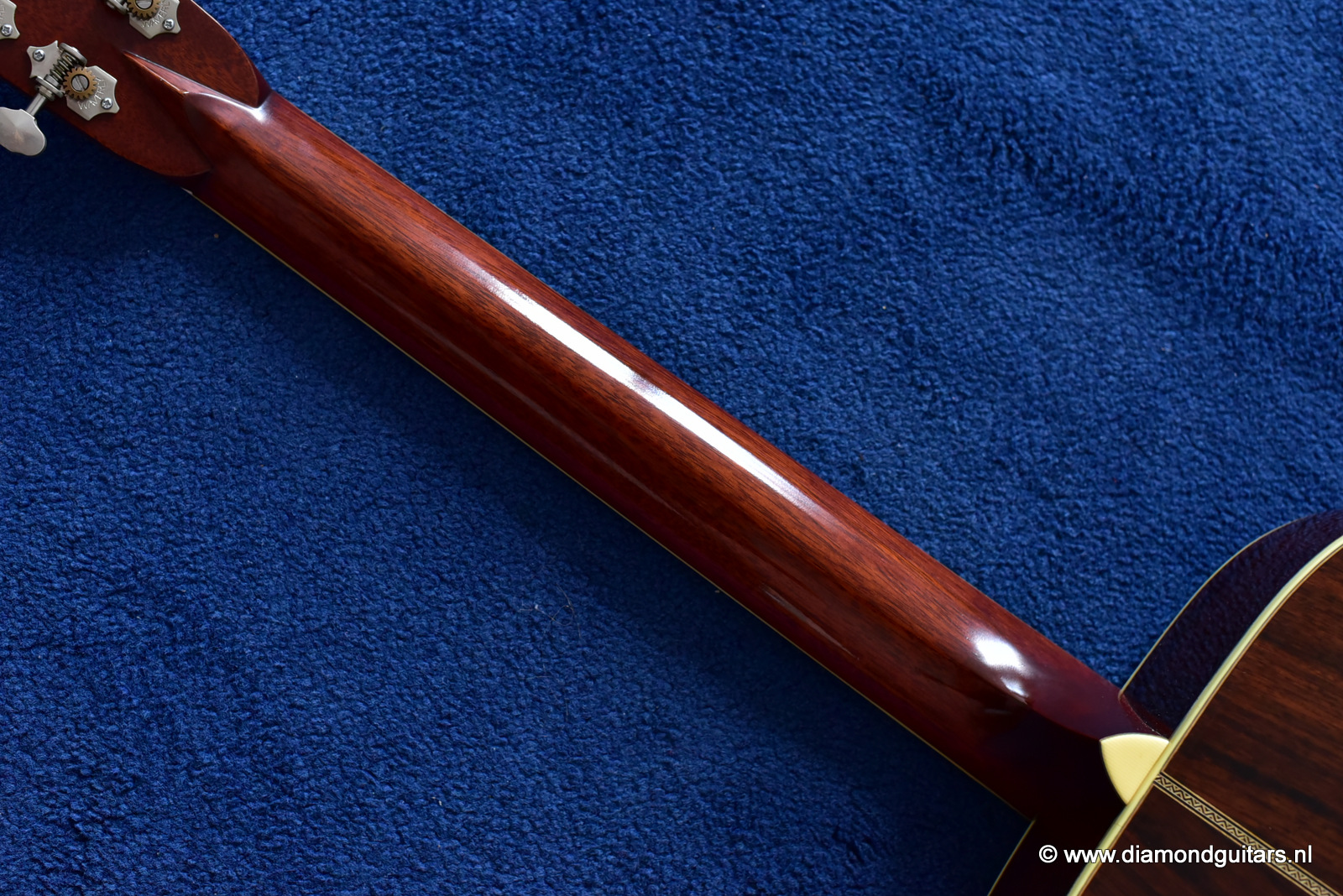 1997 was a special year for Richard. The company was really doing well and new models and techniques were incorparated into his instruments. One of these techniques was the inlay work. The famous inlay artist Larry Robinson designed and crafted the commemorative Art Deco pre war style inlay work on this guitar. A true piece or art! That is not all: this instrument sounds amazing. Full bodied tones in the low end and sprakling highs.