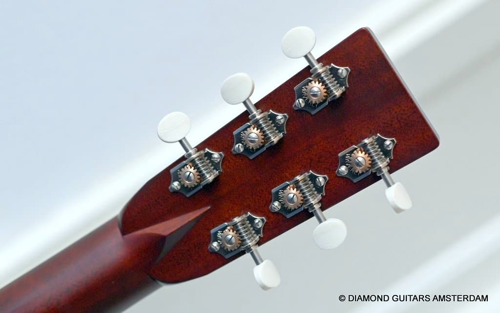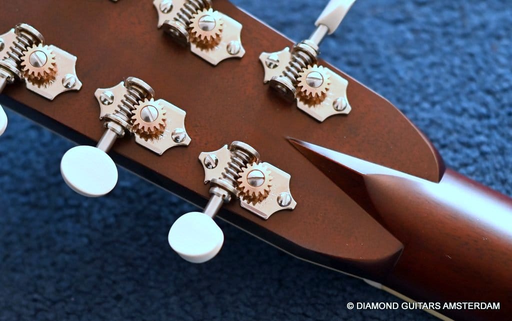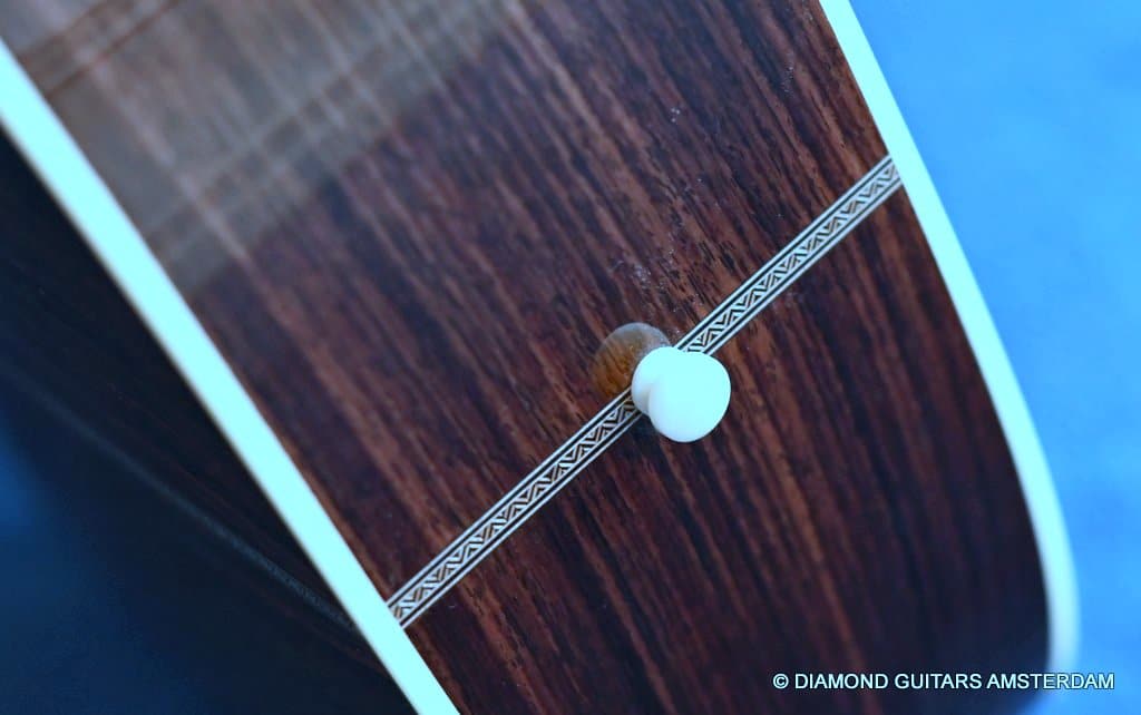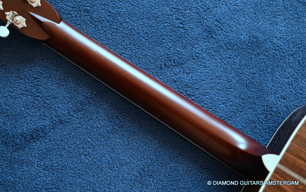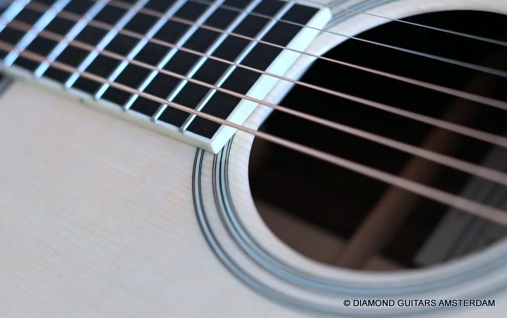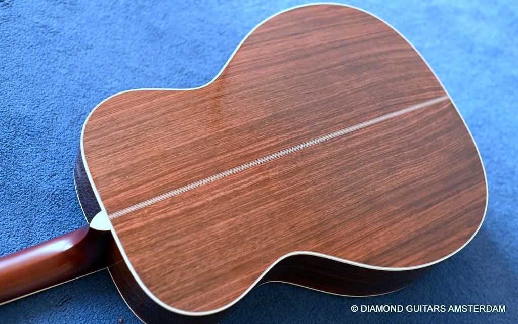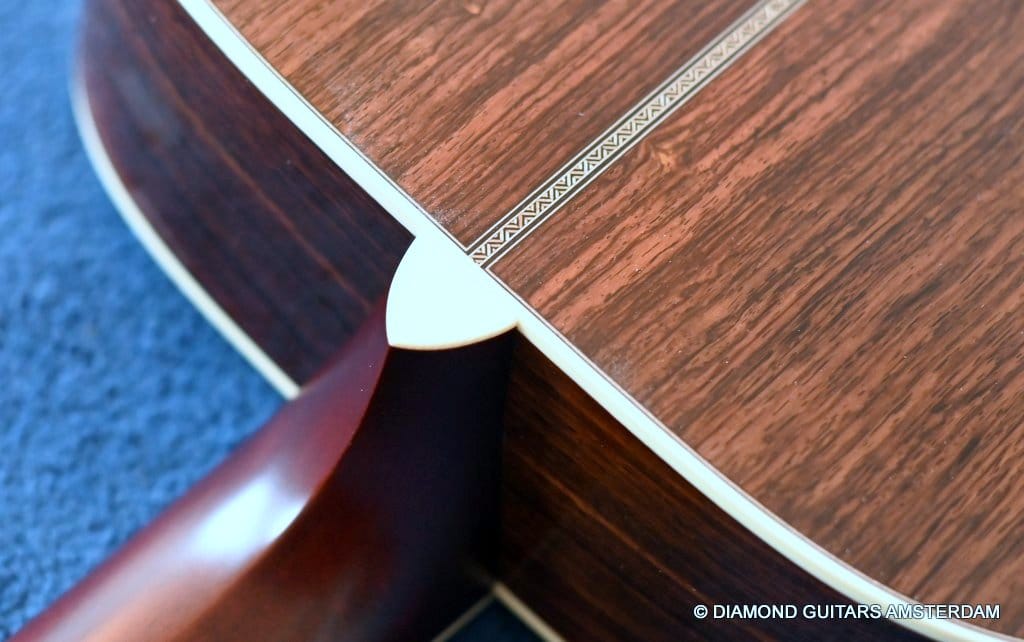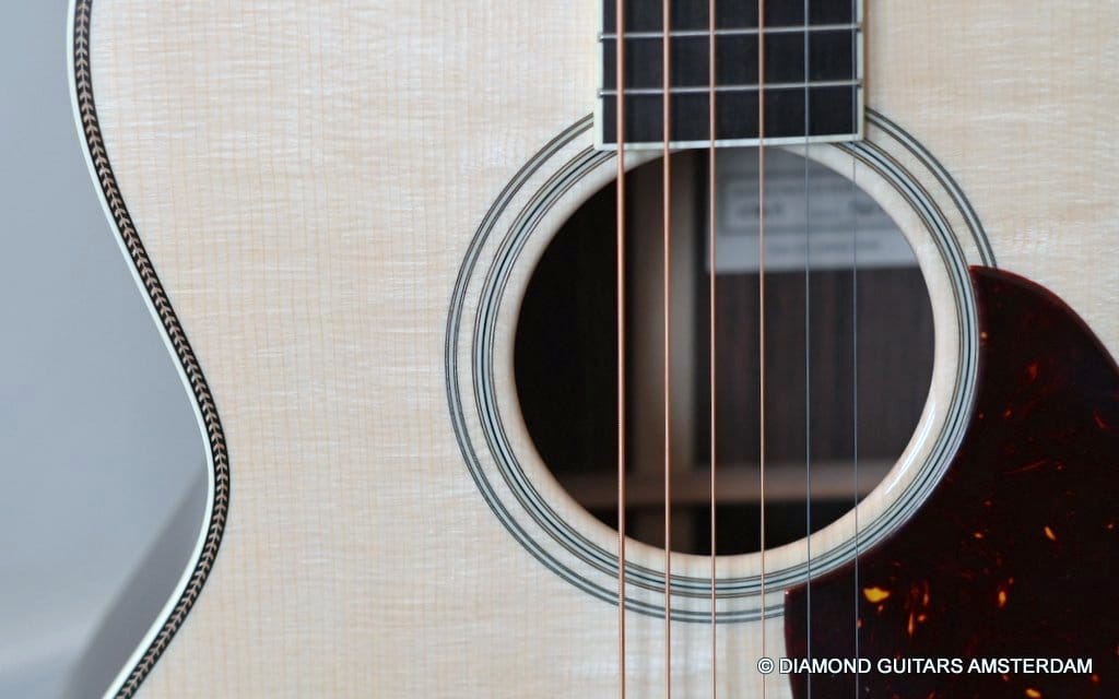 This Santa Cruz OM is build with the classic combination of master grade Adirondack Red Spruce and a beautiful set of East Indian Rosewood for the back and sides. The top is structured with the vintage-style “advanced” X-bracing build from Adirondack and constructed with Hot Hide Glue. The Mahogany neck has a slight V shape and terminates with a volute behind the headstock. It’s capped with an ivoroid bound fingerboard that has small Abalone dot inlays and black side markers. The guitar is adorned with a herringbone purfling back strip. An Ivoroid rosette surrounds the slightly smaller-than-normal 3 3/4-inch soundhole. Construction is predictably first-class, with quality materials everywhere. Top-notch tonal qualities put this babe where she belongs: the absolute top of the line! Listen to a sound impression here: