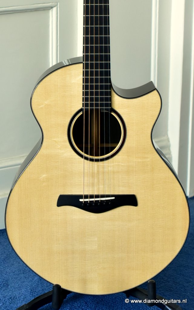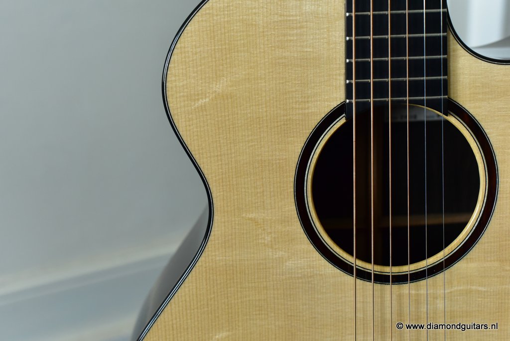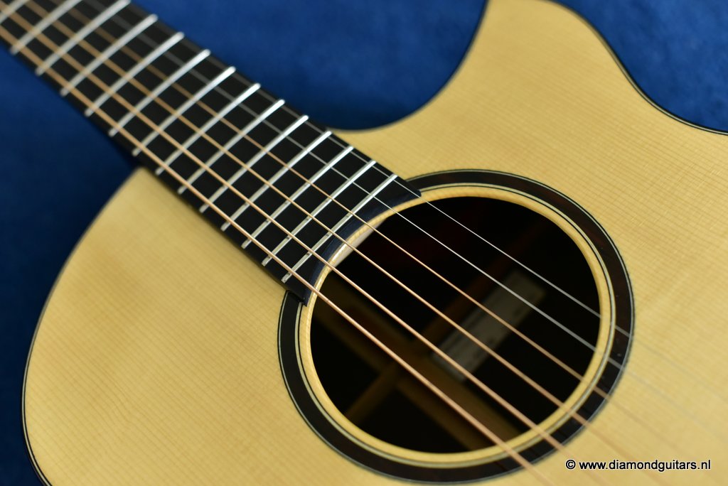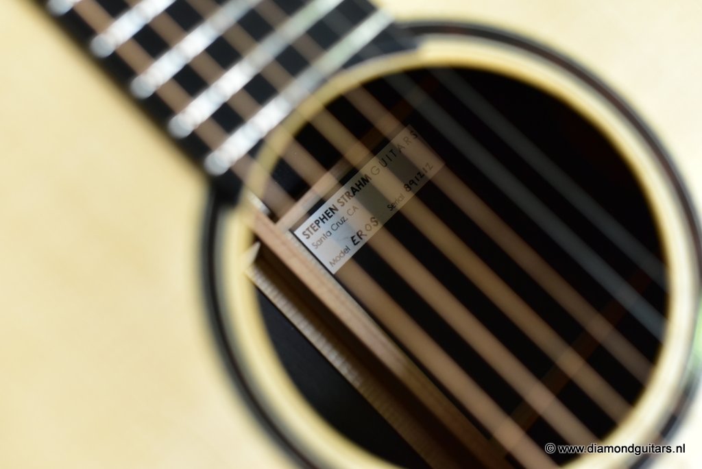 This awesome Stephen Strahm Eros model draws its inspiration from the classic Martin OM. Designed with a larger lower bout and narrow waist, she is very comfortable to play and sounds huge for a medium-sized guitar. One of the best balanced guitars I have ever heard. Piano like tone, wide open and responsive.
