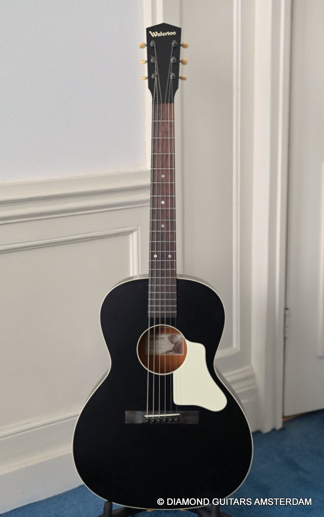 The Waterloo WL-14 is the flagship model of the Waterloo guitar line and the inspiration that started it all. Keeping true to the design and style of the era, this guitar has Ladder bracing.. Although ladder braced guitars are not as loud as x-braced guitars, this is an exception. Bill gave his best and made her loud and really responsive to the touch. The black suit with the white pickguard suits this little devil very well